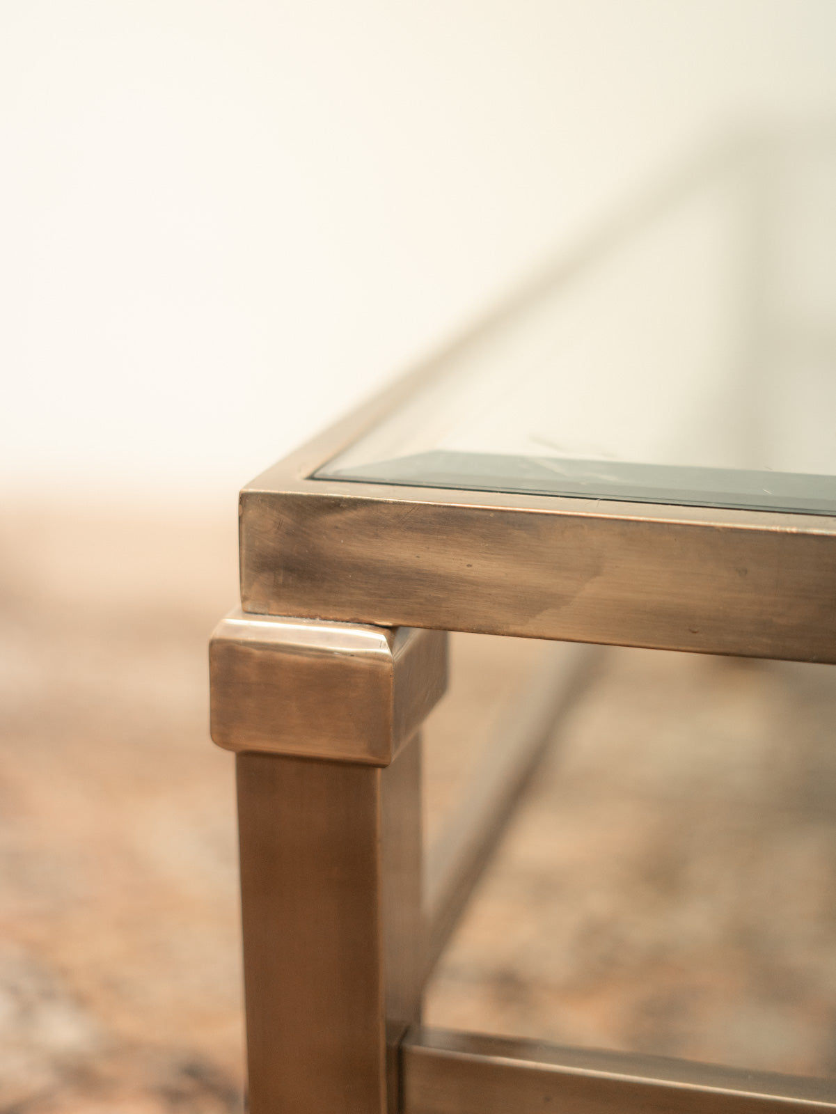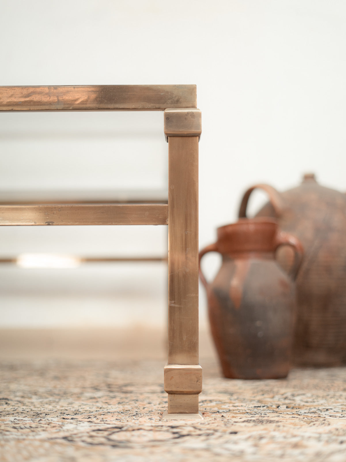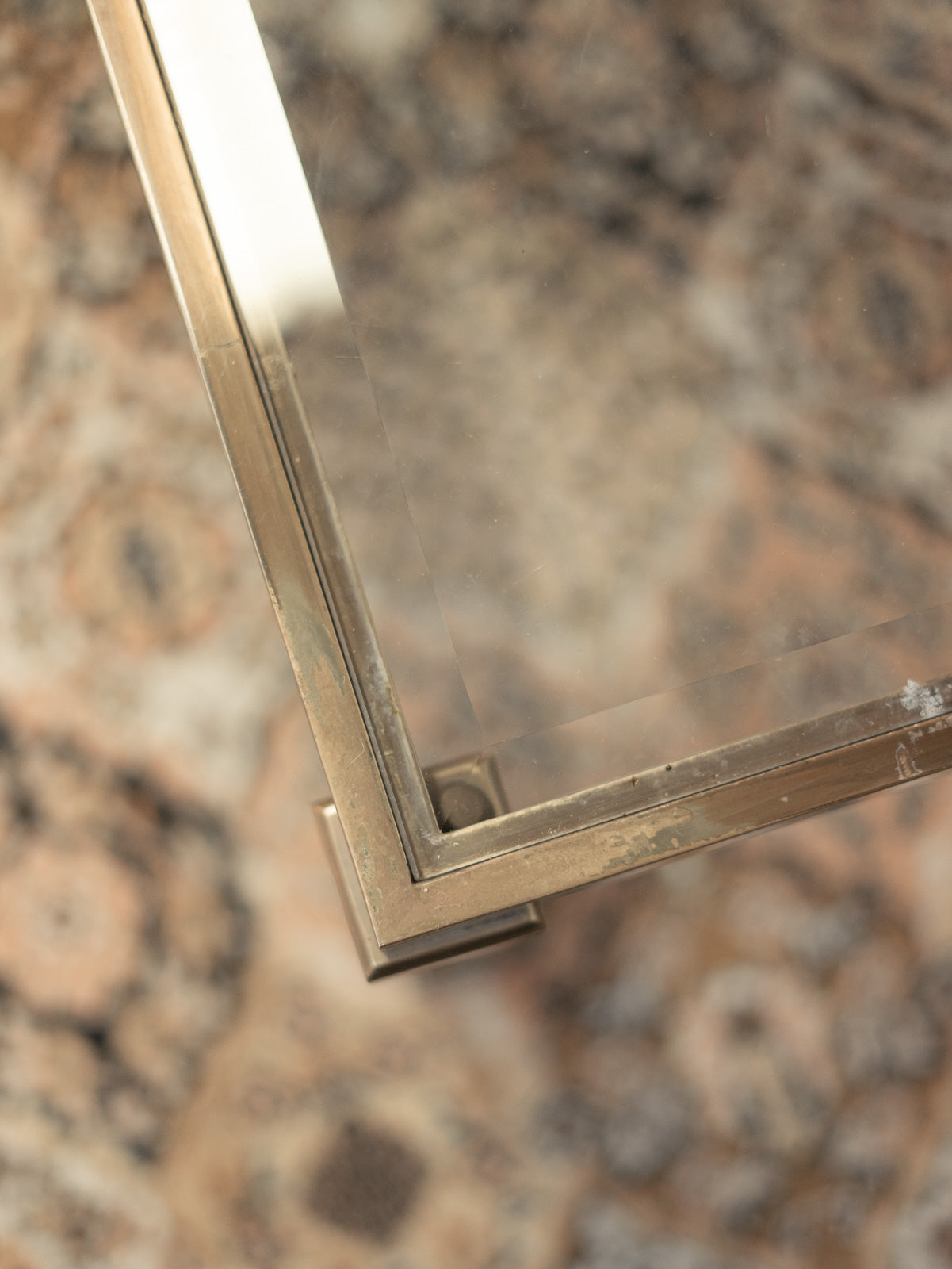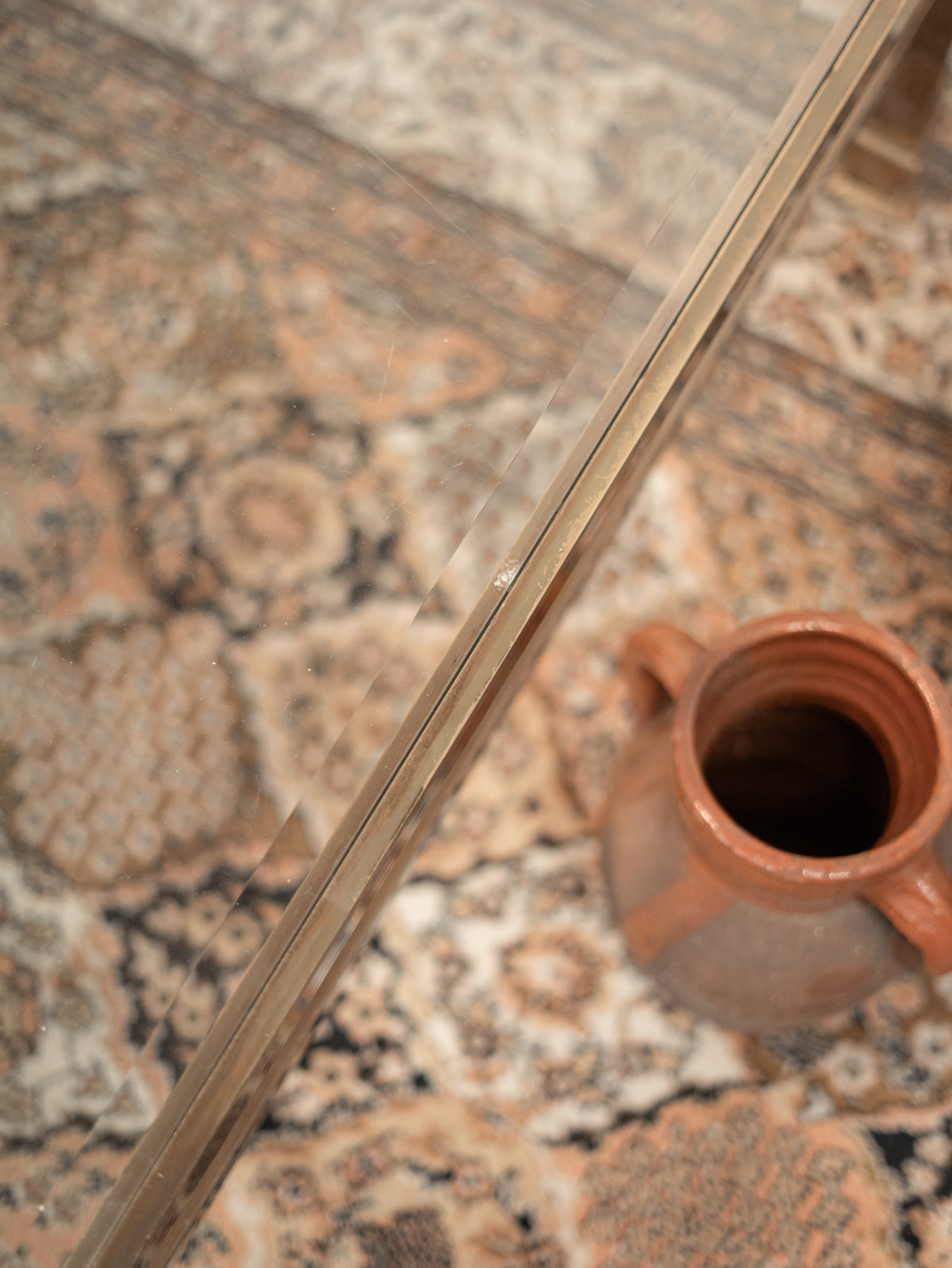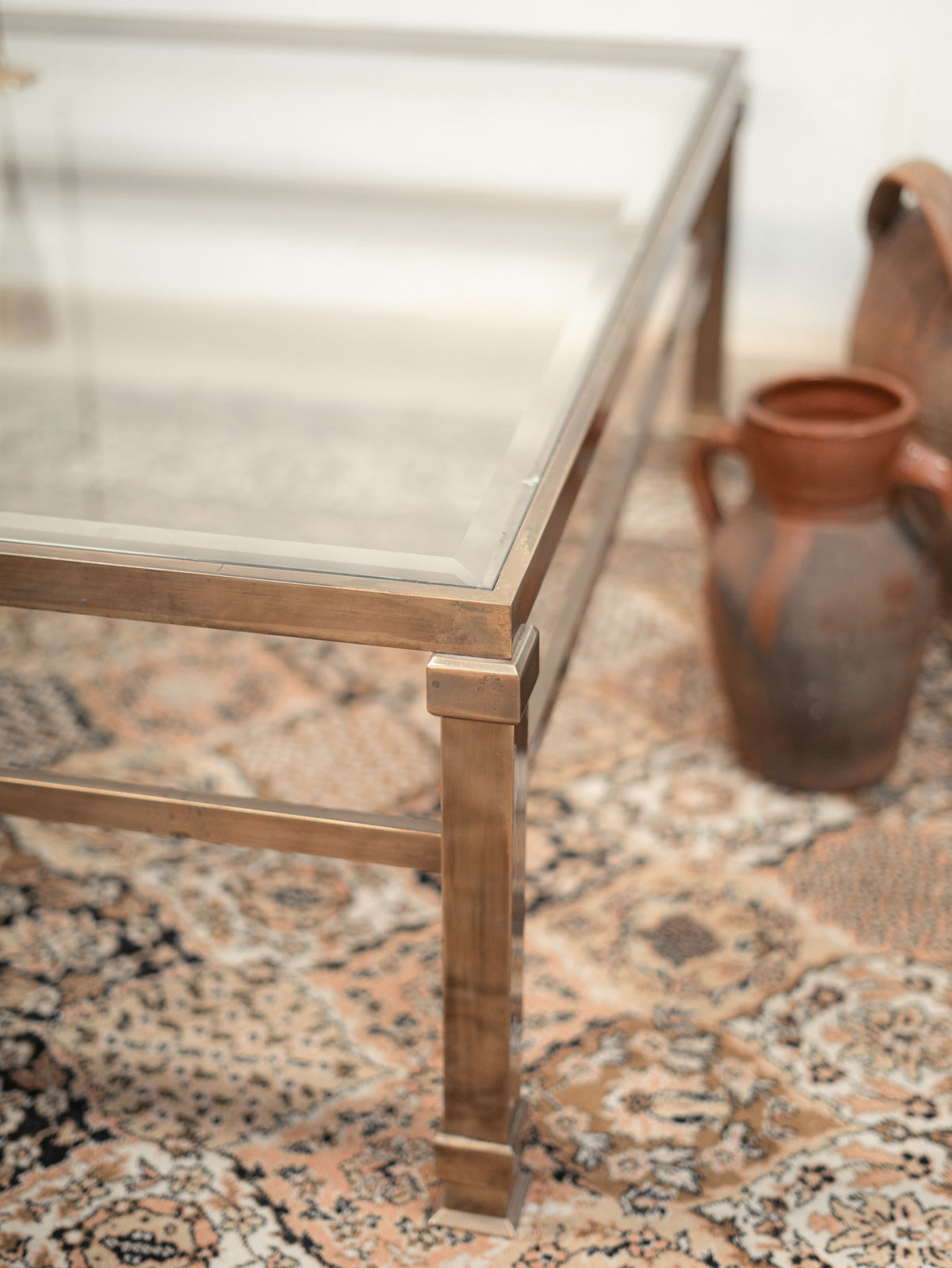 Ajoutez une touche d'élégance à votre intérieur avec cette table basse au piétement en laiton patiné. Son design intemporel associe le raffinement du laiton à la modernité du plateau en verre biseauté, créant ainsi un jeu de lumière captivant dans votre salon. Idéale pour sublimer votre décoration, cette pièce unique allie esthétisme et praticité, tout en offrant un espace parfait pour vos moments de convivialité. Un indispensable pour les amateurs de sophistication et de confort.