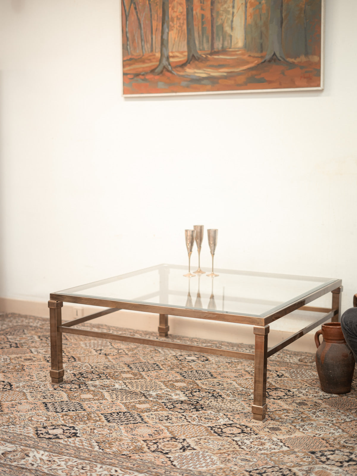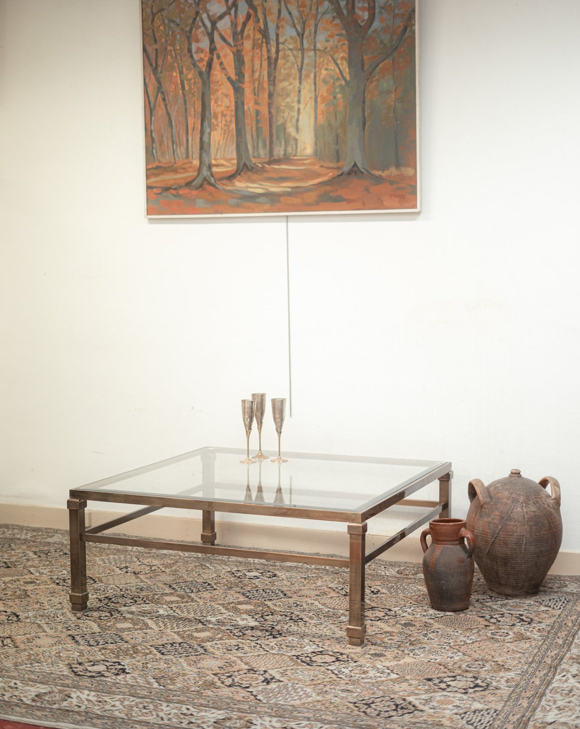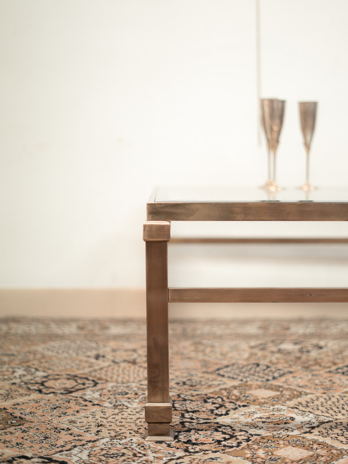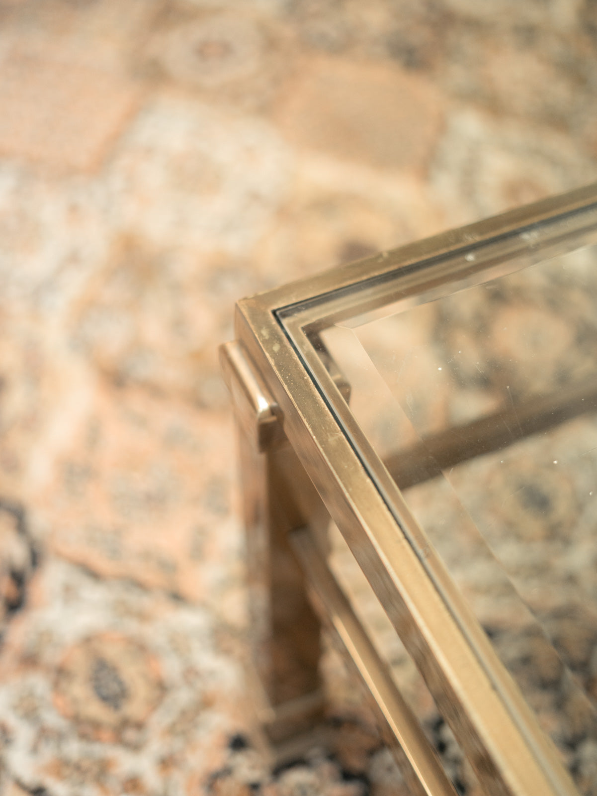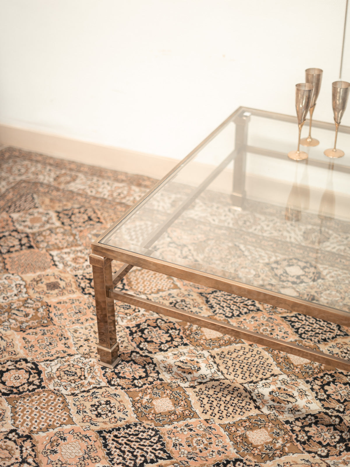 Ajoutez une touche d'élégance à votre intérieur avec cette table basse au piétement en laiton patiné. Son design intemporel associe le raffinement du laiton à la modernité du plateau en verre biseauté, créant ainsi un jeu de lumière captivant dans votre salon. Idéale pour sublimer votre décoration, cette pièce unique allie esthétisme et praticité, tout en offrant un espace parfait pour vos moments de convivialité. Un indispensable pour les amateurs de sophistication et de confort.