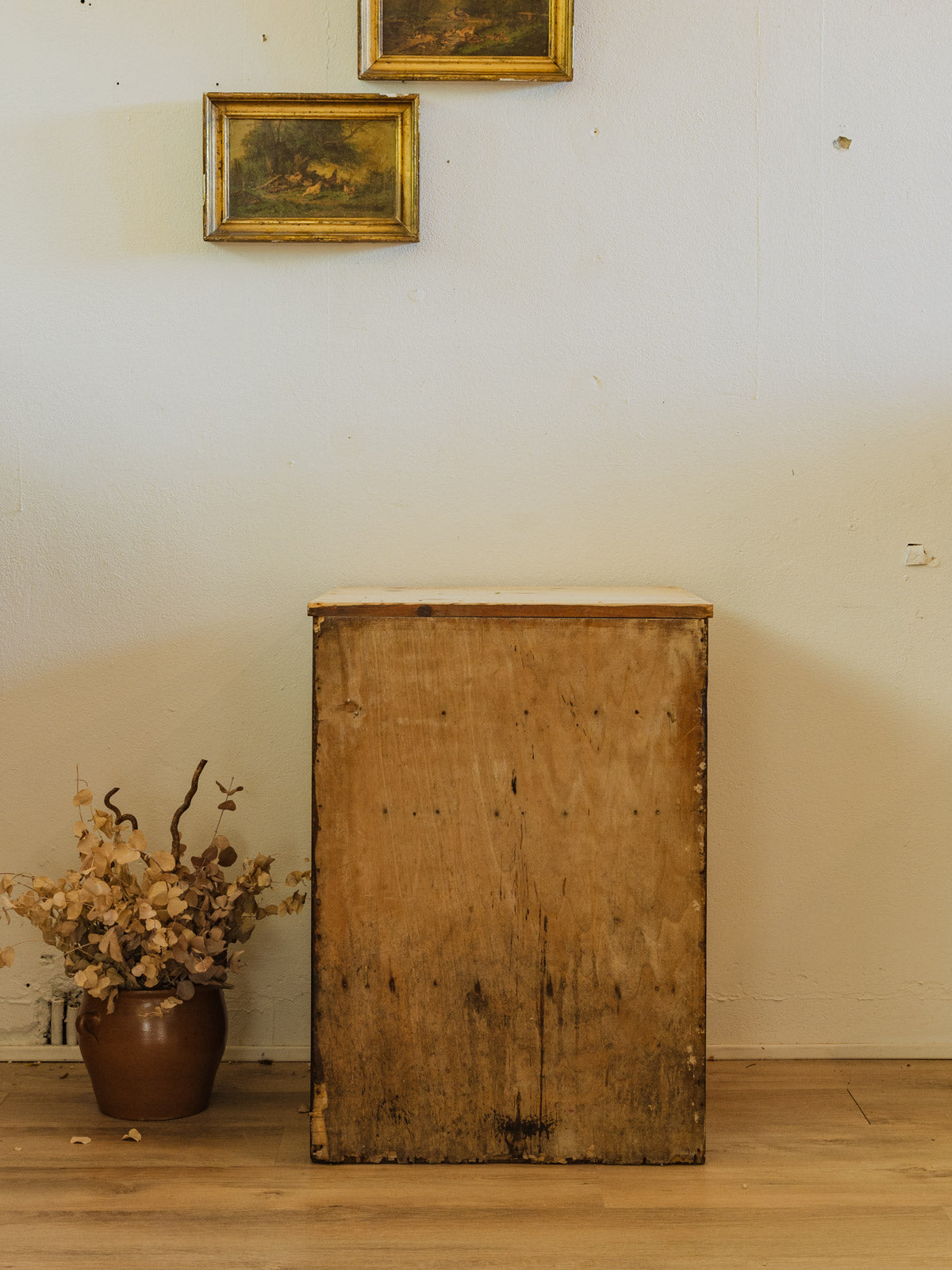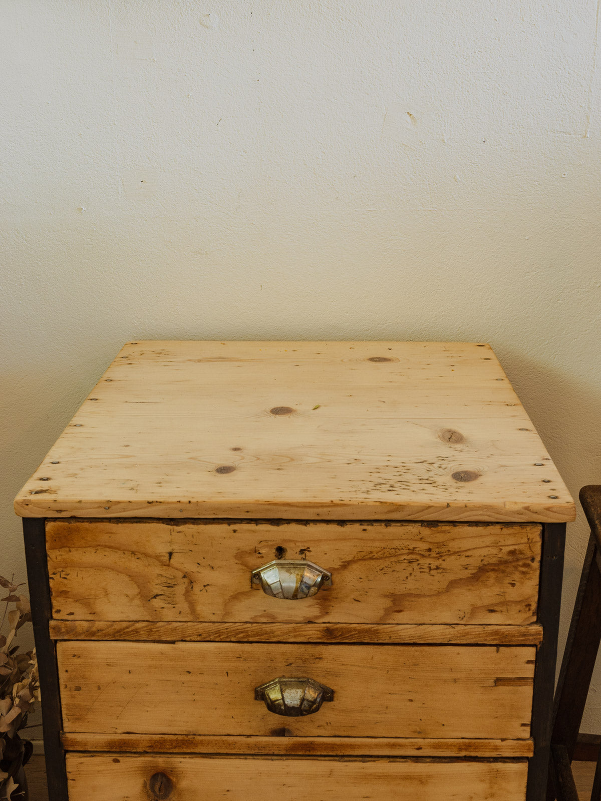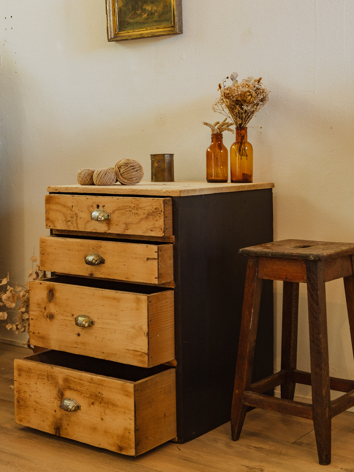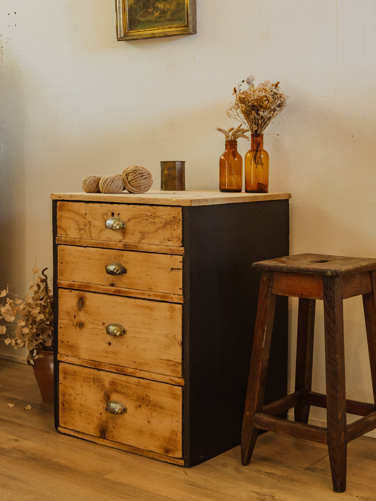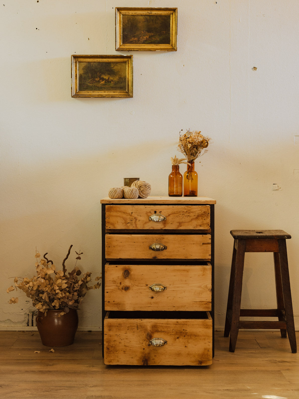Découvrez cet ancien meuble de rangement d'atelier en pin, idéal pour apporter une touche d'authenticité à votre intérieur. Doté de quatre tiroirs spacieux, il offre un généreux espace de stockage tout en conservant son charme vintage avec ses taches d'usage qui racontent une histoire. Parfait pour une entrée, un bureau ou une cuisine, ce meuble allie fonctionnalité et esthétique rustique. Offrez-lui une seconde vie dans votre décor et laissez-le sublimer vos objets du quotidien.