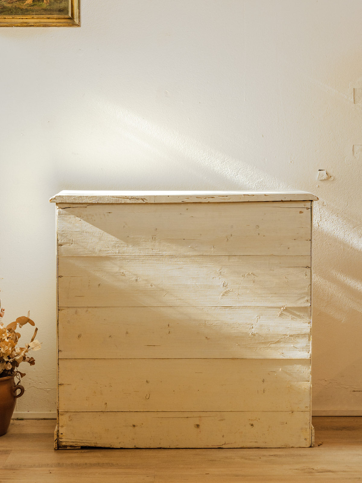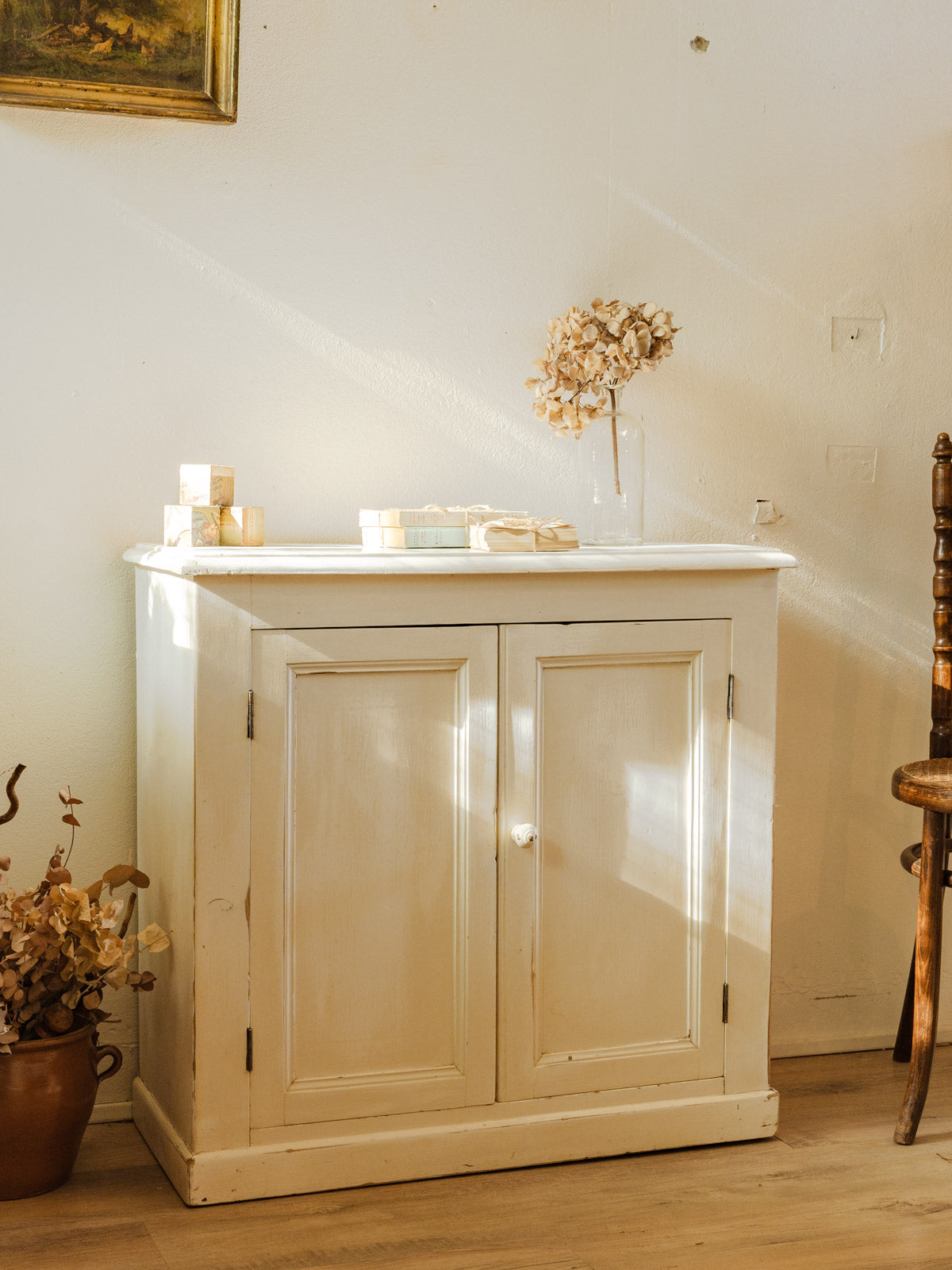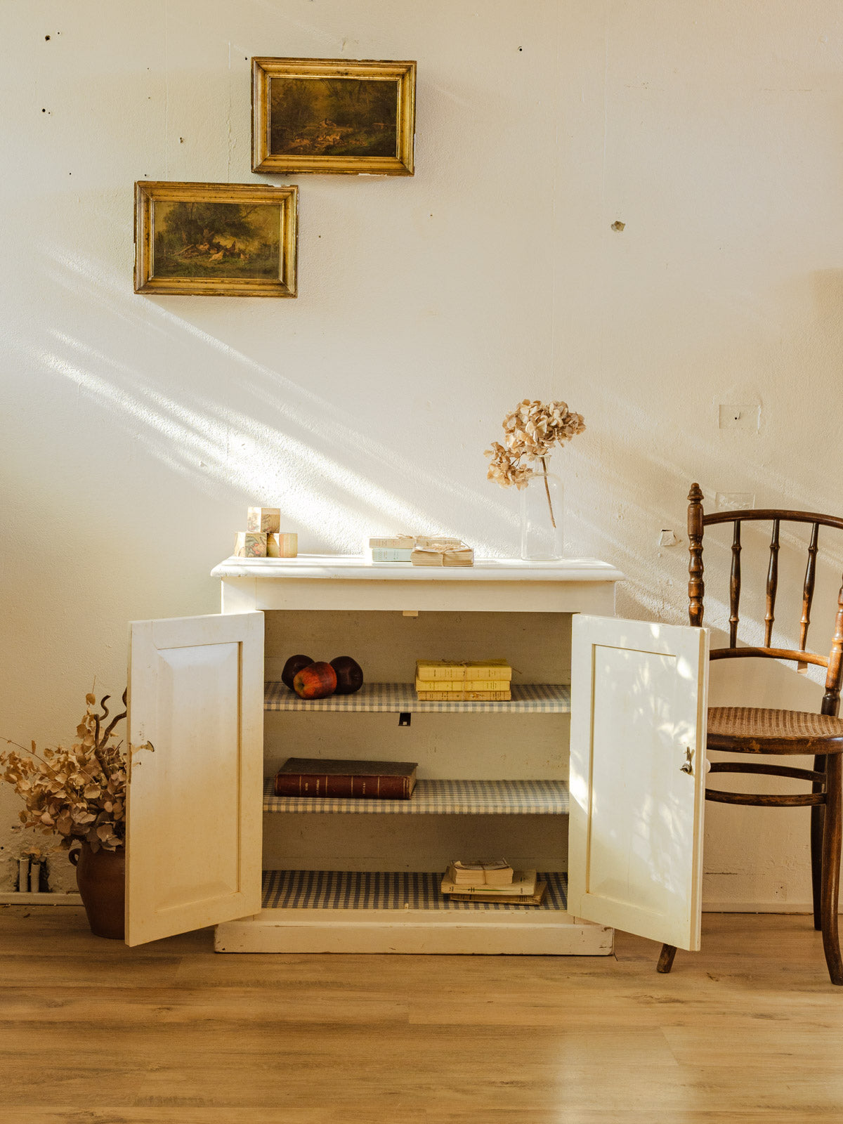 Découvrez ce magnifique buffet ancien, sublimé par un élégant blanc patiné qui apportera une touche vintage à votre intérieur. Doté de deux portes et de deux étagères, il offre un espace de rangement pratique tout en mettant en valeur son charme intemporel. Les trois niveaux sont recouverts d'un tissu à carreaux bleu et blanc, délicatement déteint par le temps, ajoutant une patine unique à chaque pièce. quelqes traces d'usage qui n'enlèvent rien à son charme. Ce buffet est idéal pour allier esthétique et fonctionnalité dans votre décoration.