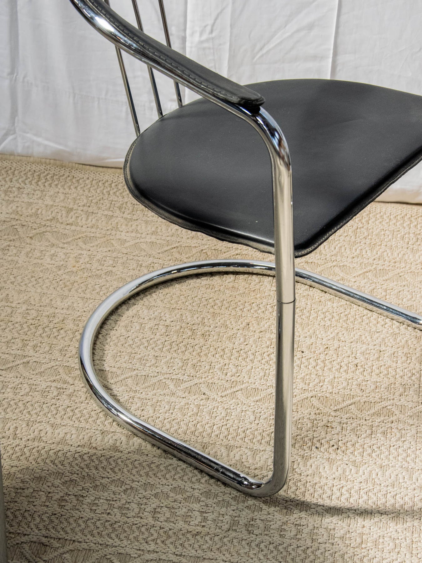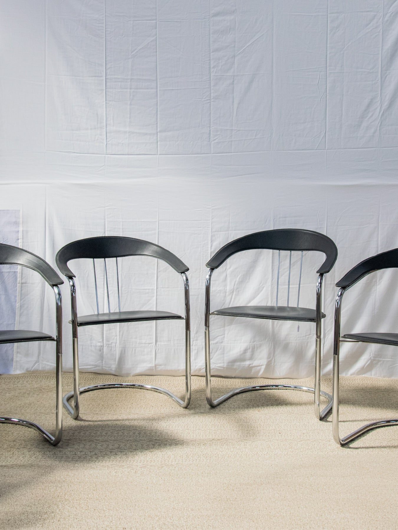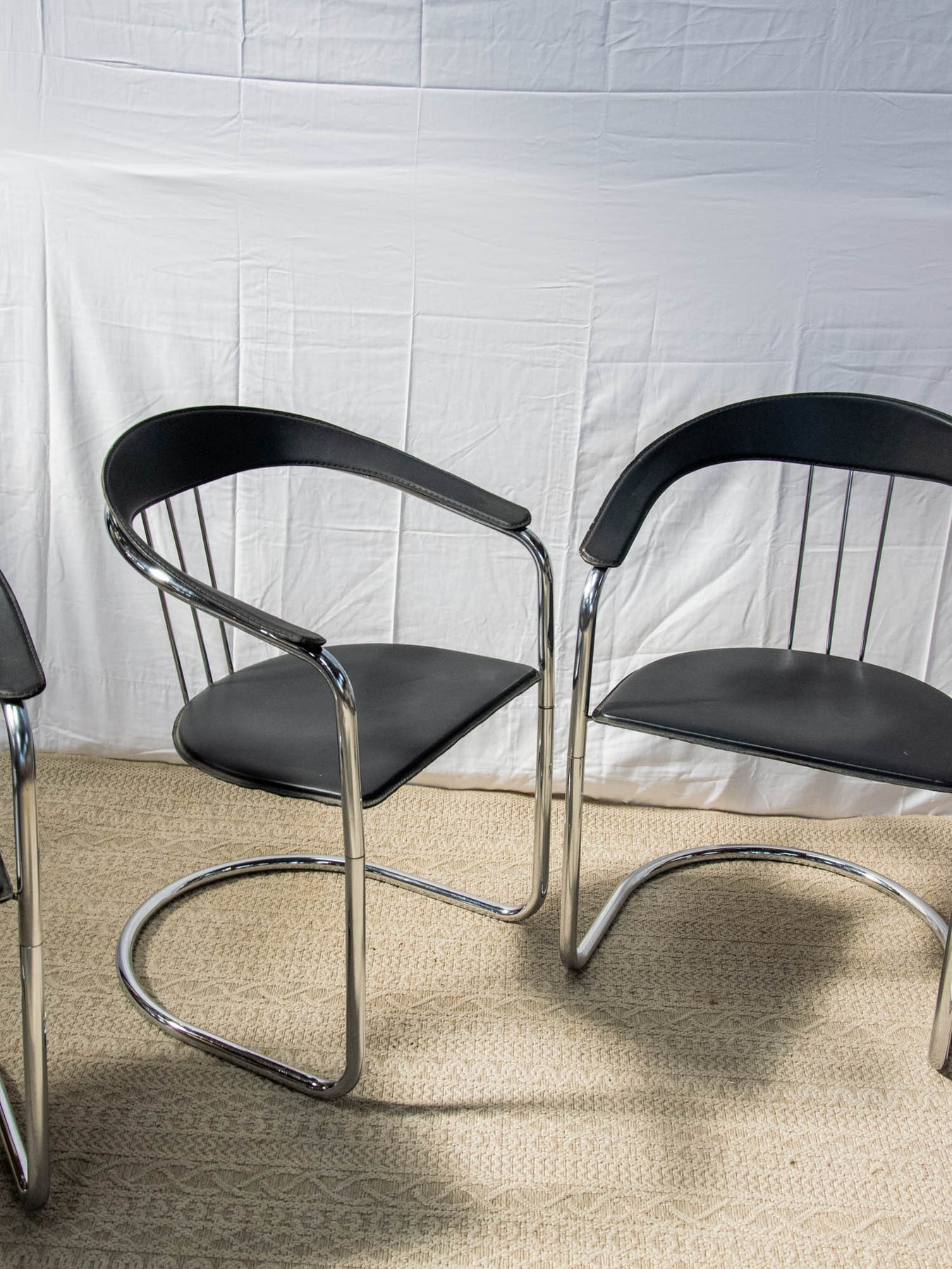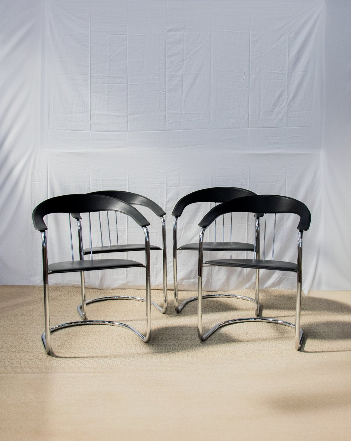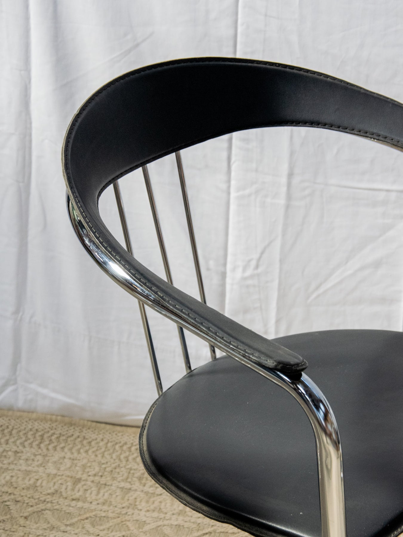 Apportez une touche d'élégance à votre intérieur avec ce lot de 4 chaises/fauteuils de table en skai noir. Leur structure tubulaire en métal assure une robustesse et une stabilité optimales, tandis que le dossier délicatement orné de barres fines en métal offre un soutien ergonomique tout en ajoutant une note moderne à votre décoration. Idéales pour un repas convivial ou une ambiance lounge, ces chaises allient confort et style avec brio.