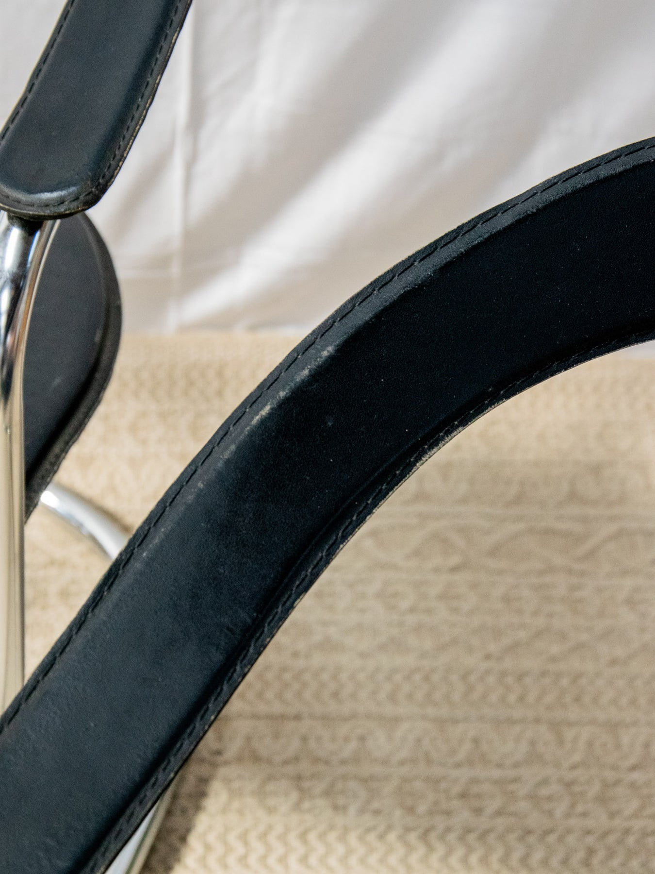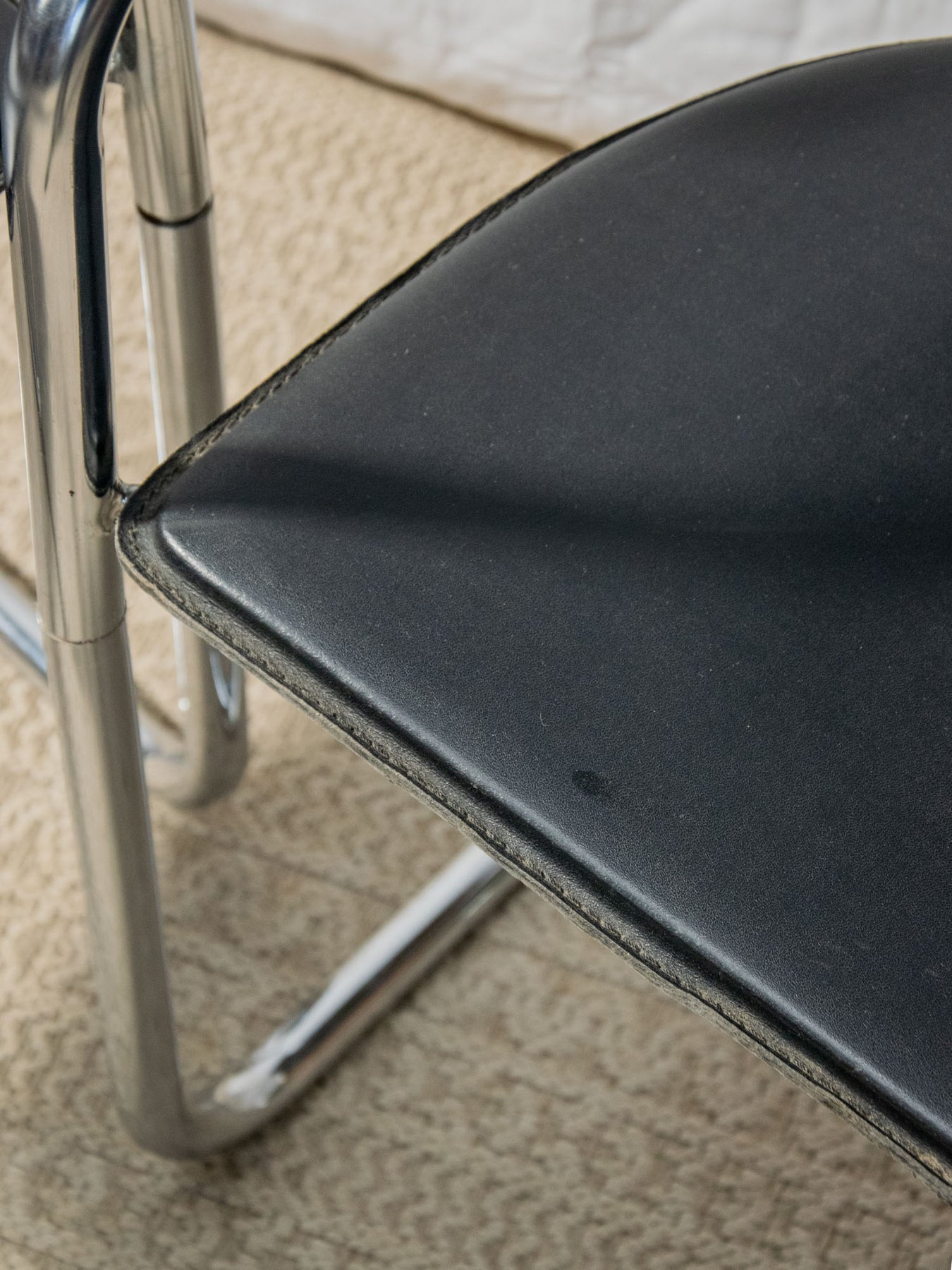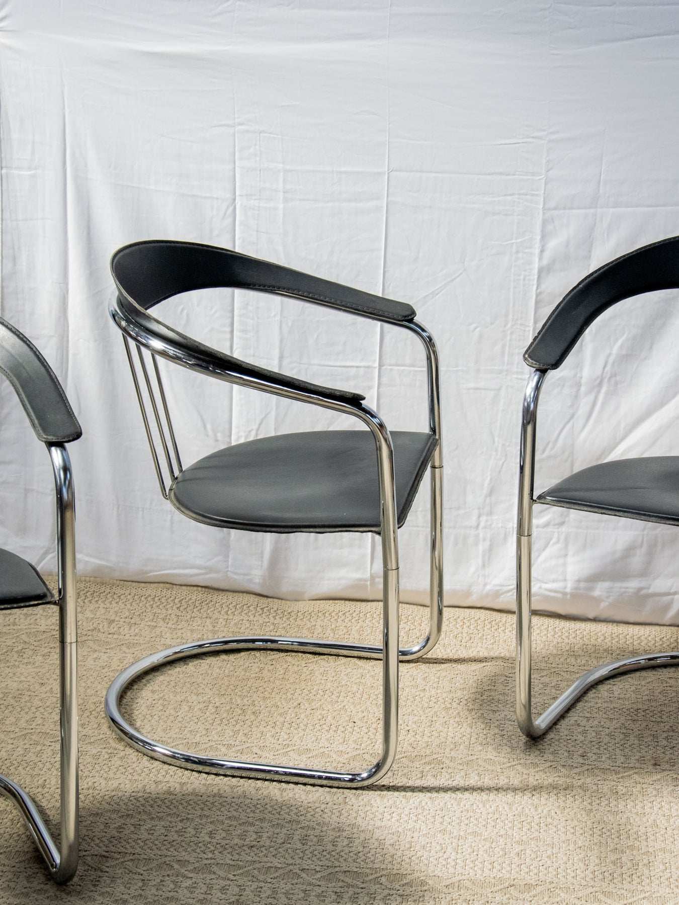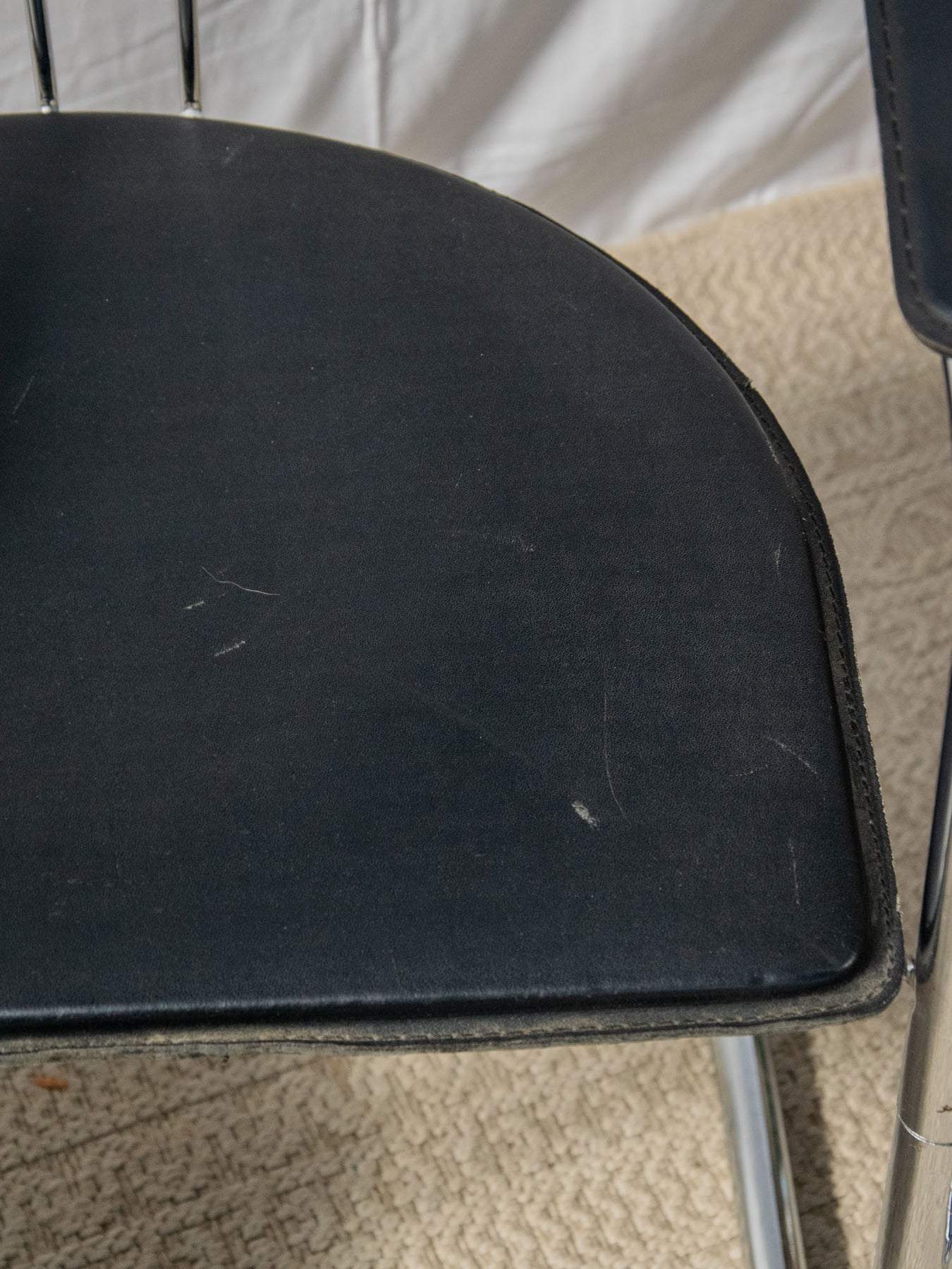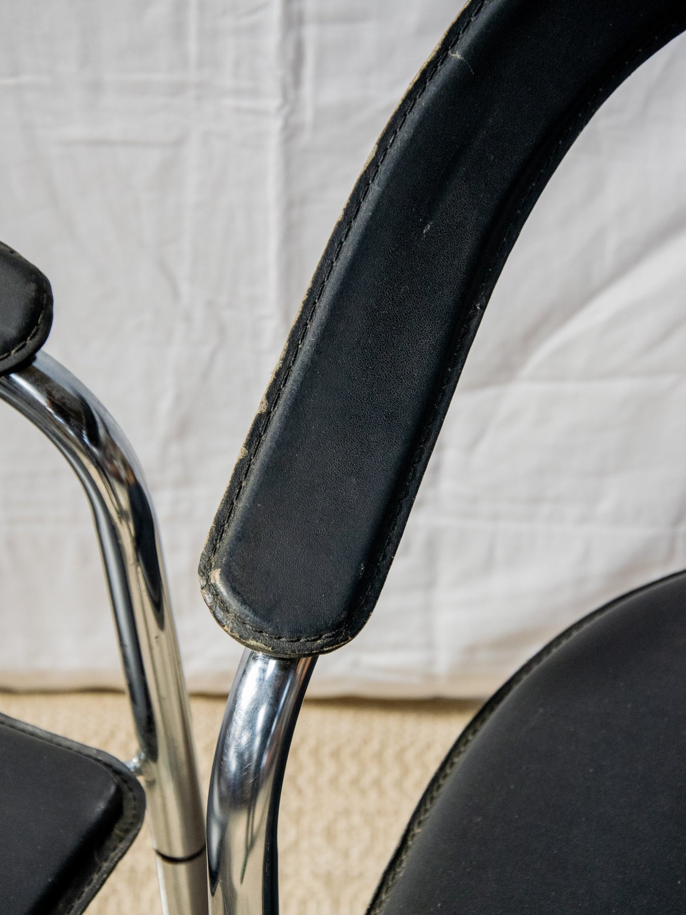 Apportez une touche d'élégance à votre intérieur avec ce lot de 4 chaises/fauteuils de table en skai noir. Leur structure tubulaire en métal assure une robustesse et une stabilité optimales, tandis que le dossier délicatement orné de barres fines en métal offre un soutien ergonomique tout en ajoutant une note moderne à votre décoration. Idéales pour un repas convivial ou une ambiance lounge, ces chaises allient confort et style avec brio.