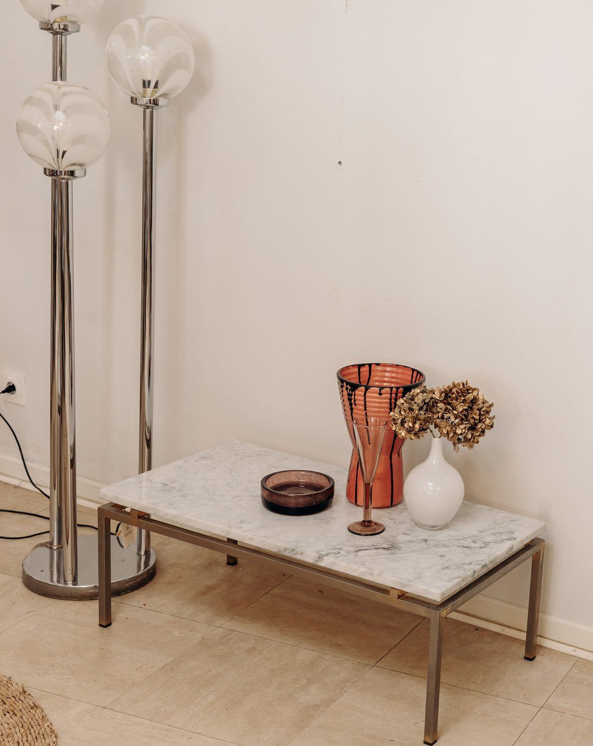 Découvrez cette élégante table basse rectangulaire vintage en marbre et laiton, inspirée des créations emblématiques de Florence Knoll pour les Éditions Knoll dans les années 1970. Son plateau en marbre, bien que marqué par quelques légères rayures et des coins légèrement abîmés, témoigne du temps et de l'authenticité de la pièce. Cette table, avec son piétement carré en laiton, s'intégrera parfaitement dans un intérieur haussmannien, mettant en valeur la blancheur éclatante du marbre et le charme des parquets anciens. Offrez à votre salon une touche d'élégance intemporelle avec cette belle pièce au caractère unique.
