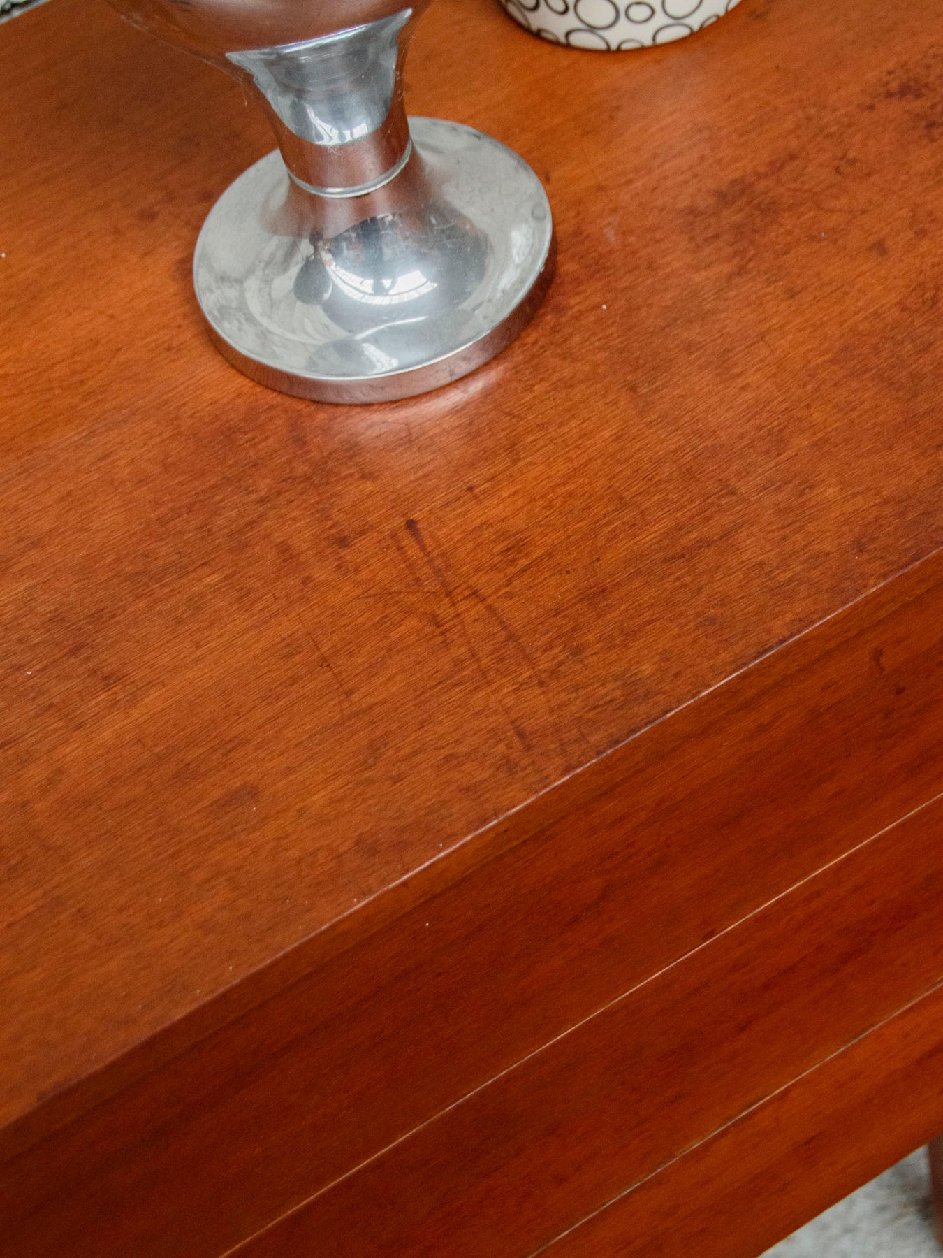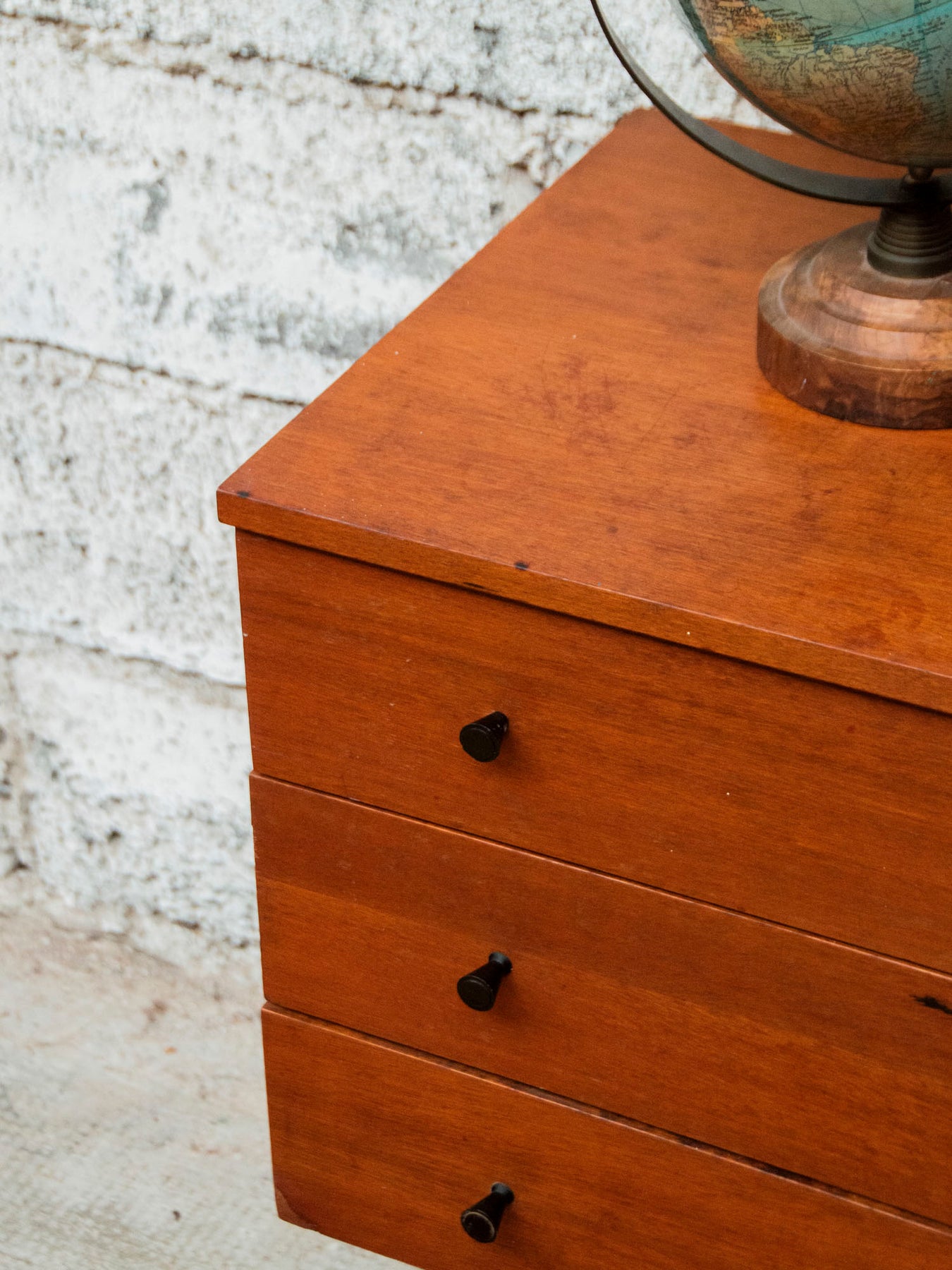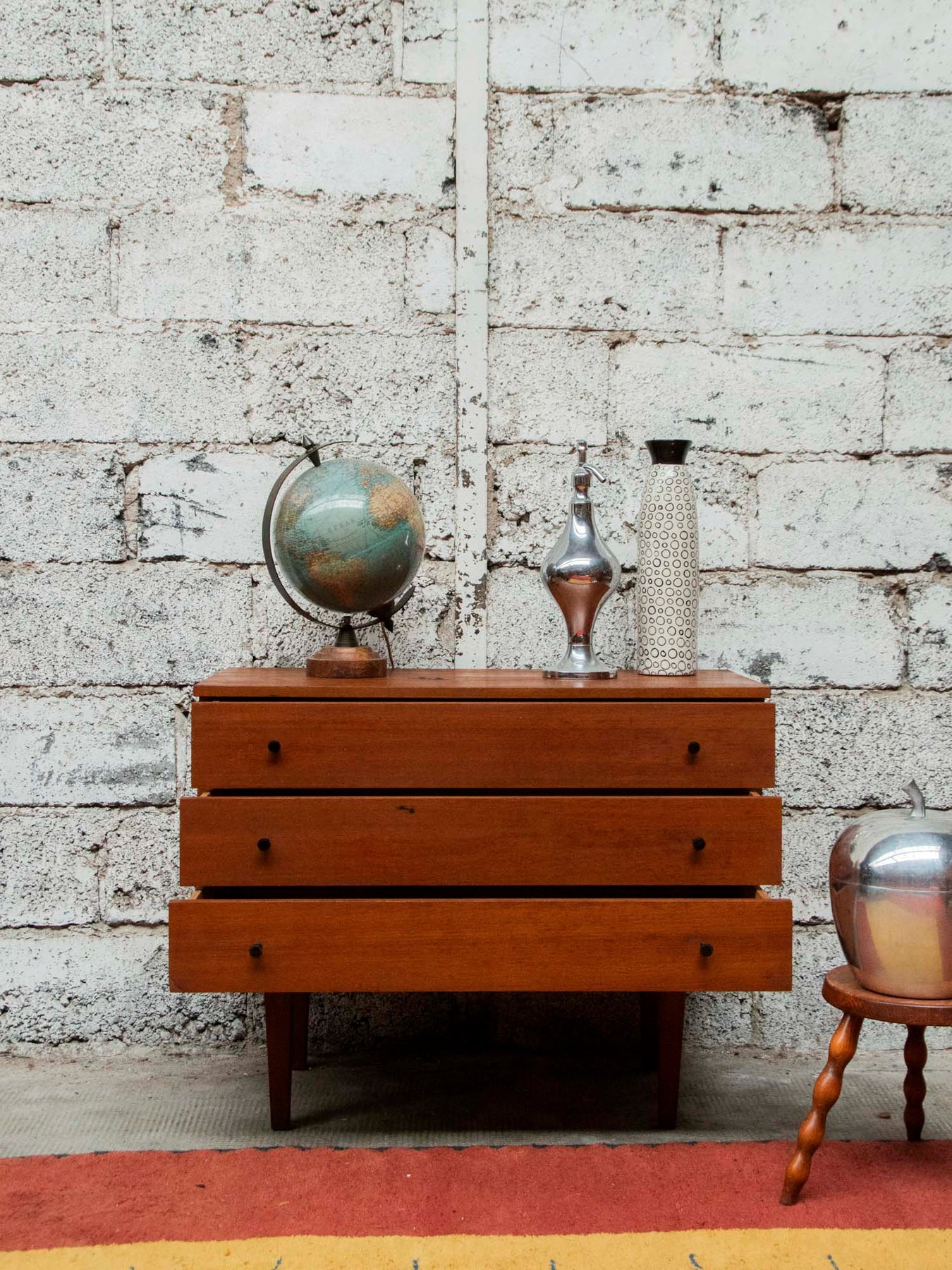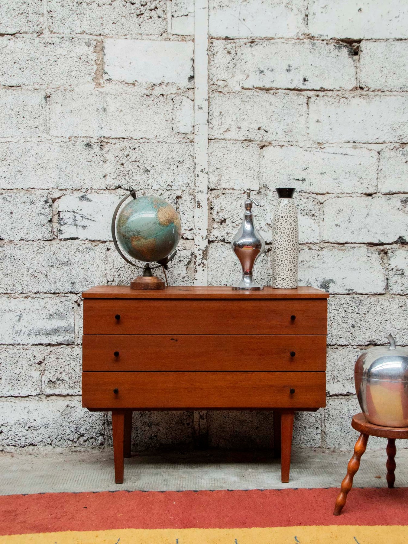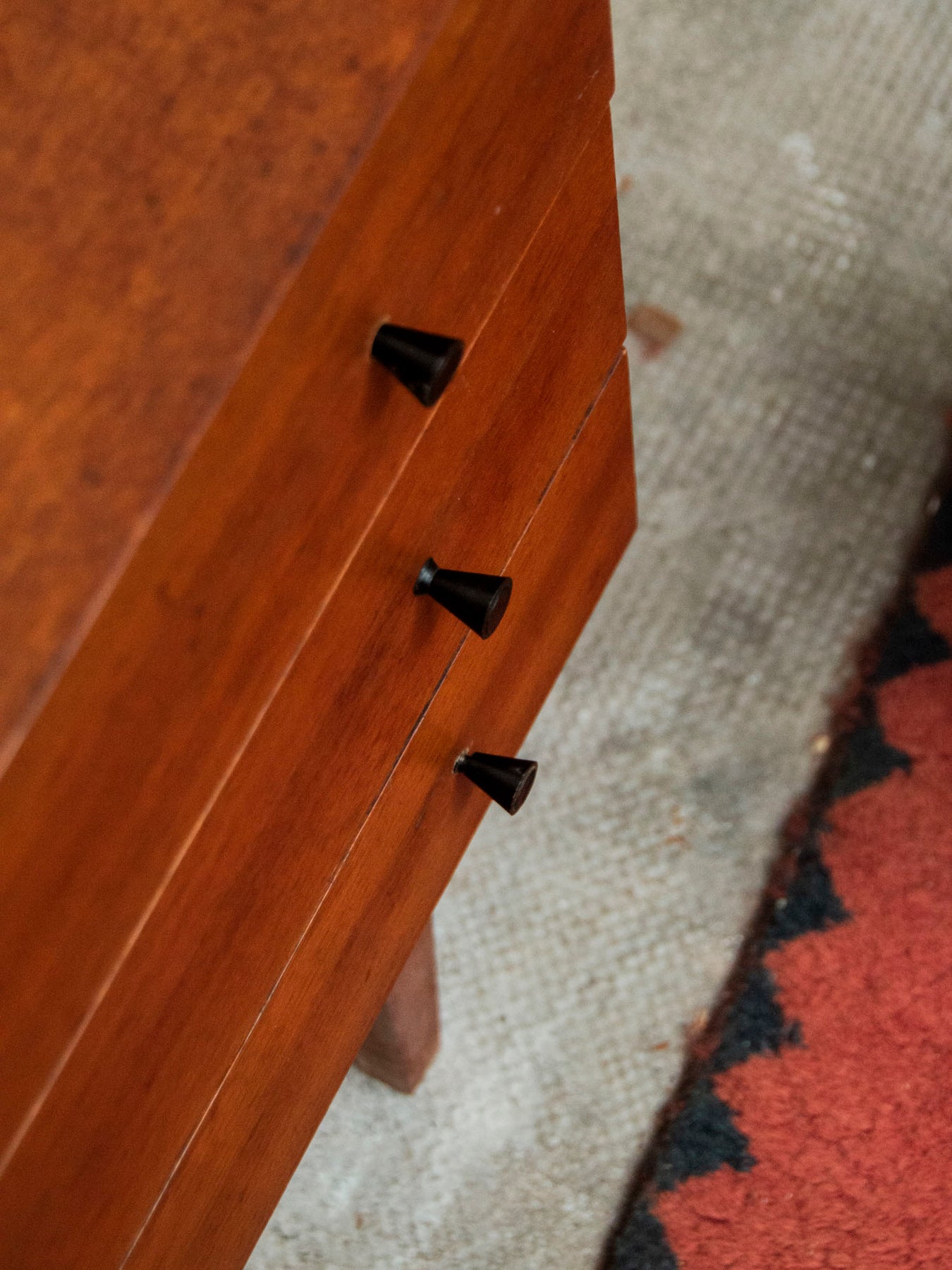 Découvrez notre ravissante petite commode en teck, aux lignes épurées et modernes. Dotée de trois tiroirs pratiques, elle s'élève sur de hauts pieds qui lui confèrent une allure aérienne. Son bois orangé réchauffe votre intérieur, tandis que les petites poignées noires ajoutent une touche contemporaine. Le plateau, agrémenté d'une finition noire, contraste élégamment avec le reste de la commode, en faisant un meuble à la fois fonctionnel et esthétique. Parfaite pour optimiser le rangement tout en embellissant votre décor.