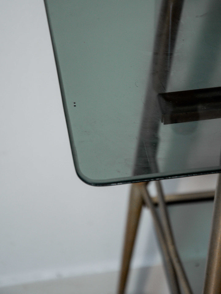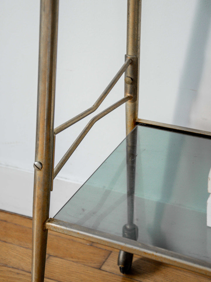 Découvrez cette desserte ancienne au style vintage, alliant élégance et praticité. Sa structure en métal accueille deux plateaux en verre noir transparent, parfaits pour exposer ou servir. Facile à déplacer grâce à ses quatre roulettes, elle s’adapte à tous les espaces. Quelques marques du temps ajoutent à son authenticité. Un meuble fonctionnel au charme rétro assumé.