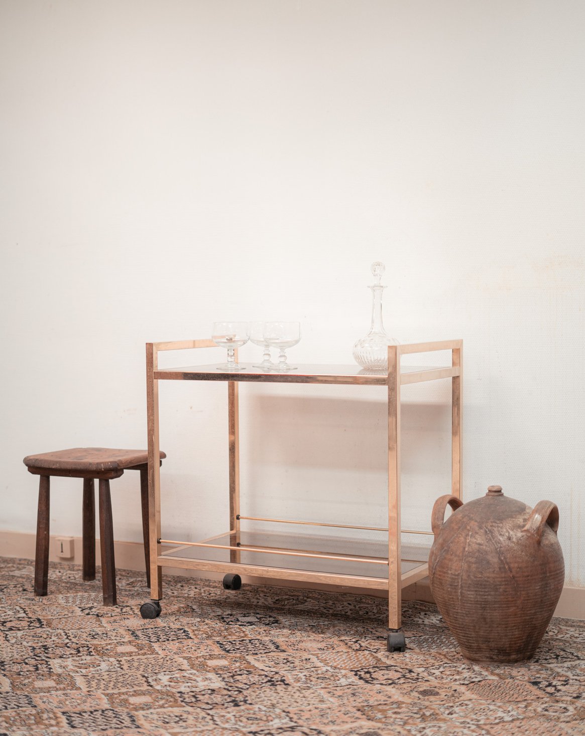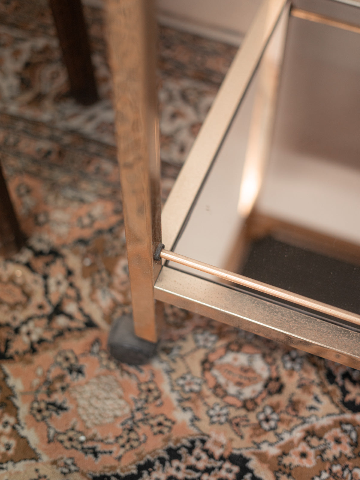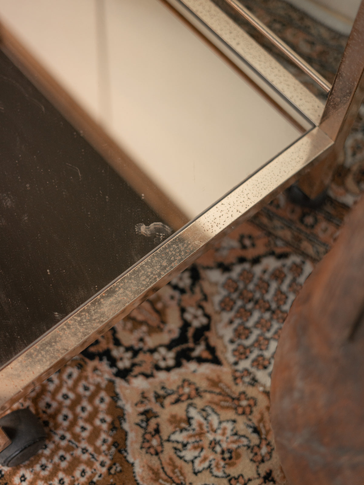 Ajoutez une touche d'élégance à votre intérieur avec cette desserte dorée sur roulettes. Dotée d'une tablette spacieuse et d'un plateau miroir, elle est idéale pour servir vos boissons ou exposer vos objets décoratifs. Pratique et mobile, elle s'adapte à tous les espaces, apportant un style raffiné à votre maison. Transformez chaque moment en une occasion spéciale avec ce meuble chic et fonctionnel. Le piquage léger du métal n'enlève rien à son charme, ni à son utilité.