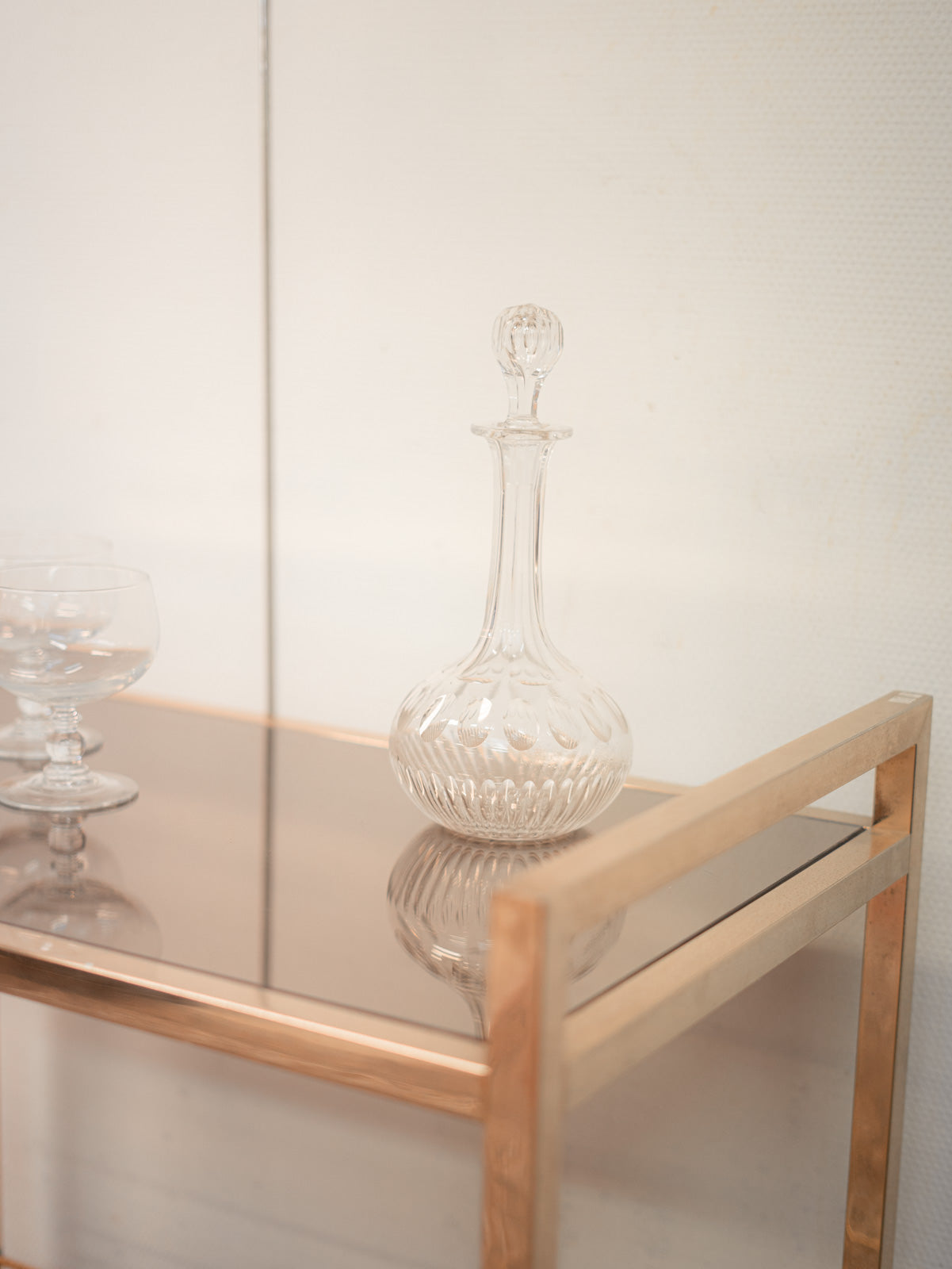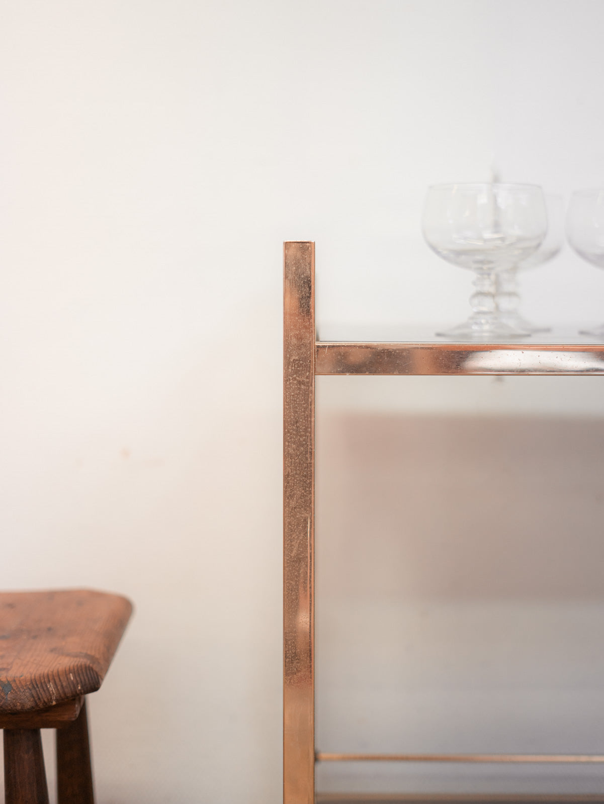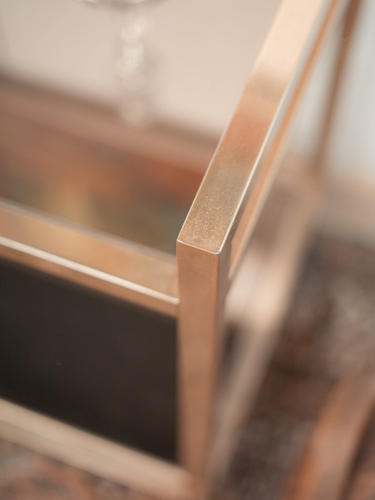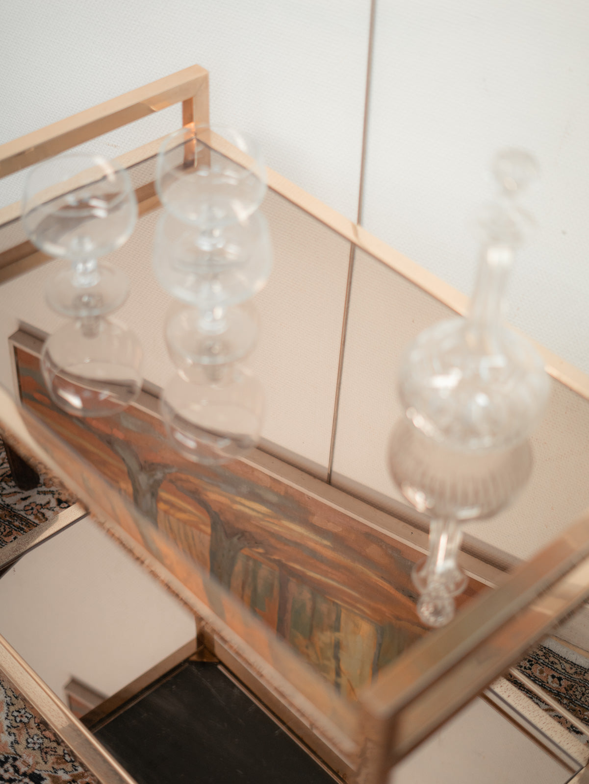 Ajoutez une touche d'élégance à votre intérieur avec cette desserte dorée sur roulettes. Dotée d'une tablette spacieuse et d'un plateau miroir, elle est idéale pour servir vos boissons ou exposer vos objets décoratifs. Pratique et mobile, elle s'adapte à tous les espaces, apportant un style raffiné à votre maison. Transformez chaque moment en une occasion spéciale avec ce meuble chic et fonctionnel. Le piquage léger du métal n'enlève rien à son charme, ni à son utilité.
