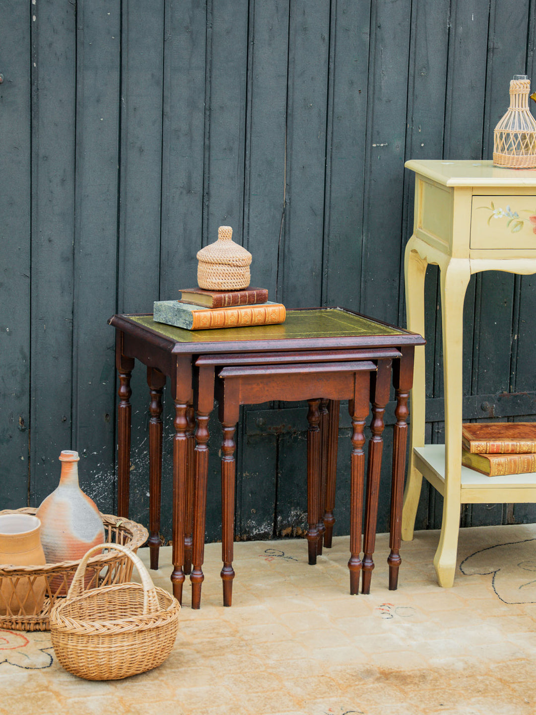 Découvrez cet ensemble de trois tables gigognes en bois au charme classique. Chaque table carrée est dotée d’un plateau en simili-cuir, décoré d’un élégant motif doré. Les pieds sont finement travaillés, apportant du relief à l’ensemble. Le plateau en verre de la plus grande table est manquant, mais cela n’enlève rien à son potentiel décoratif. Idéales pour moduler l’espace avec style et fonctionnalité.