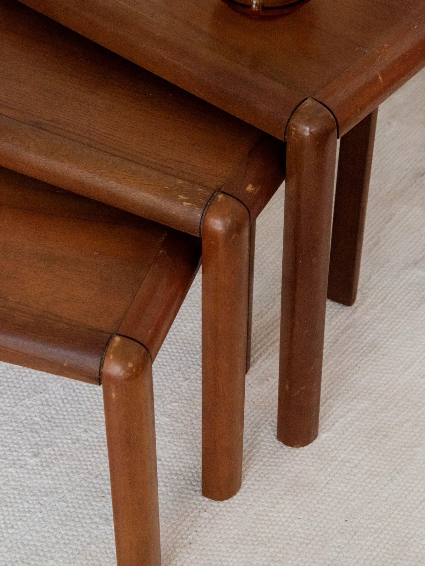 Découvrez ce trio de tables gigognes en placage vintage des années 70, alliant légèreté et résistance. Leur design massif et élégant, sublimé par une couleur chaleureuse, apporte une touche rétro à tout intérieur. Polyvalentes, ces tables peuvent servir de tables basses, de bouts de canapé ou même de chevets. En bon état général, elles présentent quelques traces d'usure qui témoignent de leur histoire et de leur charme. Apportez une note vintage à votre décoration avec ce charmant ensemble !