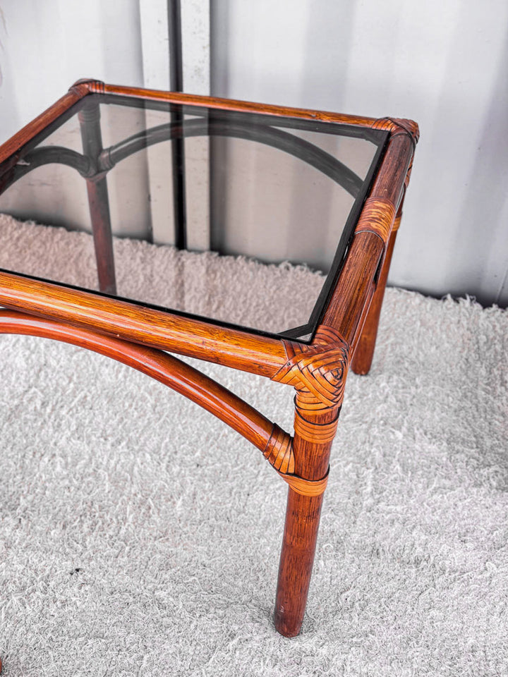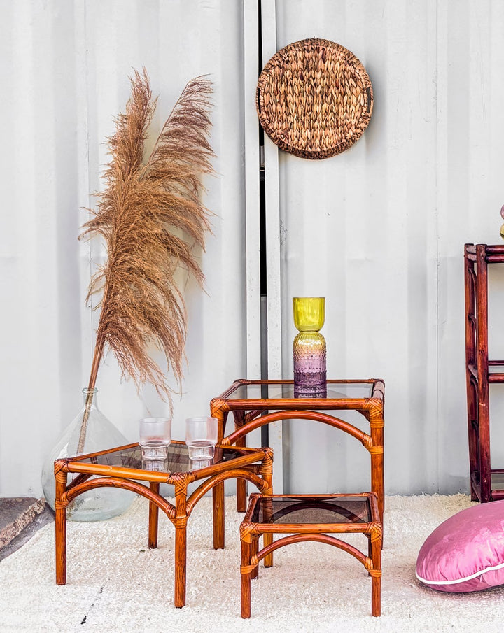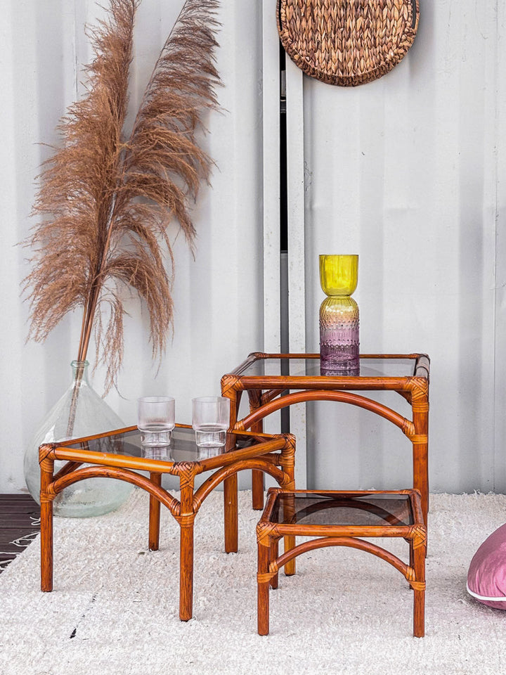 Apportez une touche rétro à votre intérieur avec cet ensemble de 3 tables gigognes en rotin au charme vintage. Chaque table, avec ses plateaux en verre fumé, allie élégance et praticité, vous permettant de les disposer selon vos envies. Les dimensions variées en font des alliées idéales pour optimiser votre espace. Un choix parfait pour une décoration à la fois chic et fonctionnelle.