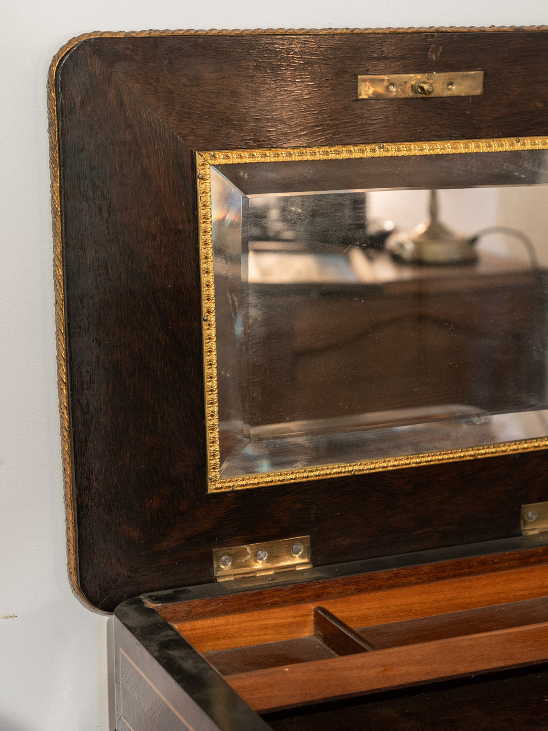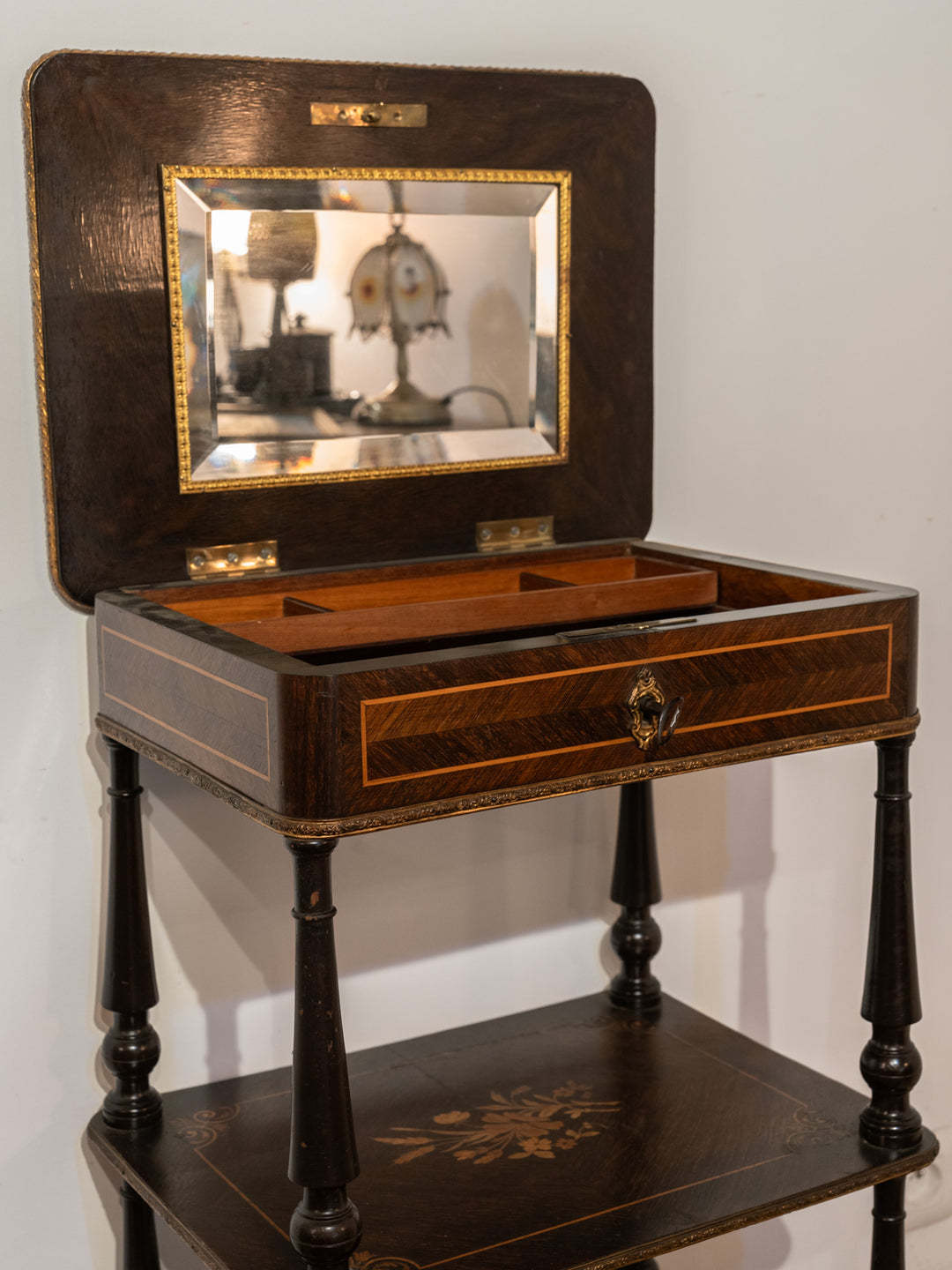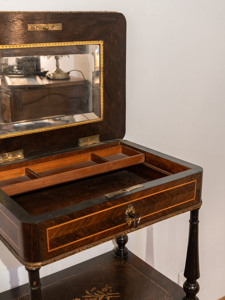 Découvrez notre magnifique travailleuse Napoléon III, un véritable bijou d'ébénisterie. Avec son dessus en marqueterie délicate et son élégant décor en bronze, elle allie esthétique et fonctionnalité. Le plateau, astucieusement conçu, se lève pour révéler un miroir intérieur, parfait pour les retouches quotidiennes. Son intérieur compartimenté est idéal pour organiser vos accessoires avec style. Un incontournable pour les amateurs de mobilier raffiné.