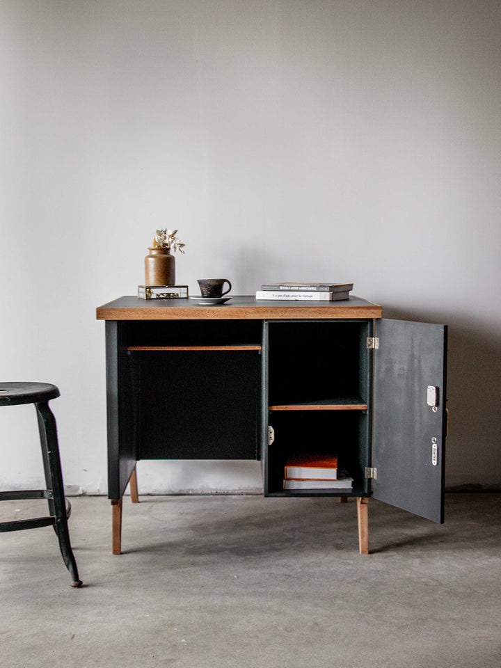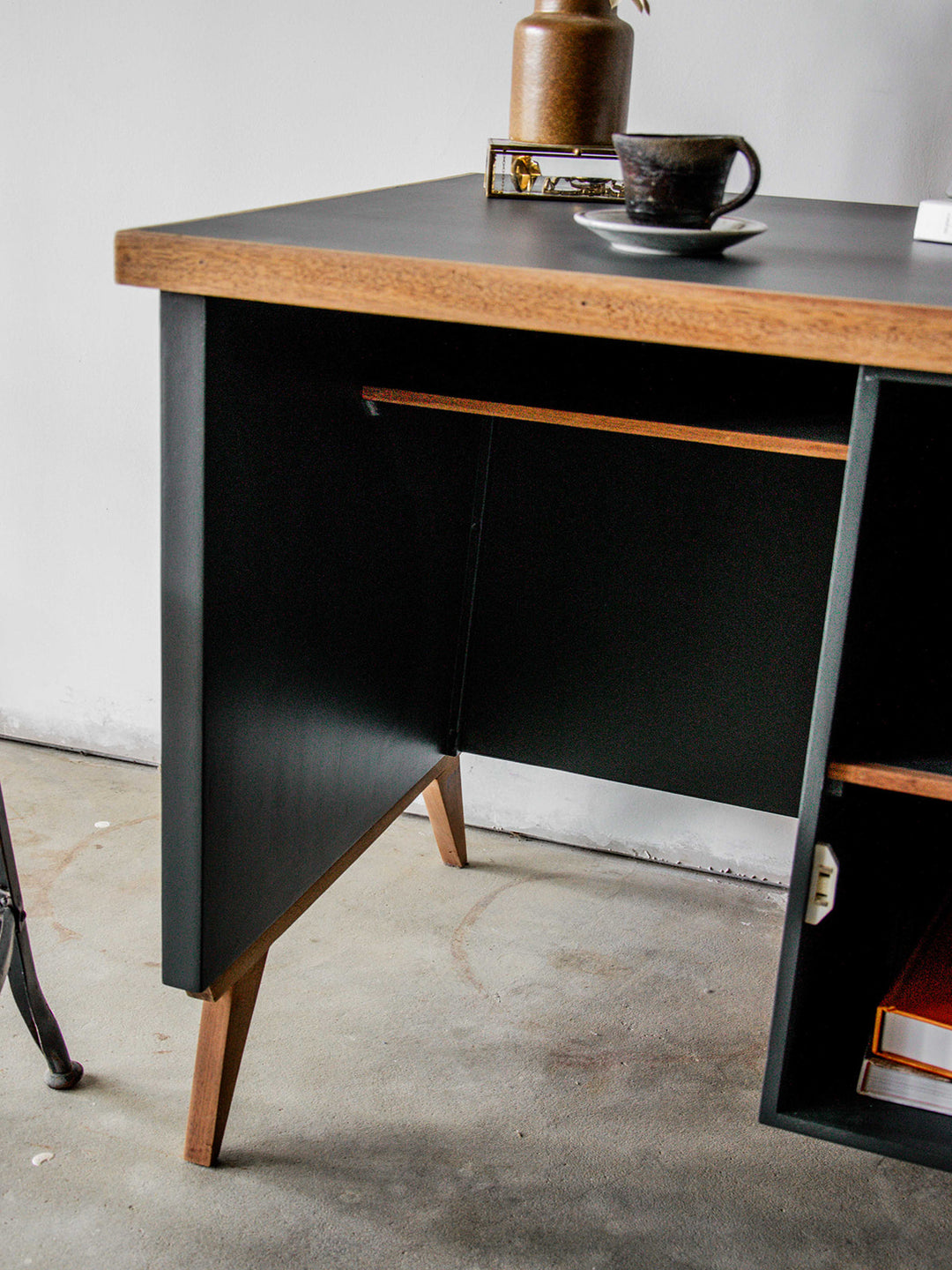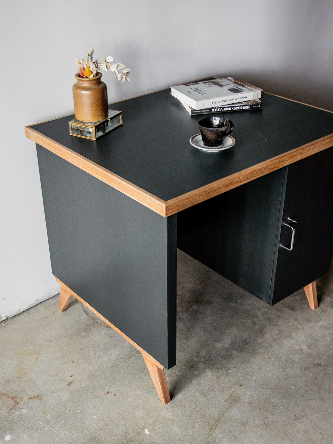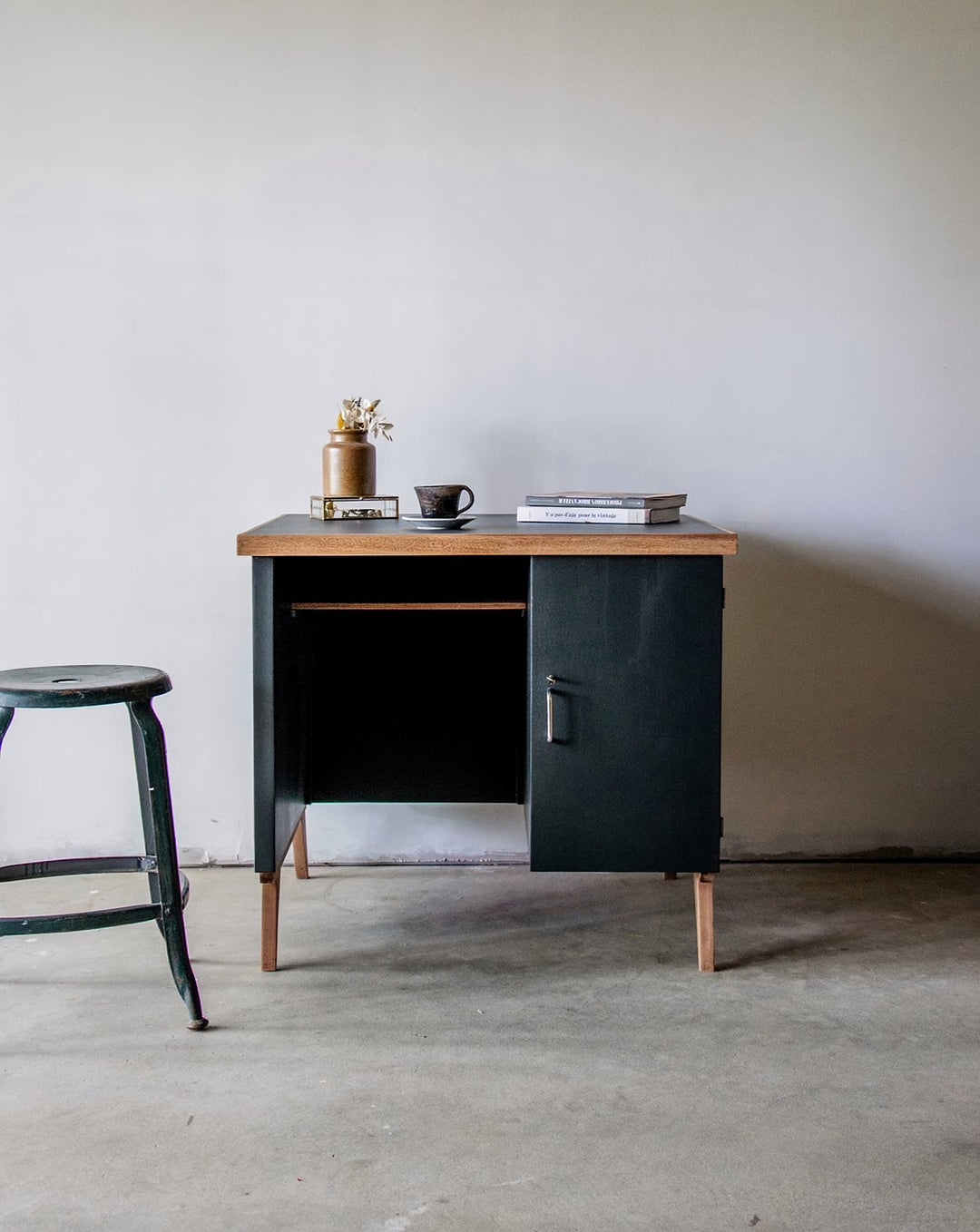 Ce petit bureau rénové en noir charbon combine élégance et praticité pour sublimer votre espace de travail. Sa case intérieure profonde et son placard doté d’une étagère offrent un rangement discret et efficace, tandis que ses pieds compas fins et sa bordure en bois apportent une touche à la fois vintage et contemporaine. Une pièce fonctionnelle et stylée, idéale pour aménager un coin bureau avec caractère.