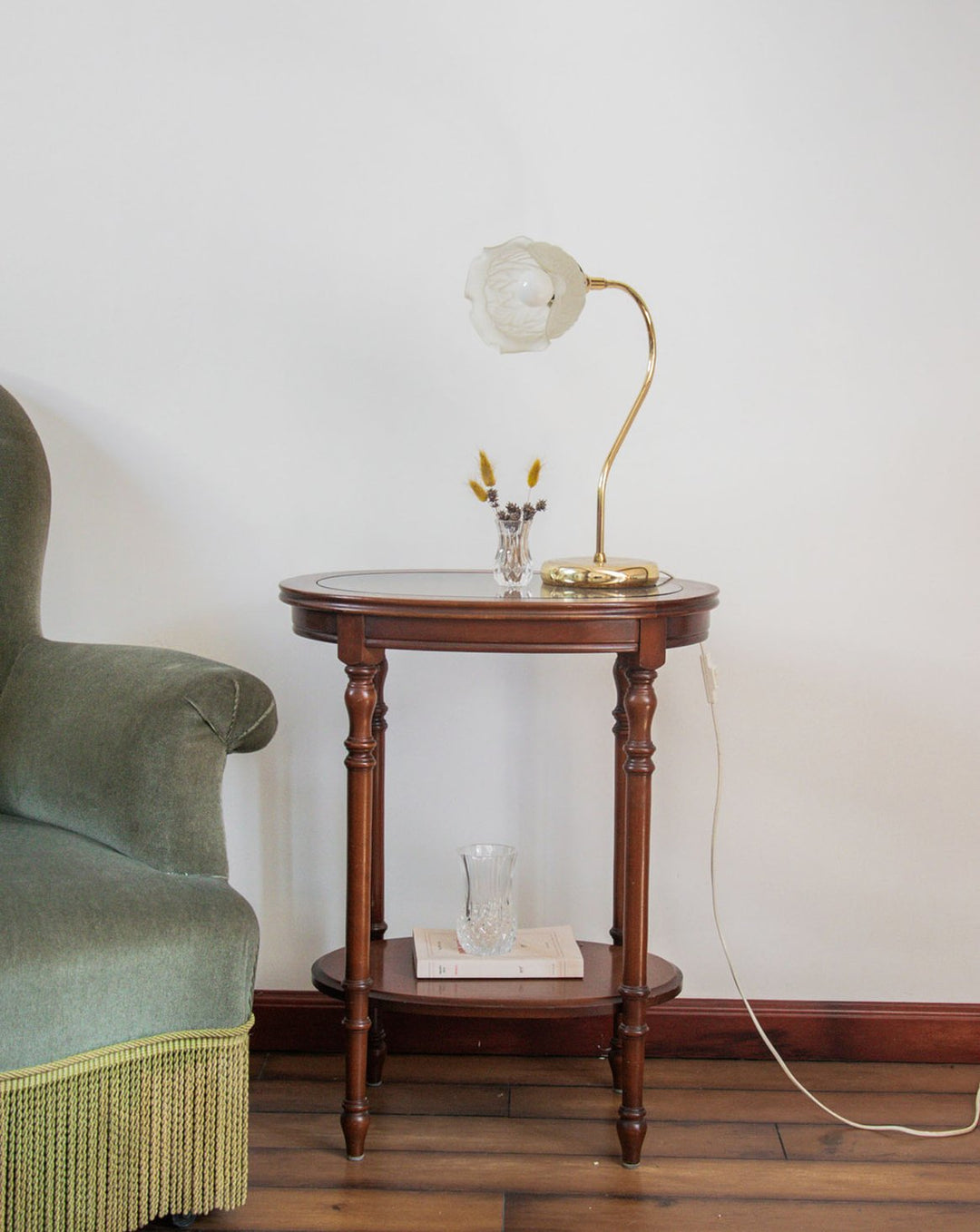 Une jolie table d’appoint au piétement en bois sculpté, pleine de charme et de raffinement. Son plateau mêle délicatement cannage et verre pour une touche légère et authentique. Le second plateau, plus bas, offre un rangement discret et pratique. Avec ses proportions idéales, elle trouvera facilement sa place dans un salon, une chambre ou un coin lecture. Une pièce élégante qui allie fonctionnalité et style.