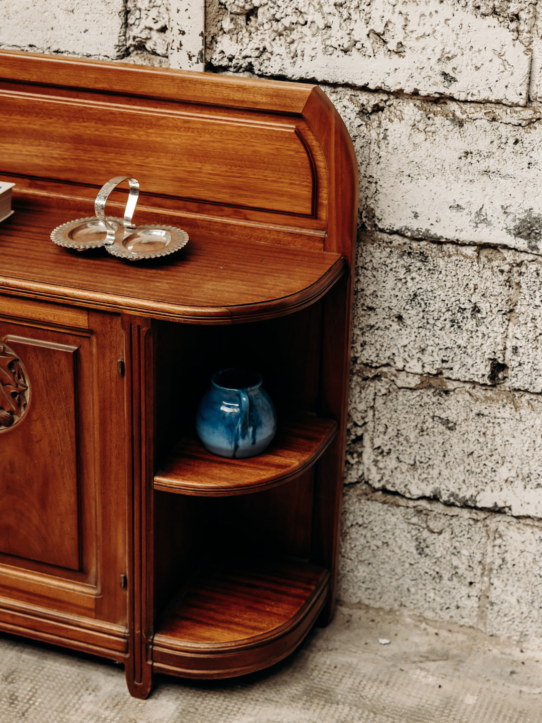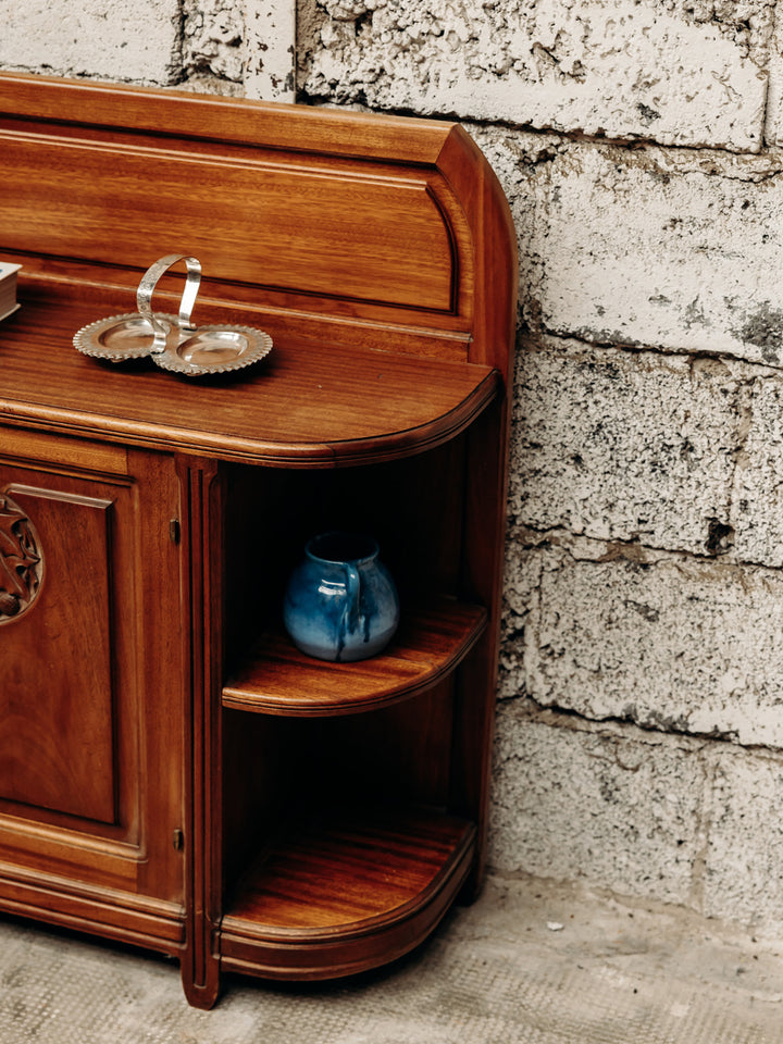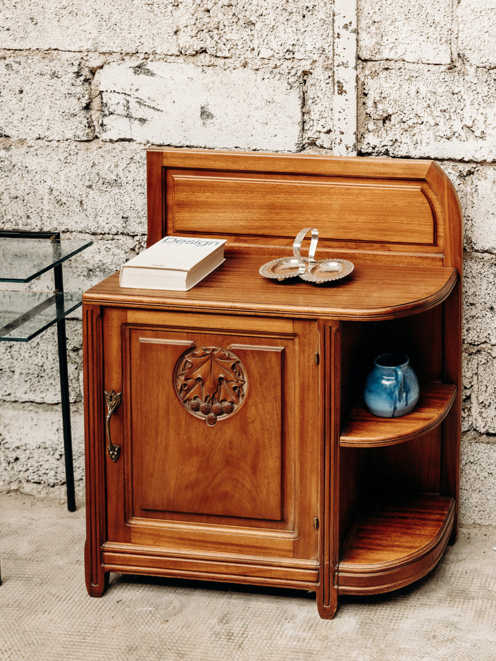 Découvrez ce petit meuble au charme indéniable, inspiré de l’art nouveau. Avec ses côtés arrondis et son élégant bois gravé de feuilles, il apporte une touche de sophistication à votre intérieur. Doté d’un placard spacieux et d’un rangement pratique sur le côté, il est idéal pour allier style et fonctionnalité. Sa poignée en métal ajoute une note moderne à ce pièce au design intemporel. Un incontournable pour les amateurs de décoration raffinée !