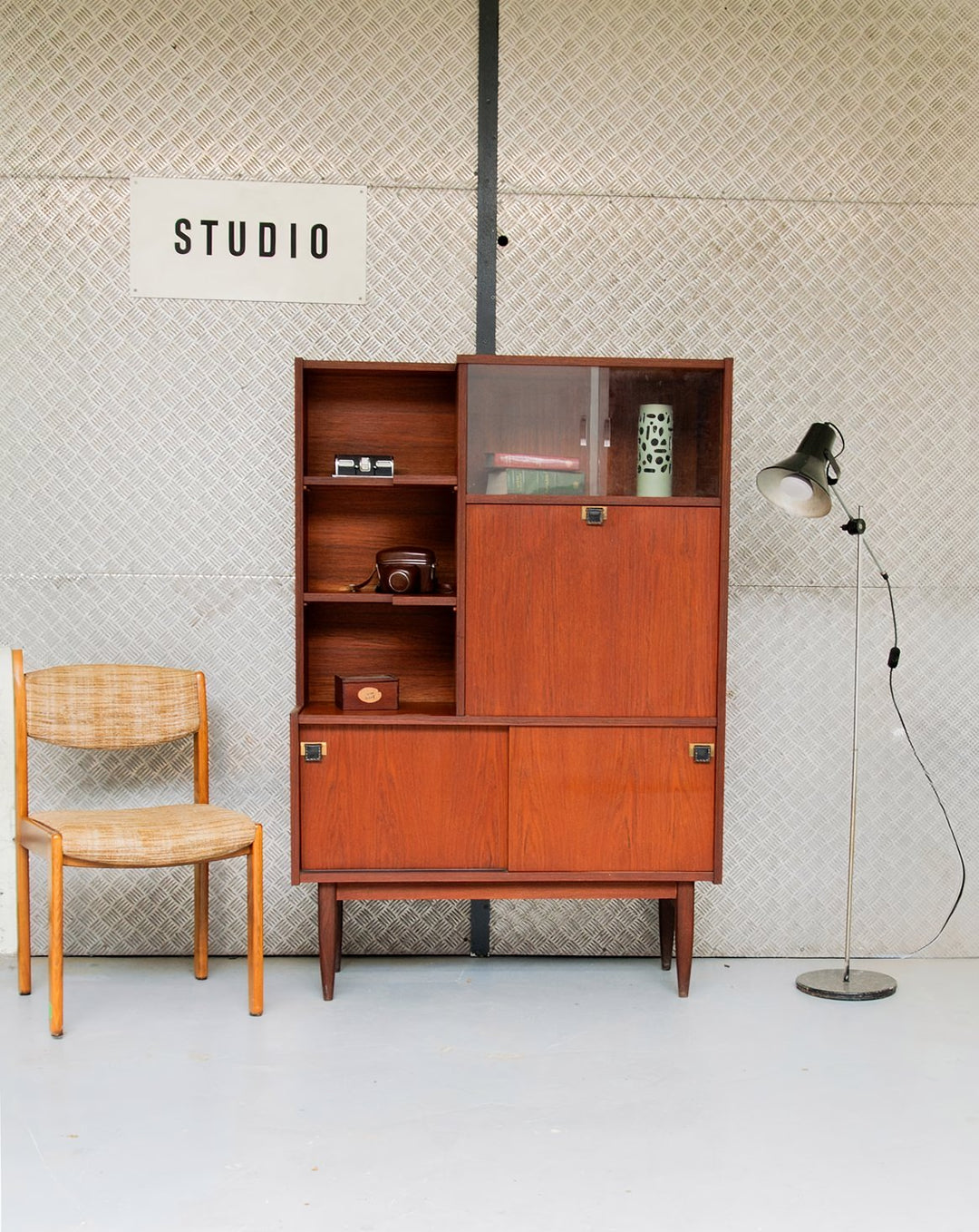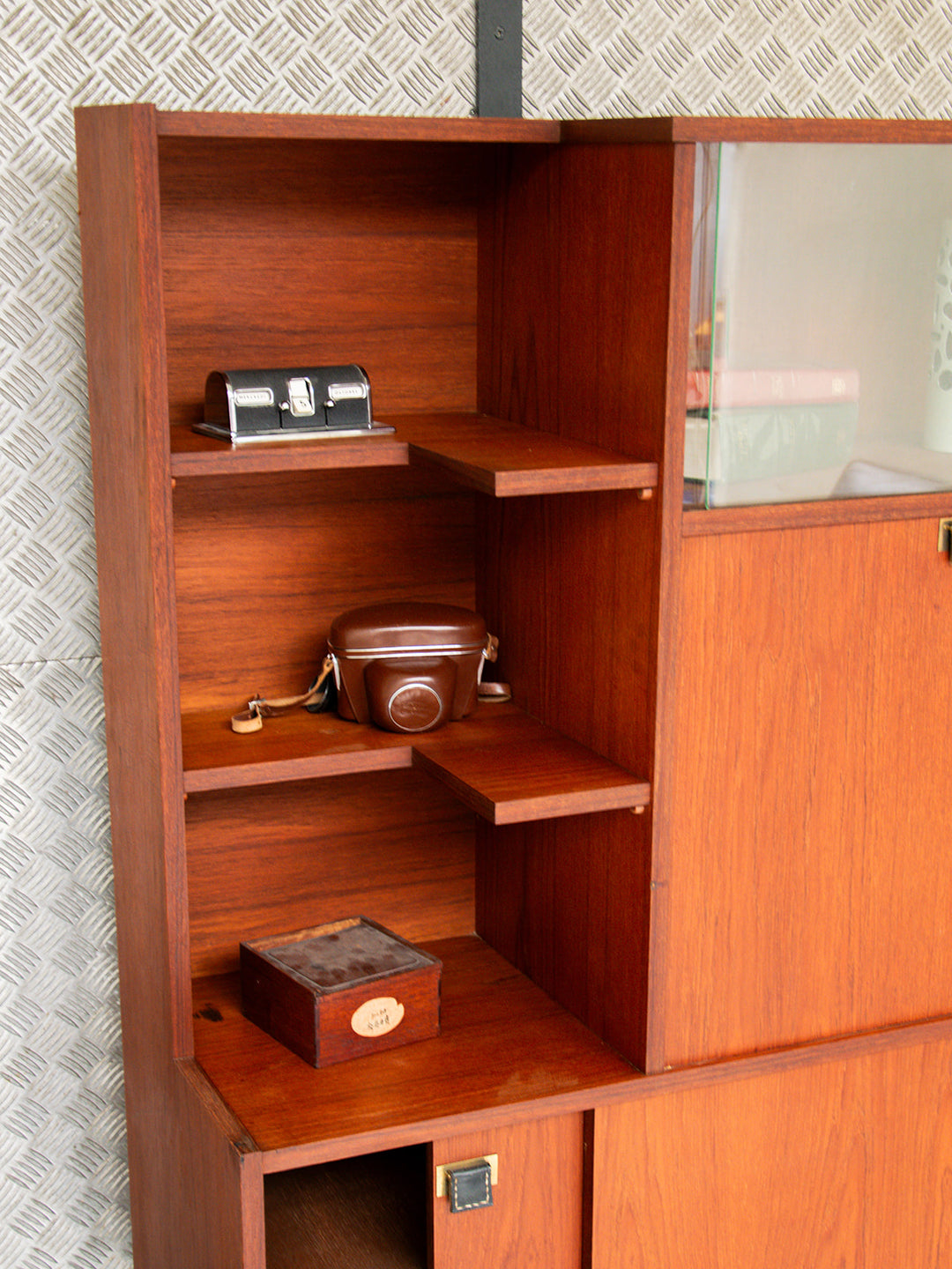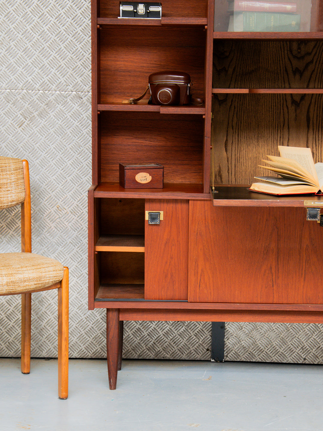 Découvrez ce grand secrétaire en teck des années 50, d'inspiration scandinave, avec un magnifique veinage du bois. Il offre une belle organisation grâce à ses 3 petites niches et ses étagères fermées, dont une avec des vitres coulissantes et une autre avec des portes coulissantes. Son plateau en formica noir apporte une touche moderne à l'ensemble, tandis que les poignées en cuir ajoutent du charme. Les pieds en bois soulignent son esthétique élégante et fonctionnelle. Un meuble intemporel qui saura parfaitement s'intégrer dans votre intérieur.