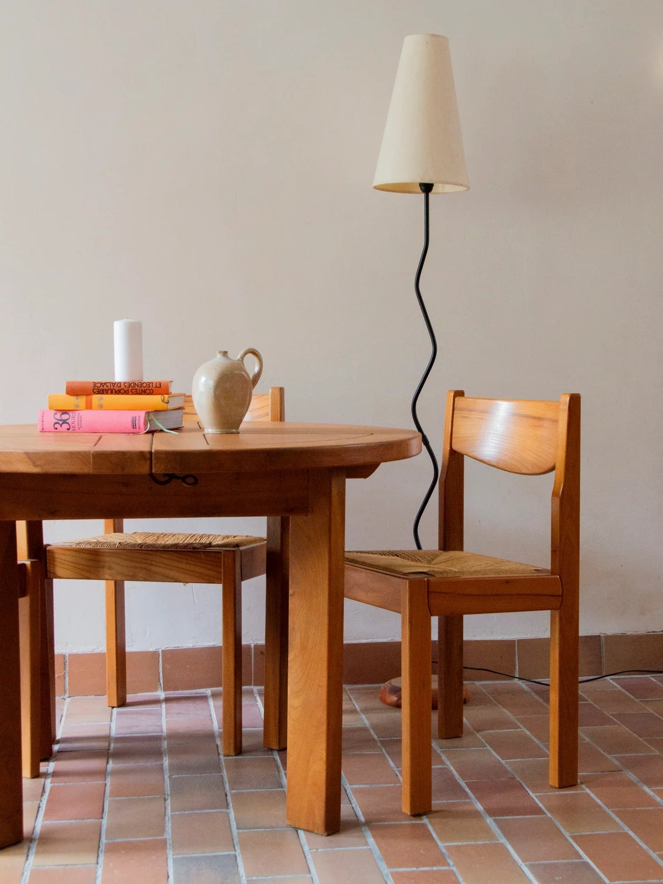 Découvrez cette superbe table ronde en orme massif, attribuée à la Maison Regain, réalisée dans les années 80. Son plateau orné de panneaux géométriques emblématiques de l'atelier repose sur un piètement droit robuste qui assure une excellente stabilité. Grâce à son ingénieux système de rallonge, elle se transforme facilement pour accueillir jusqu'à 6 convives, alliant convivialité et fonctionnalité. Avec son design intemporel et sa belle patine naturelle, cette pièce chaleureuse sublimera à merveille votre salle à manger. En très bon état général, le plateau et la rallonge ont été soigneusement vernis dans notre atelier pour une protection optimale.