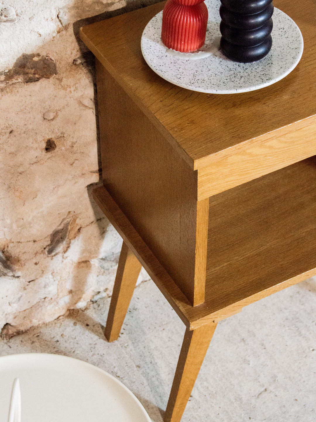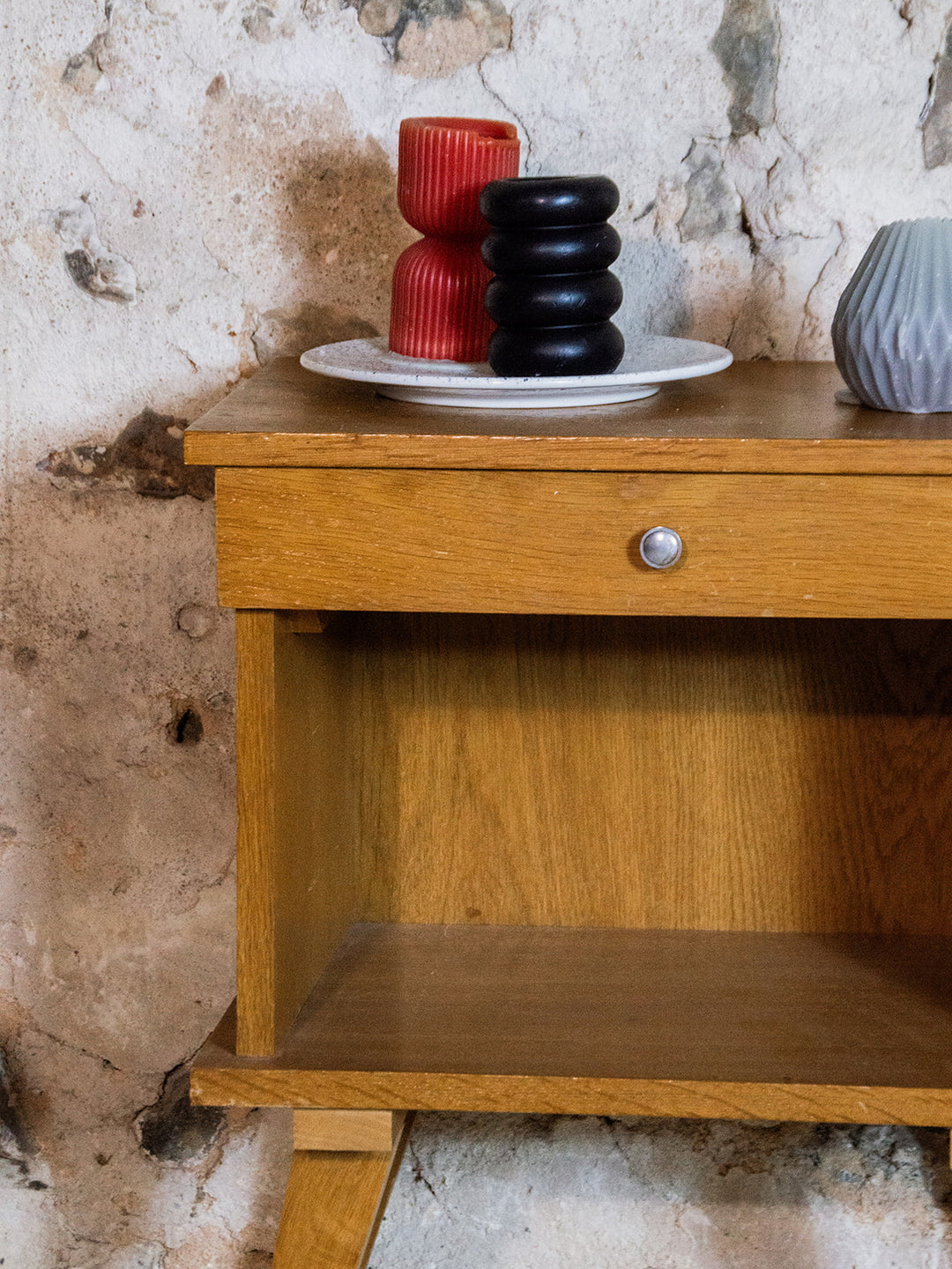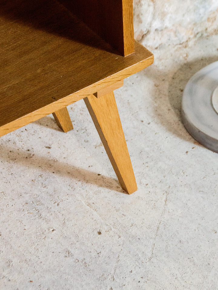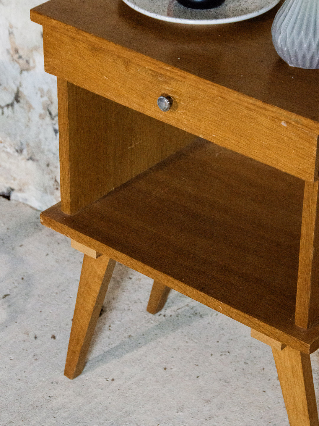 Découvrez ce charmant chevet vintage en placage chêne, typique des années 60. Son design sobre et fonctionnel offre un petit tiroir et une case ouverte pour vos essentiels. Les pieds compas apportent une touche élégante et rétro, tout en assurant une bonne stabilité. L'ensemble est en bon état, avec quelques marques du temps visibles sur les photos. Idéal en table de nuit ou meuble d’appoint.