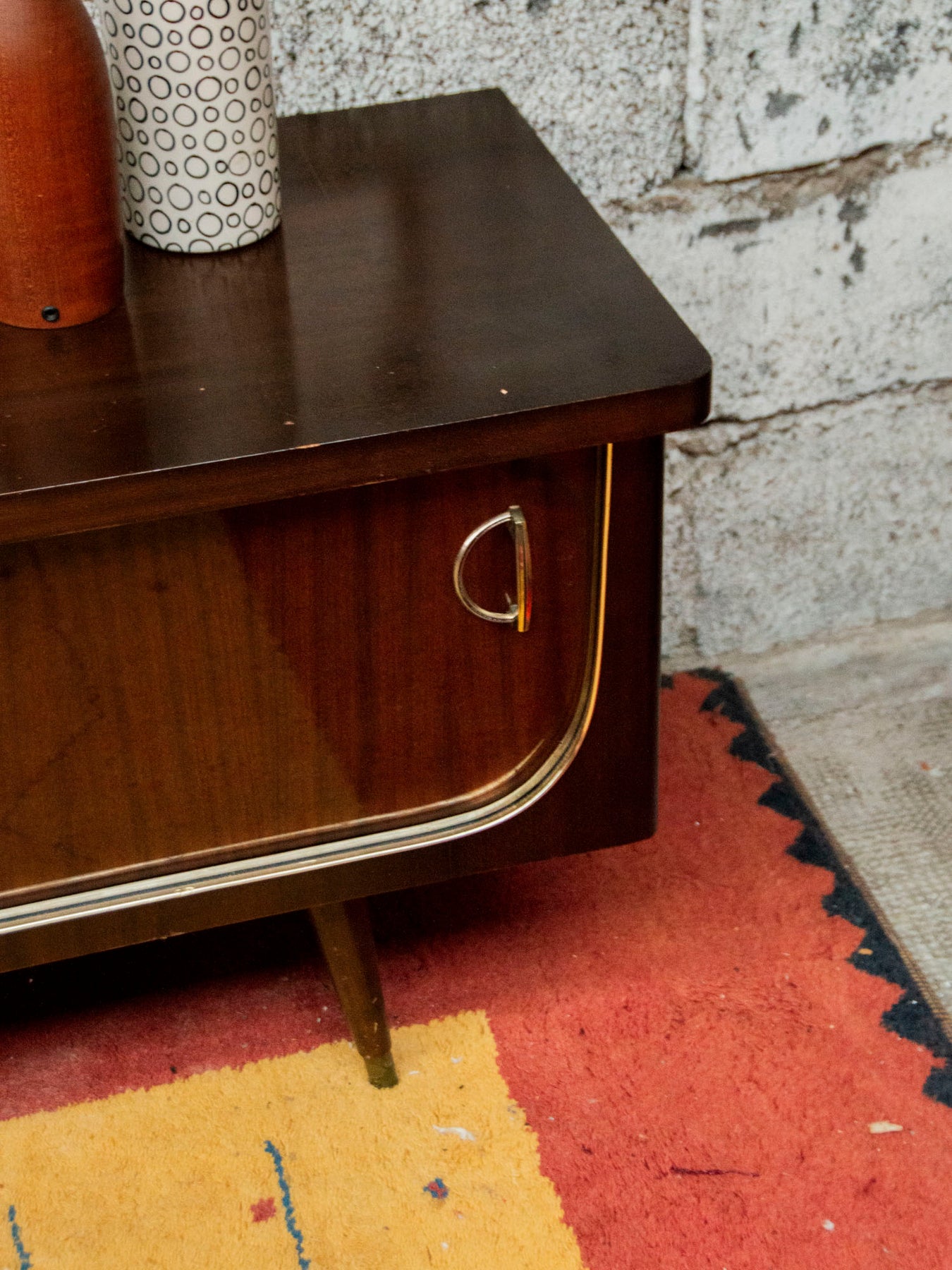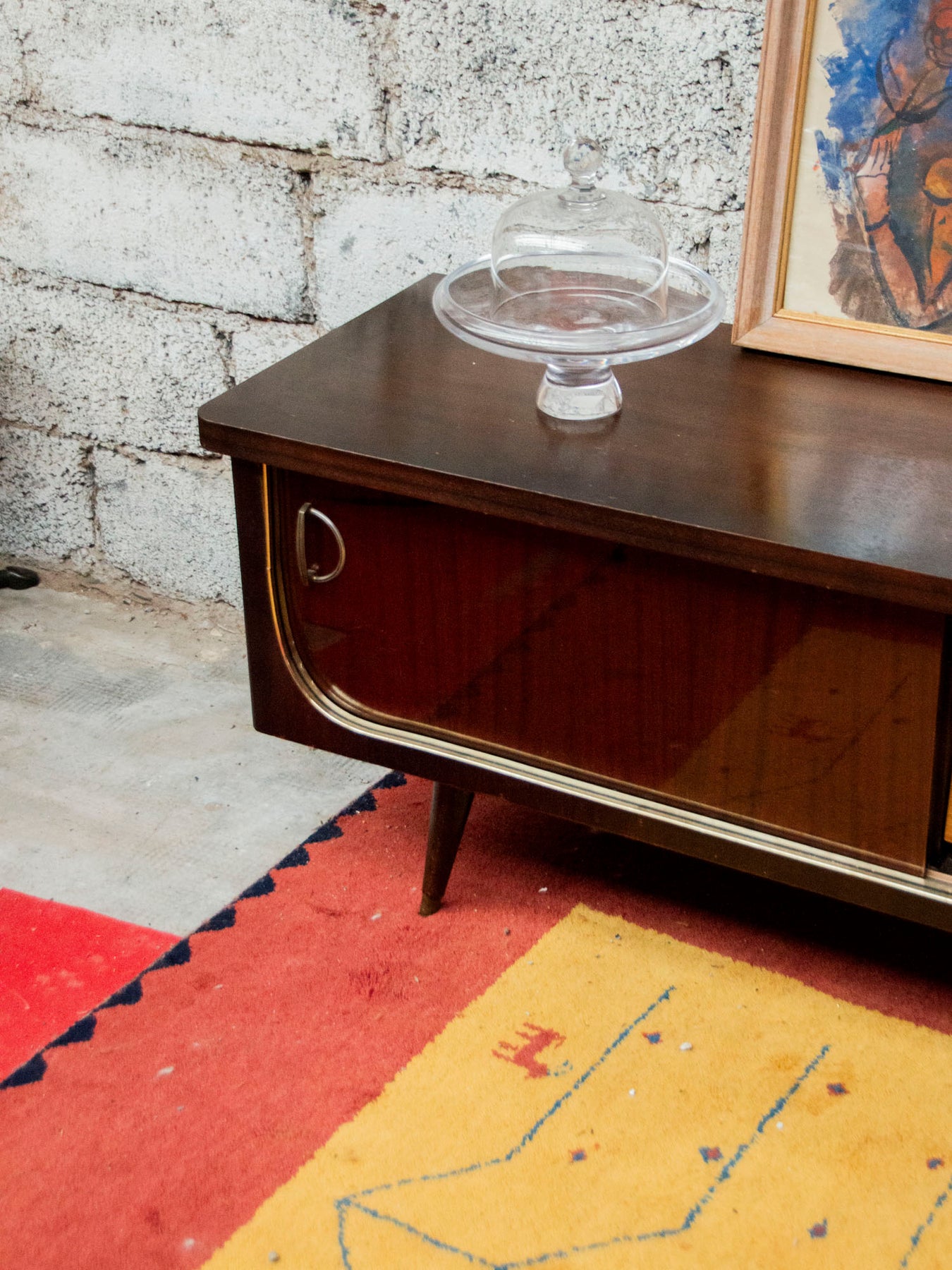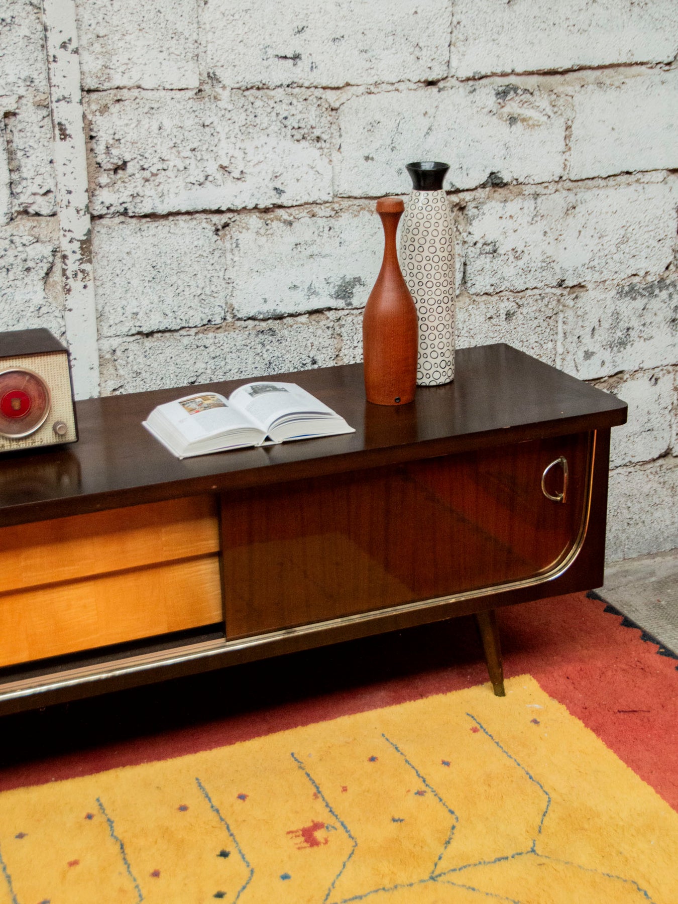 Découvrez cette enfilade élégante, réalisée en bois foncé verni. Avec ses deux tiroirs en bois clair, elle offre un contraste subtil et raffiné. Ses petits pieds compas ajoutent une touche vintage à ce meuble au charme certain. Notez quelques légères usures, vestiges d’une belle histoire, qui renforcent son caractère authentique. Un incontournable pour apporter du style à votre intérieur !