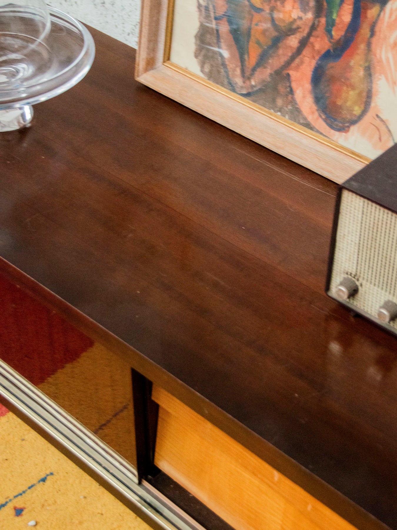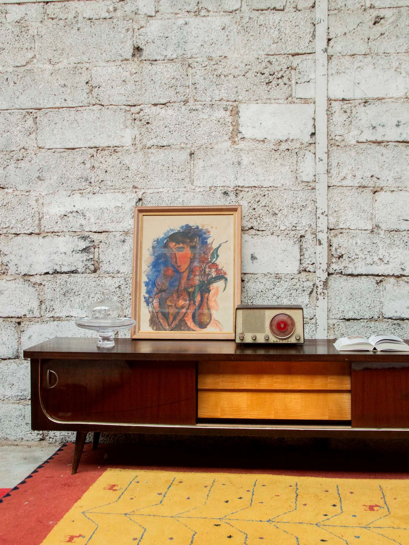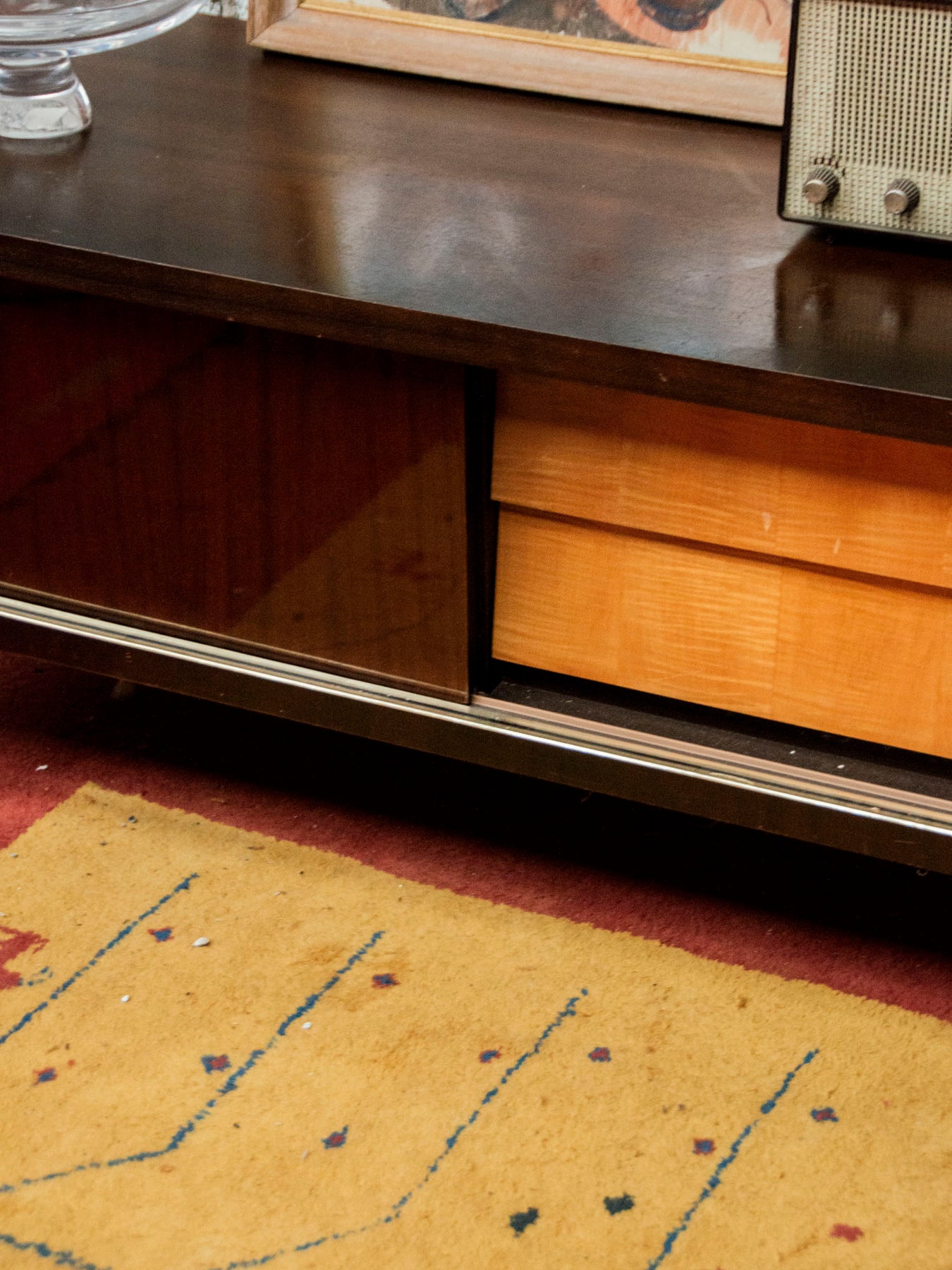 Découvrez cette enfilade élégante, réalisée en bois foncé verni. Avec ses deux tiroirs en bois clair, elle offre un contraste subtil et raffiné. Ses petits pieds compas ajoutent une touche vintage à ce meuble au charme certain. Notez quelques légères usures, vestiges d’une belle histoire, qui renforcent son caractère authentique. Un incontournable pour apporter du style à votre intérieur !