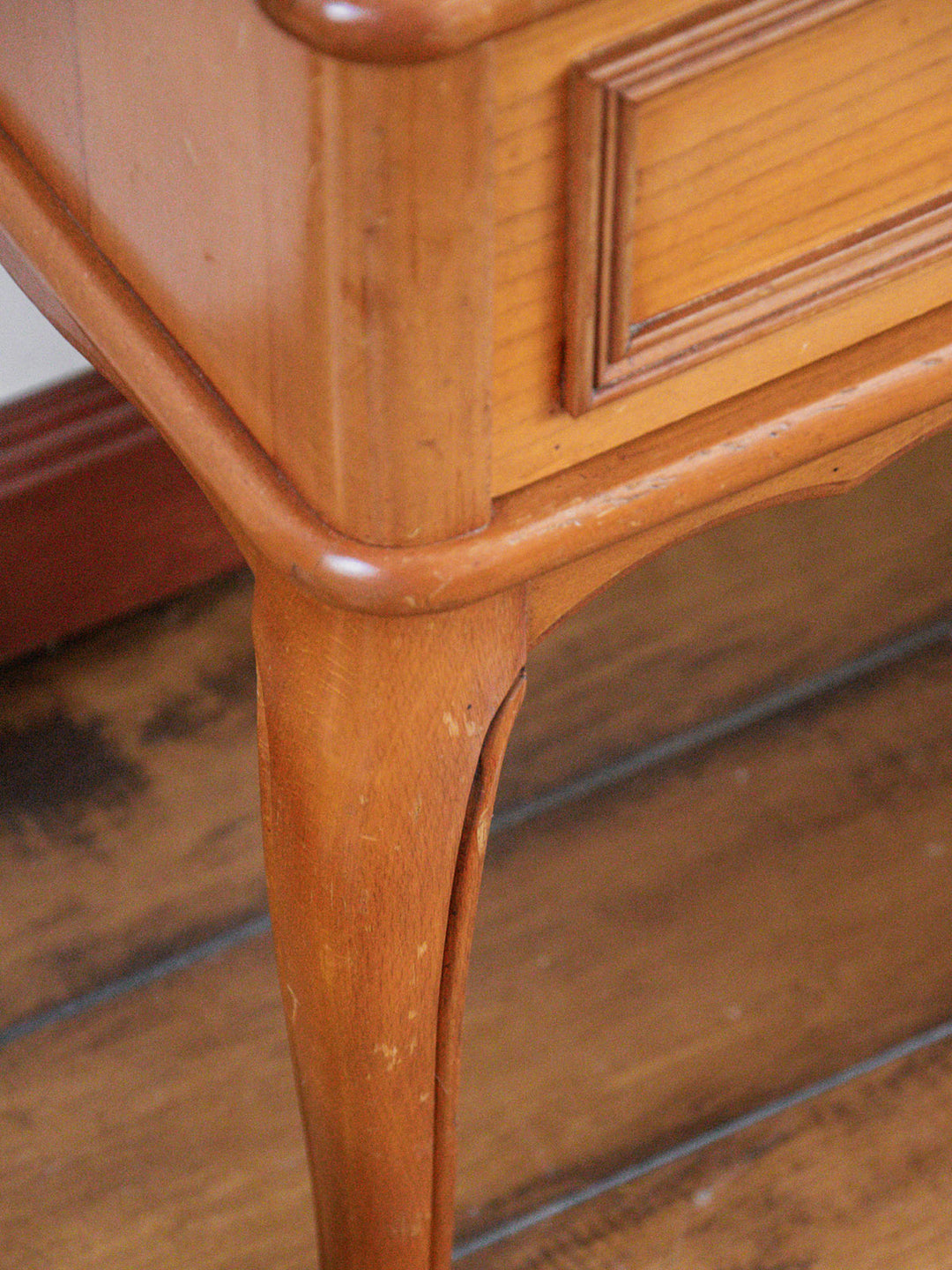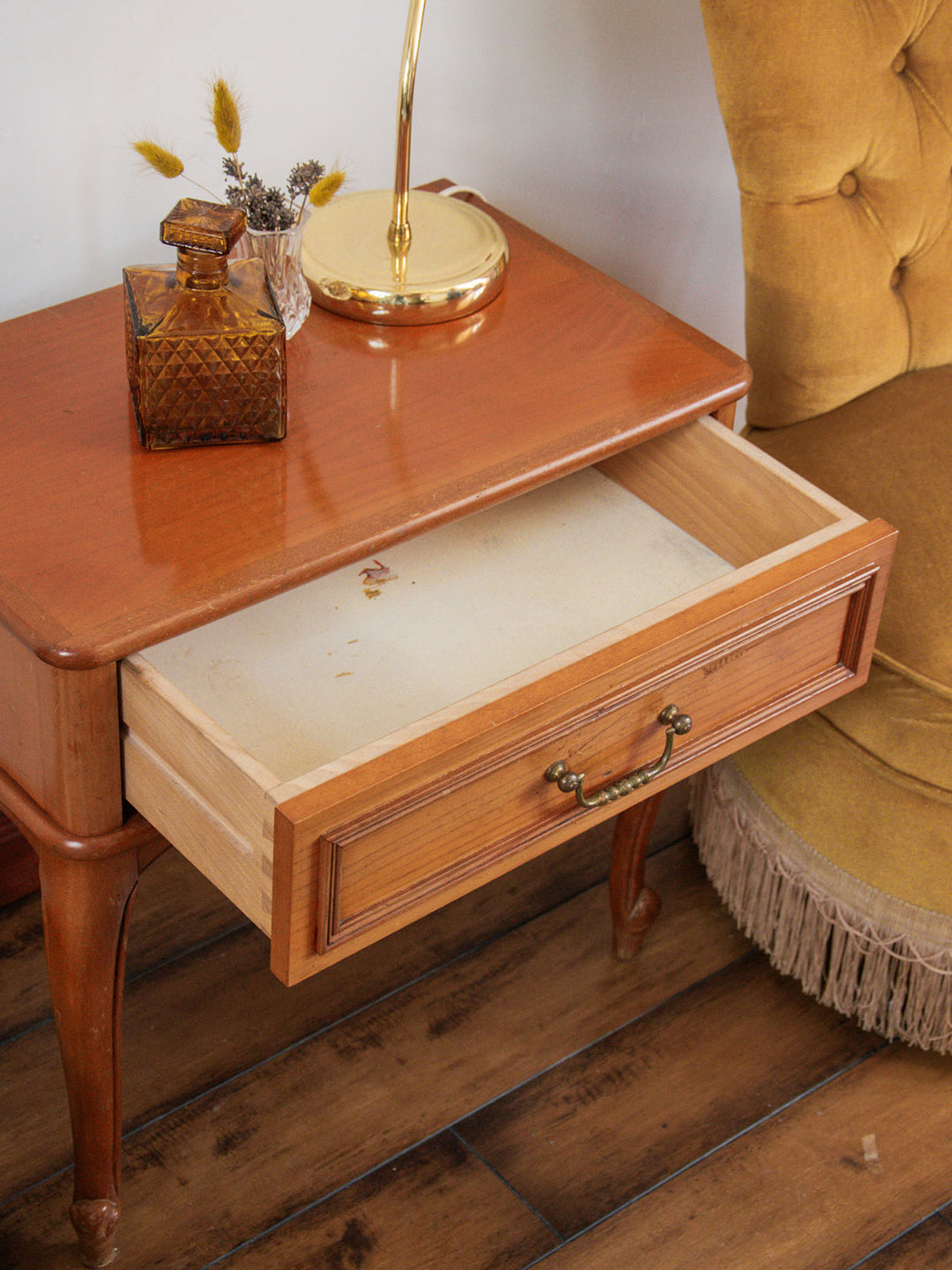 Une jolie table de nuit en merisier qui ne manque pas de cachet. Sa teinte bois orangé réchauffe l’espace, tandis que ses poignées en métal finement travaillées et ses pieds courbés lui donnent une allure pleine de charme. Quelques traces du temps racontent son histoire et ajoutent à son caractère. Une pièce unique à adopter pour une touche vintage tout en douceur.