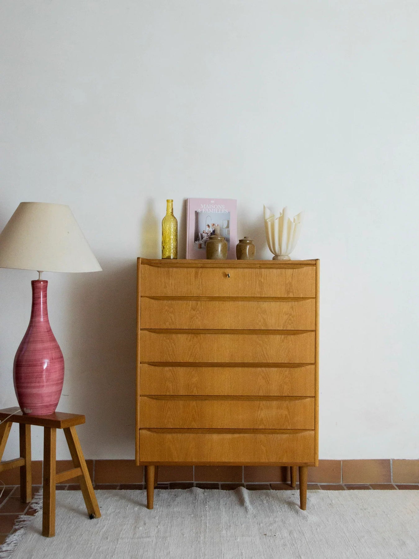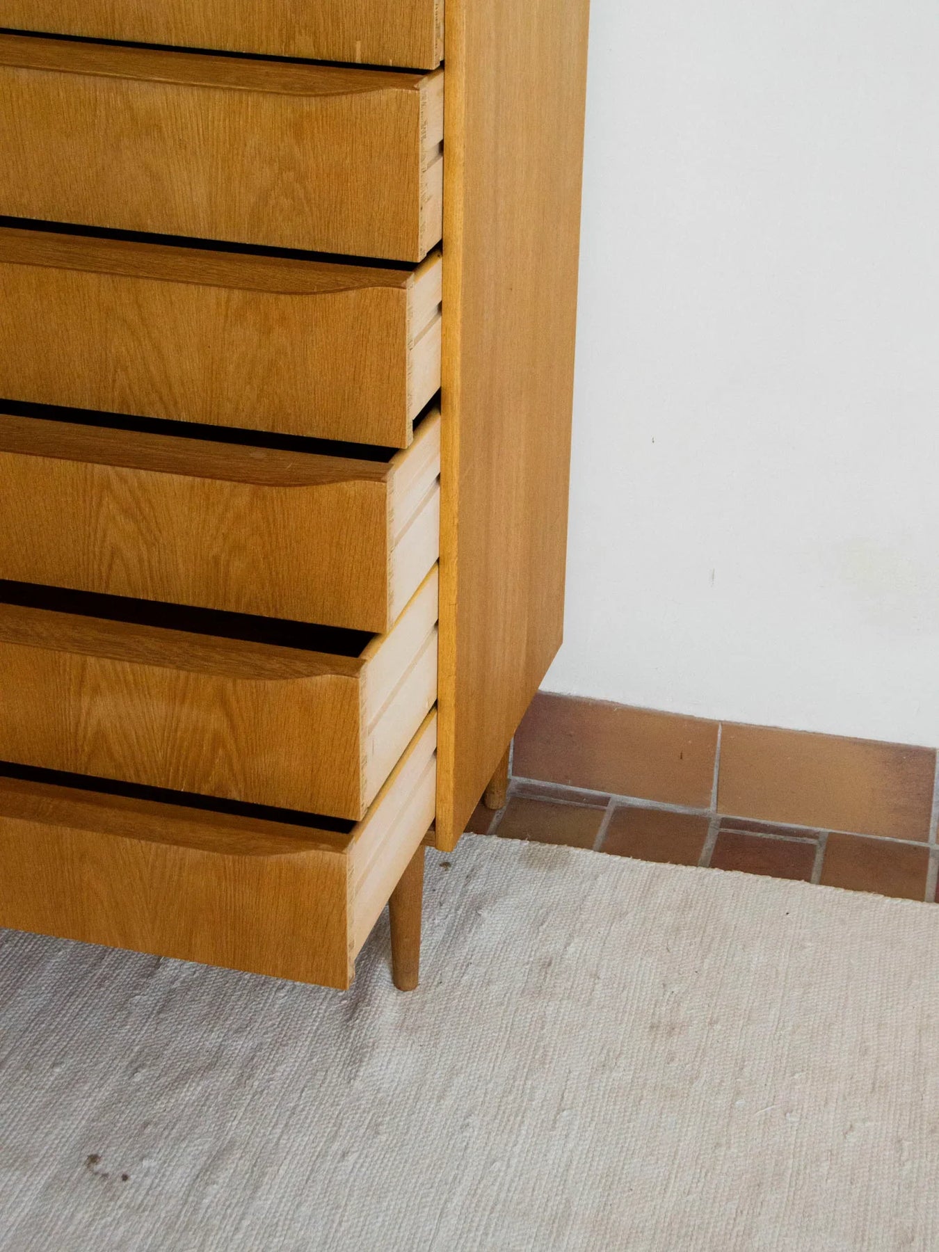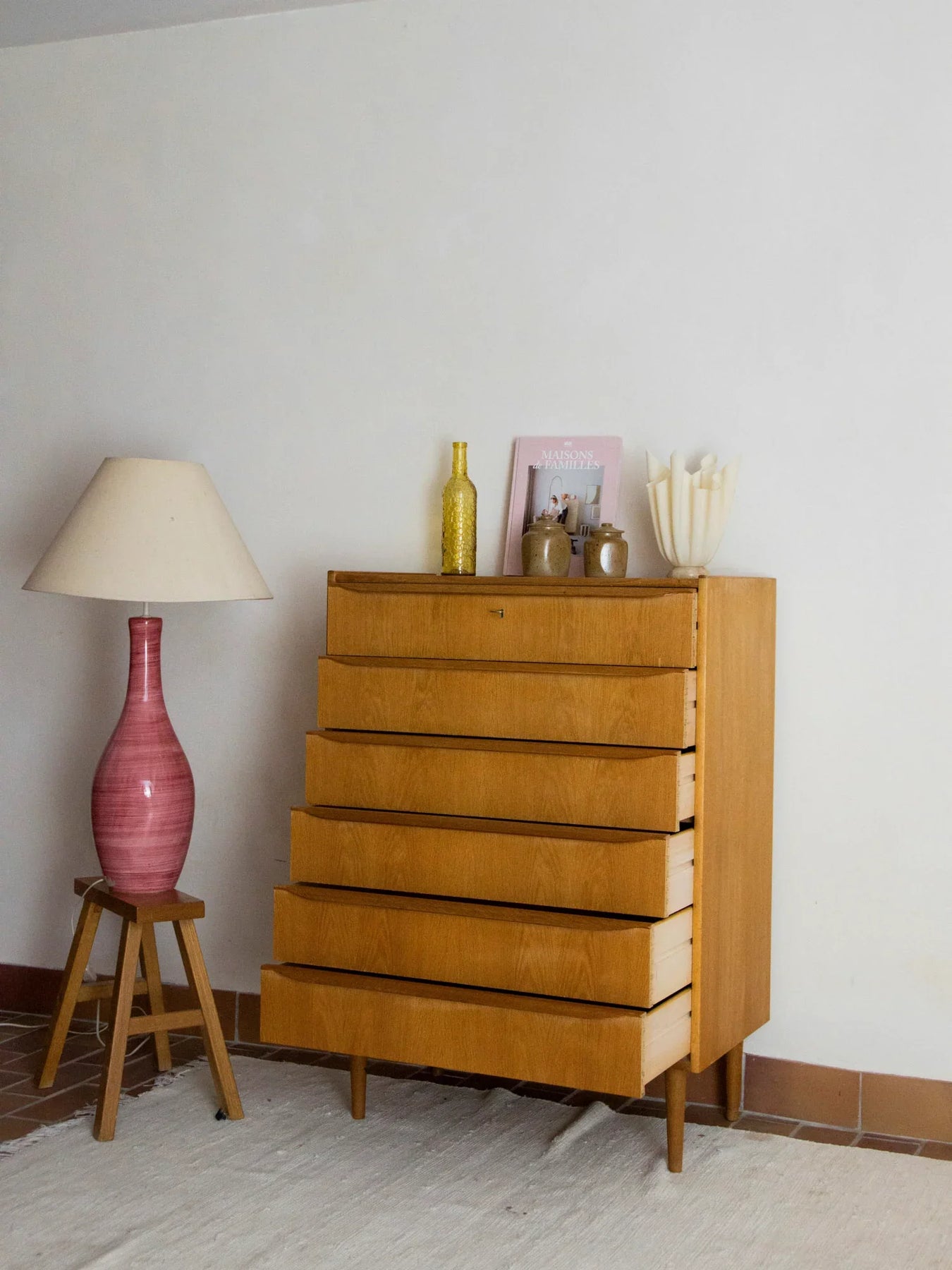 Découvrez notre haute commode scandinave en chêne clair, emblématique du design danois des années 60. Ses poignées sculptées dans la masse témoignent de l'excellence artisanale, apportant une légèreté à la silhouette du meuble. Avec sa teinte miel chaleureuse, elle s'intègre parfaitement dans une chambre ou un bureau, alliant élégance et praticité. En très bon état général, cette commode présente une structure stable et de légères marques d’usage, rappelant son histoire. Une pièce maîtresse pour les amateurs de mobilier nordique d'époque.