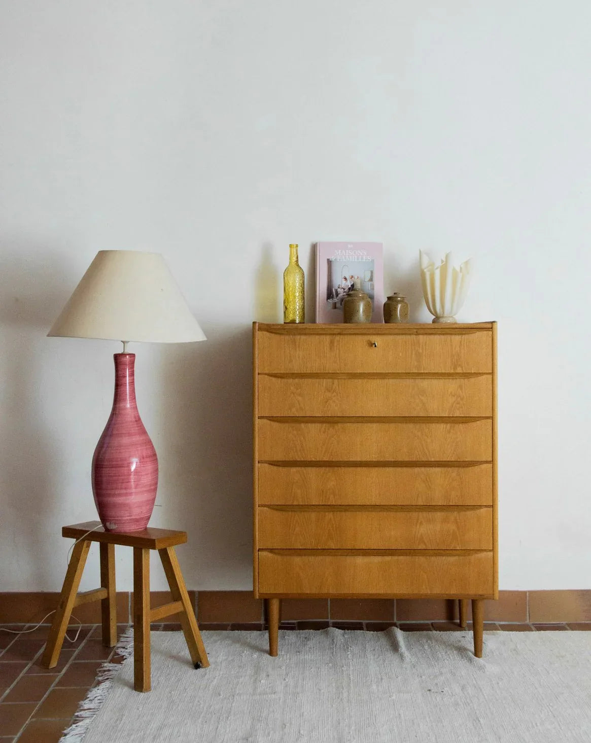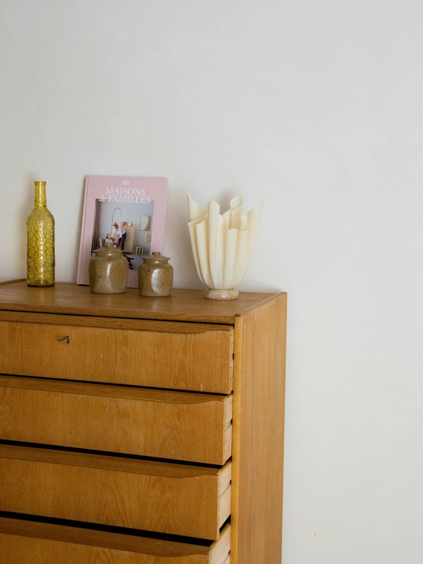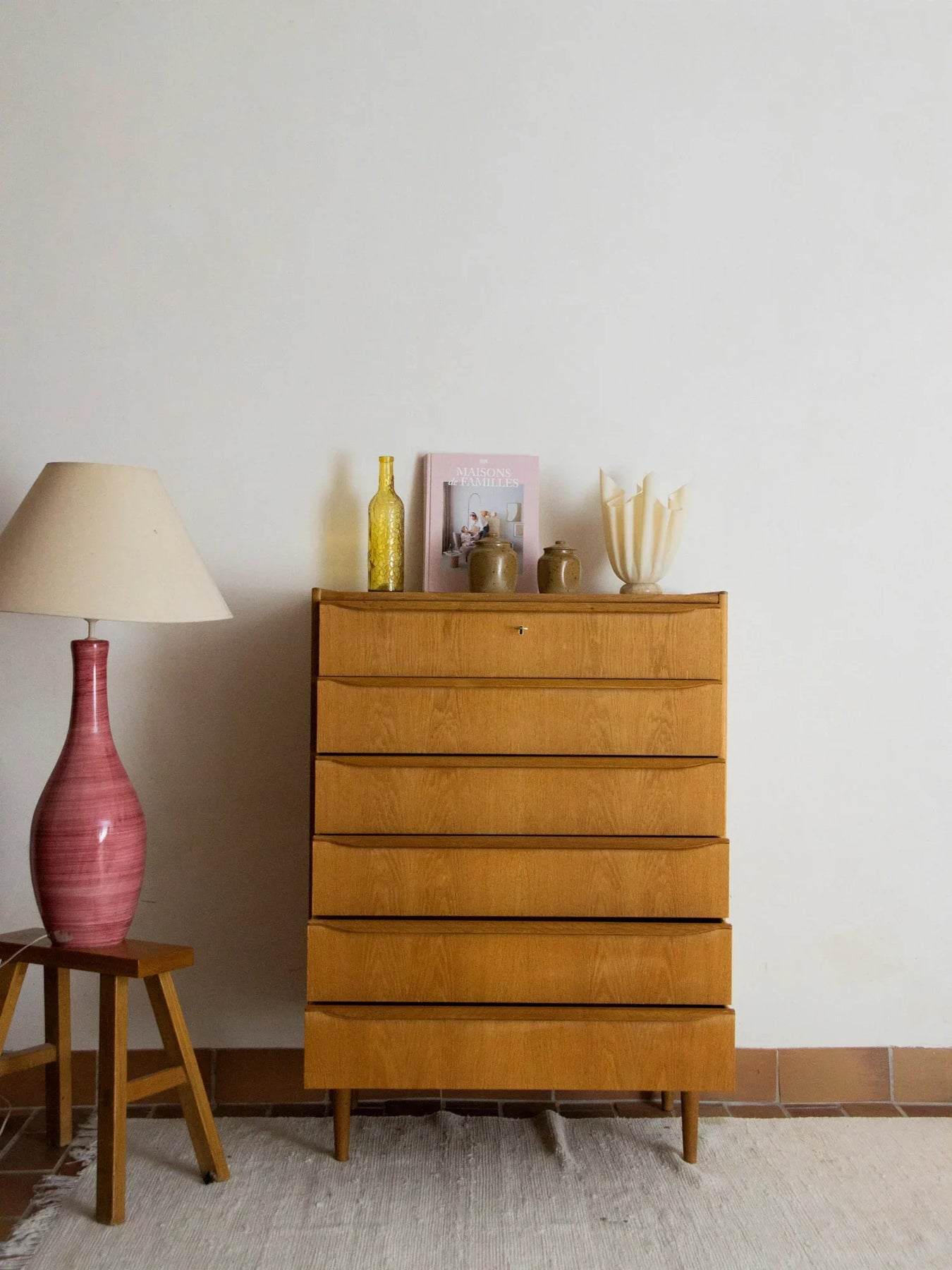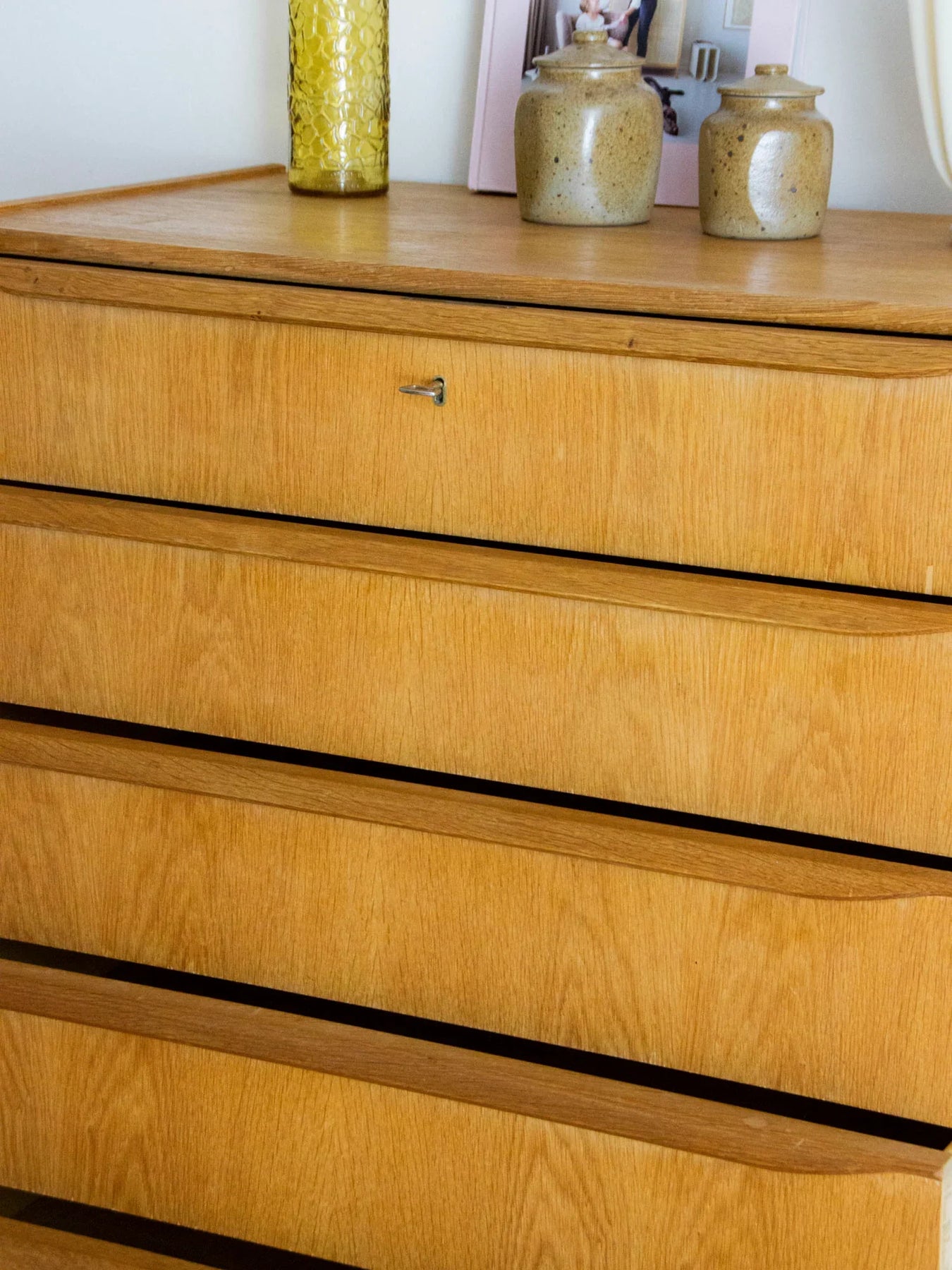 Découvrez notre haute commode scandinave en chêne clair, emblématique du design danois des années 60. Ses poignées sculptées dans la masse témoignent de l'excellence artisanale, apportant une légèreté à la silhouette du meuble. Avec sa teinte miel chaleureuse, elle s'intègre parfaitement dans une chambre ou un bureau, alliant élégance et praticité. En très bon état général, cette commode présente une structure stable et de légères marques d’usage, rappelant son histoire. Une pièce maîtresse pour les amateurs de mobilier nordique d'époque.
