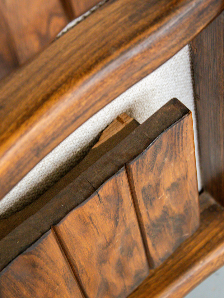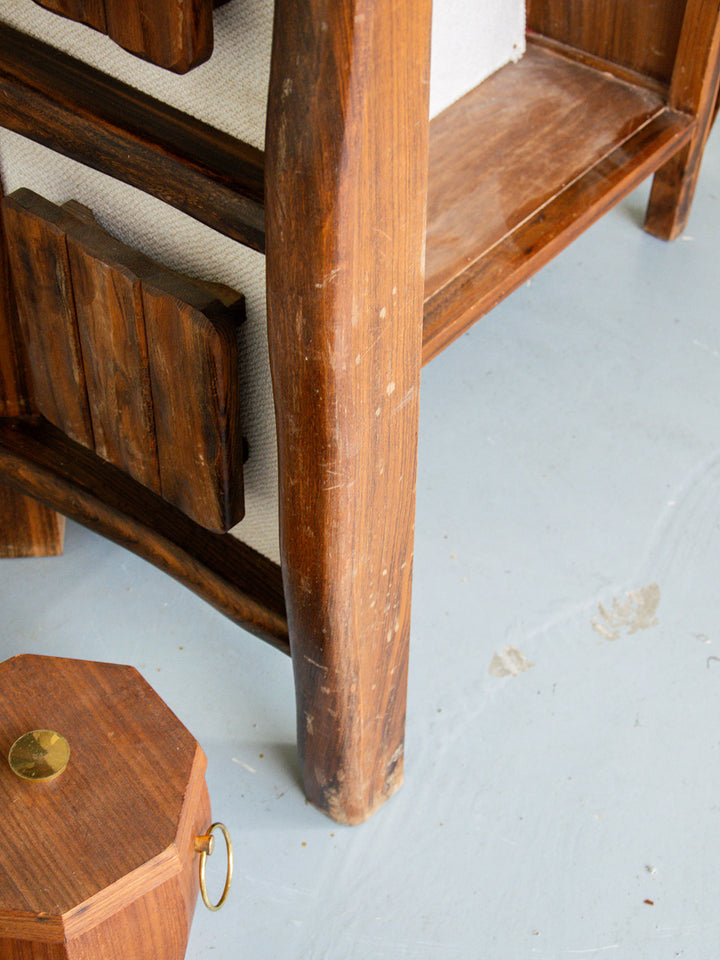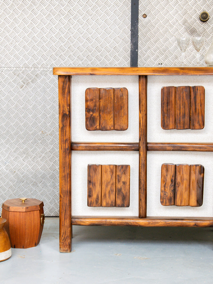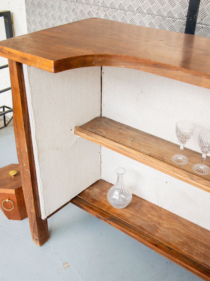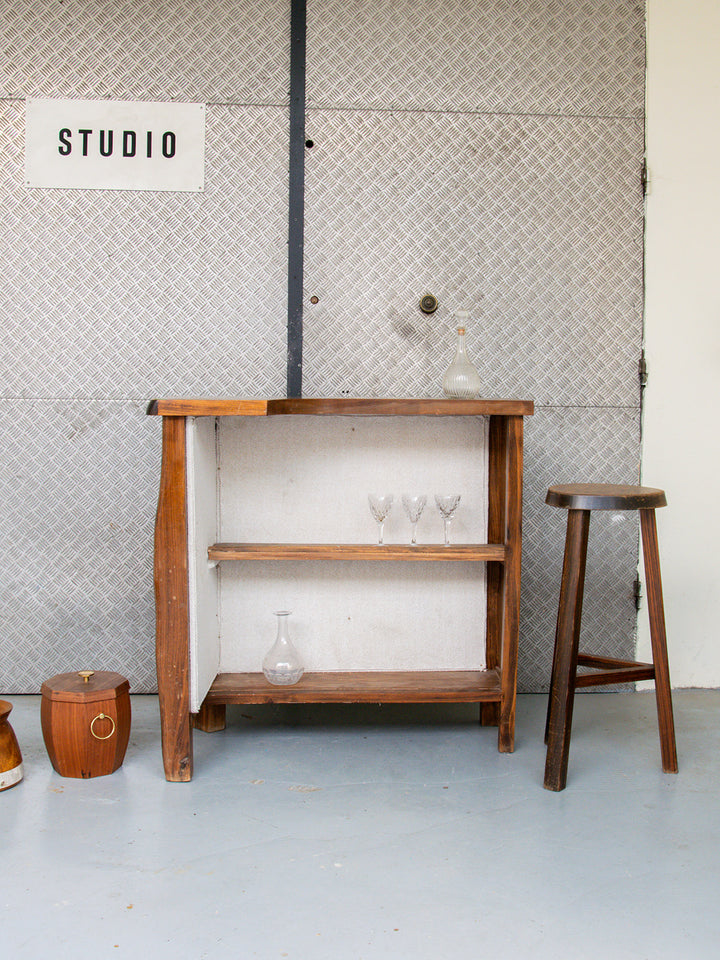 Découvrez ce bar en orme et tissu au style brutaliste affirmé, inspiré du travail d'Olavi Hanninen. Son design sculptural et ses lignes fortes en font une pièce rare et expressive. À l’arrière, deux étagères offrent un espace pratique pour le rangement. Le bois présente quelques traces du temps qui participent à son authenticité. Un meuble de caractère à l’esthétique marquée.