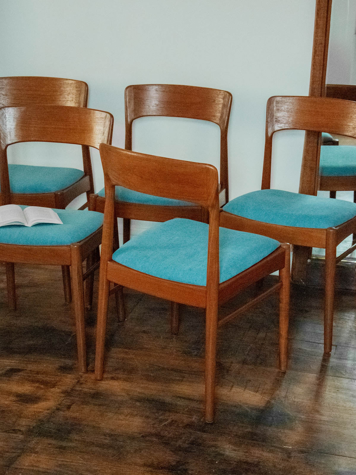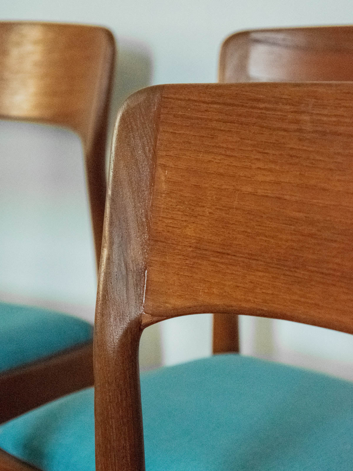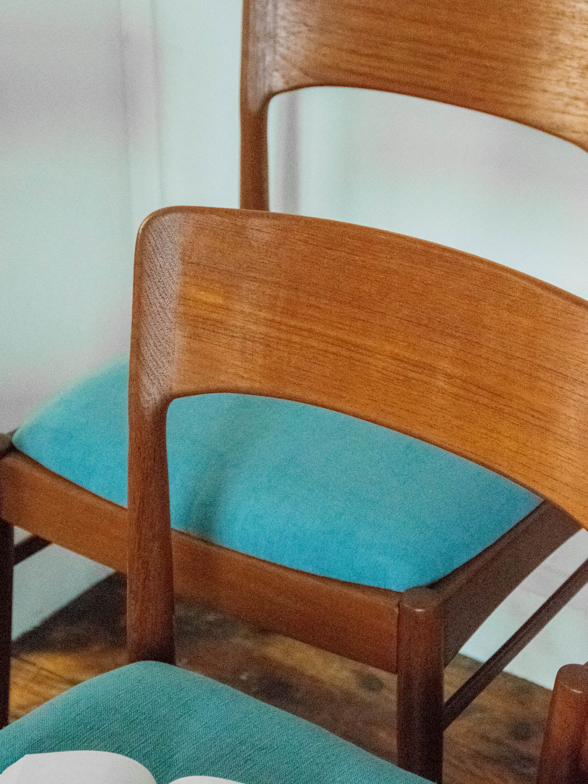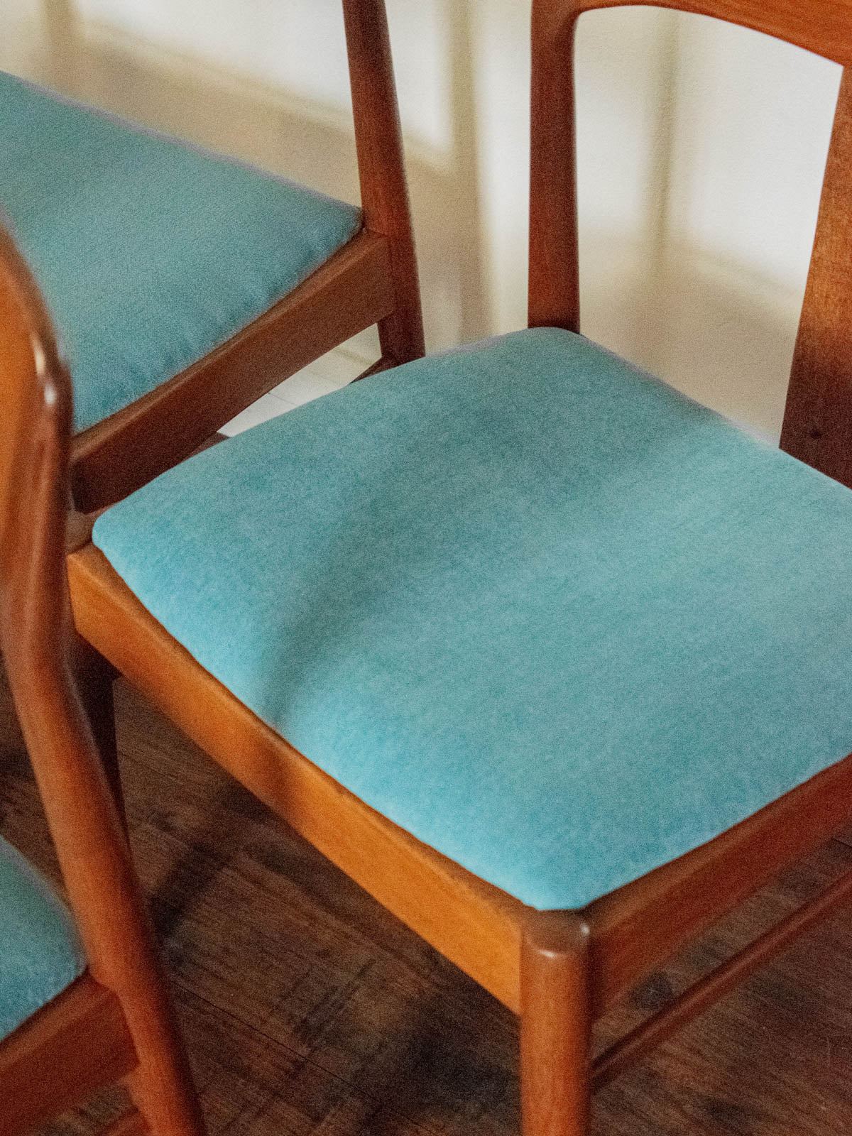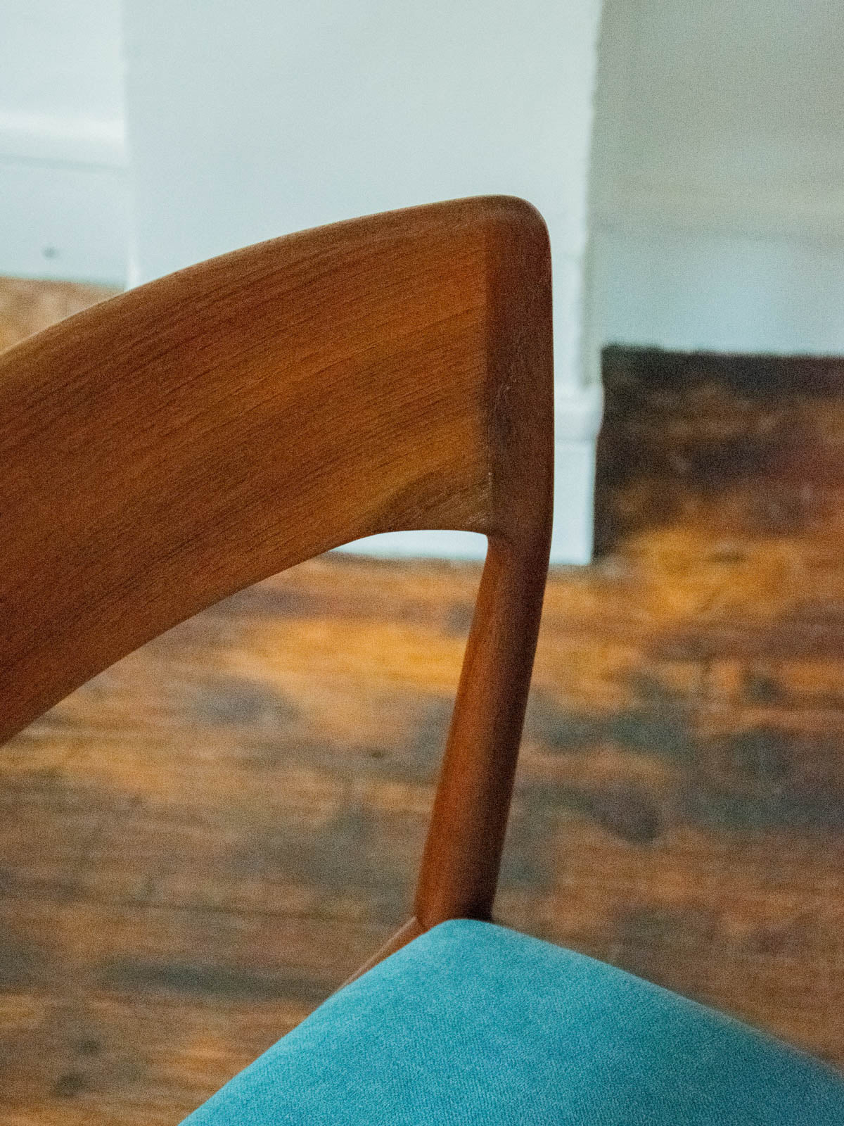 Découvrez ce lot de 6 chaises scandinaves en teck, créées par le designer danois Henning Kjærnulf pour Korpus Stolefabrik dans les années 60. Chaque chaise a été entièrement restaurée, avec structure, mousse et assise recouverte d’un tissu Casal Aquaclean effet velours bleu-vert, facile à nettoyer au quotidien. Leur design élégant et intemporel met en valeur le bois chaud du teck. Une réparation est visible sur un dossier, sans compromettre l’ensemble.