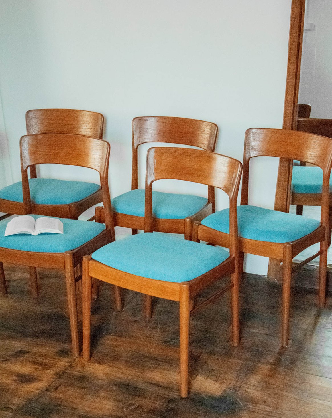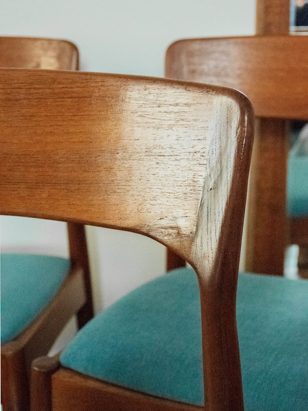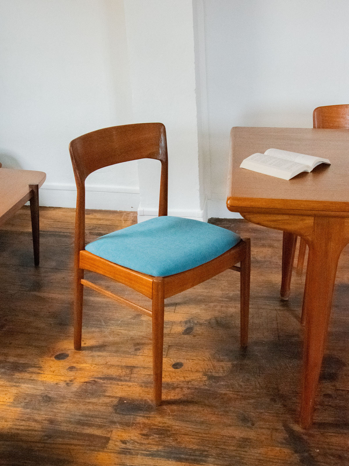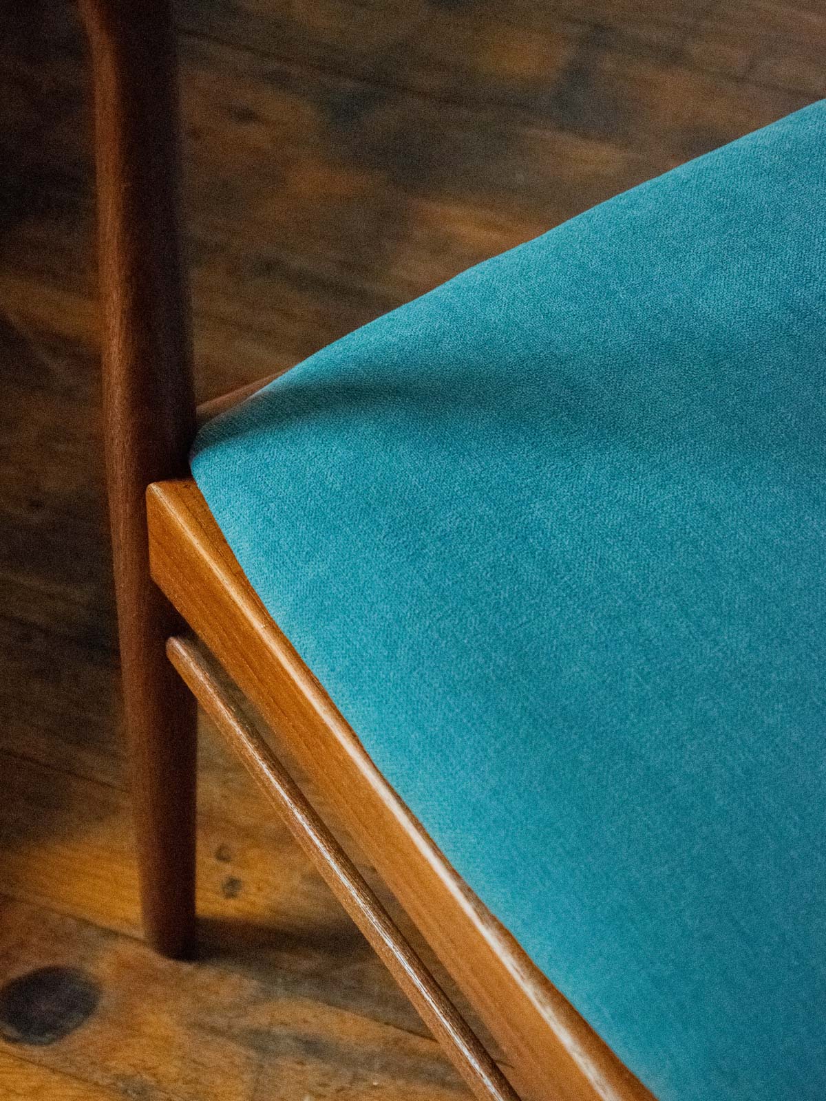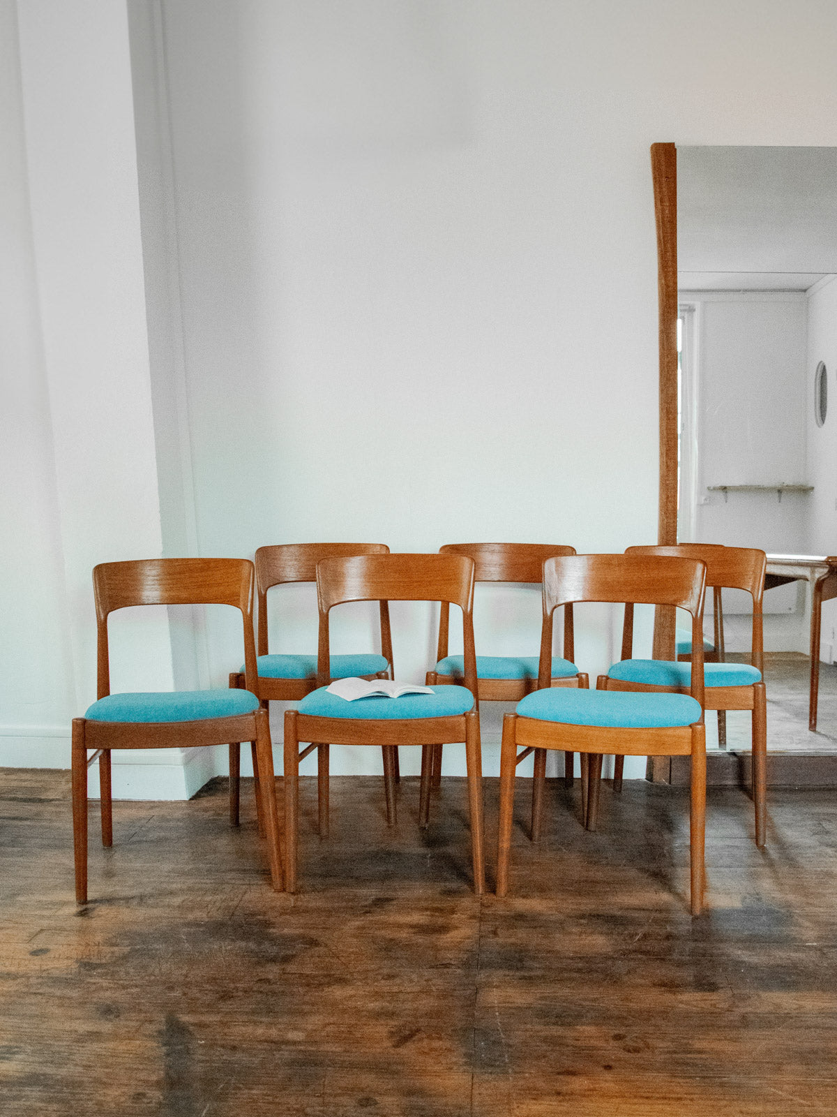 Découvrez ce lot de 6 chaises scandinaves en teck, créées par le designer danois Henning Kjærnulf pour Korpus Stolefabrik dans les années 60. Chaque chaise a été entièrement restaurée, avec structure, mousse et assise recouverte d’un tissu Casal Aquaclean effet velours bleu-vert, facile à nettoyer au quotidien. Leur design élégant et intemporel met en valeur le bois chaud du teck. Une réparation est visible sur un dossier, sans compromettre l’ensemble.