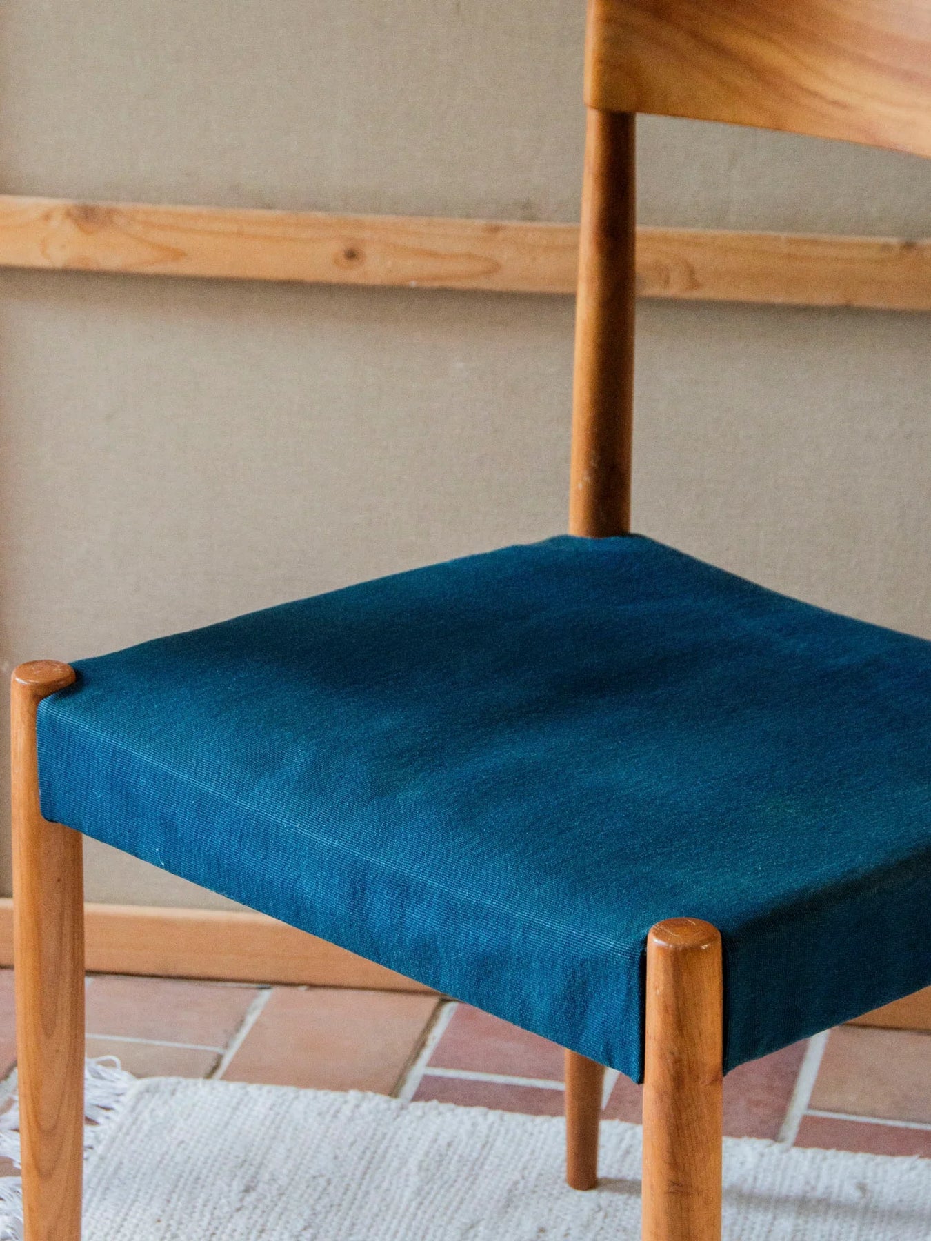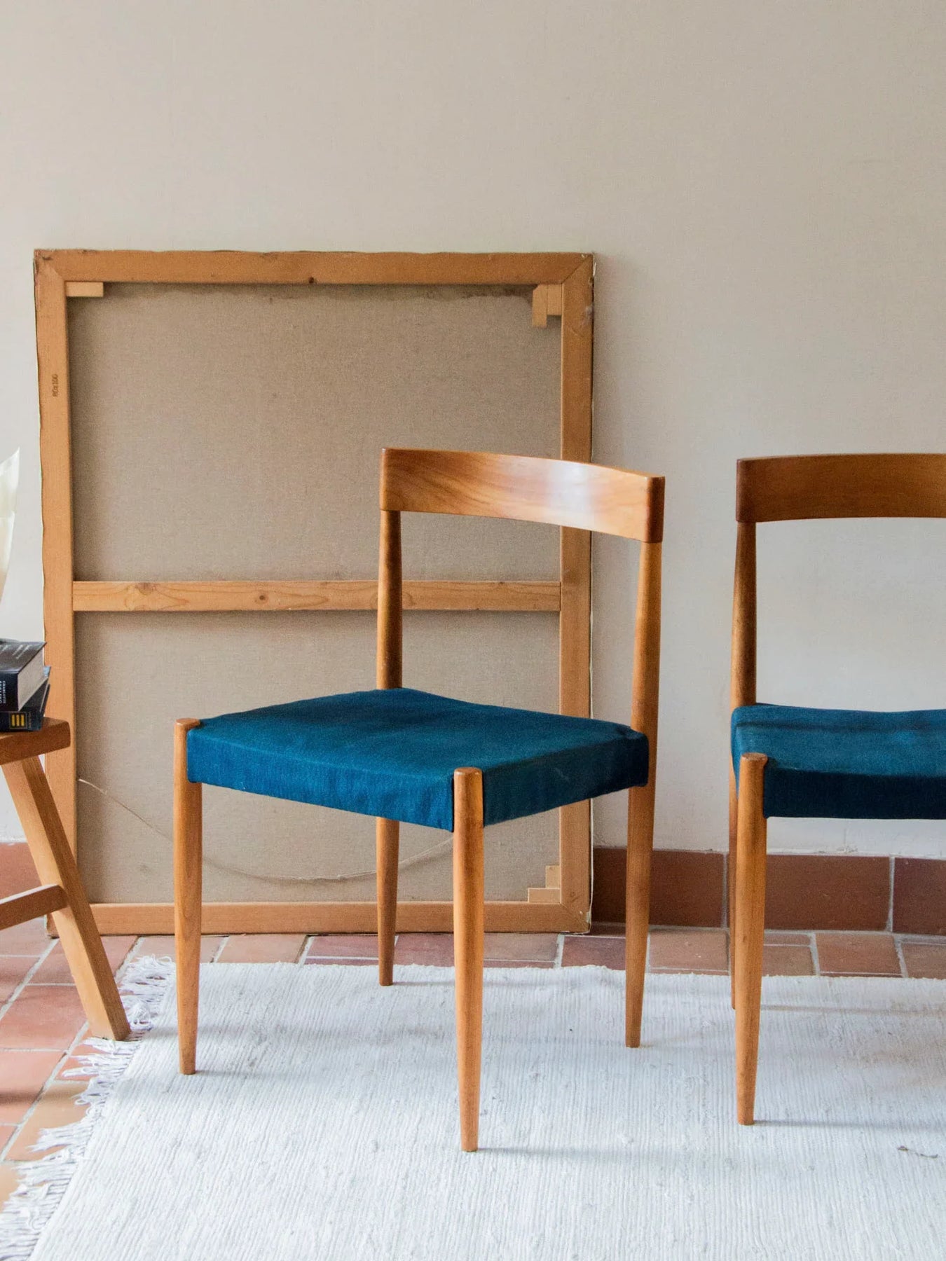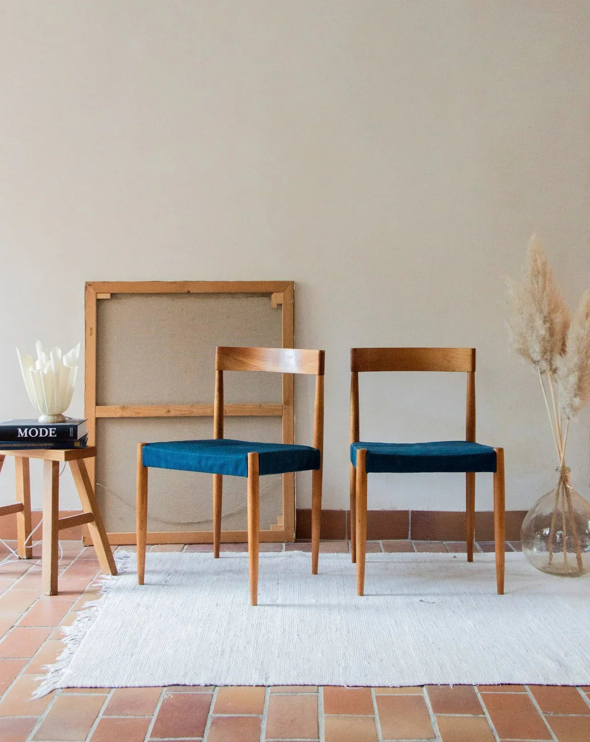 Découvrez notre paire de chaises scandinaves mid-century, alliant un design épuré à un confort inégalé. Leur dossier courbé et leurs lignes raffinées s’inspirent des créations emblématiques de Niels Otto Møller et de Lübke. Réalisées en teck blond, ces chaises sont habillées d'un tissu bleu canard, une combinaison de teintes à la fois élégante et audacieuse. Parfaites pour enrichir un petit coin repas, un bureau ou compléter une belle tablée, elles sont en bel état général et stables, prêtes à apporter une touche de style à votre intérieur.