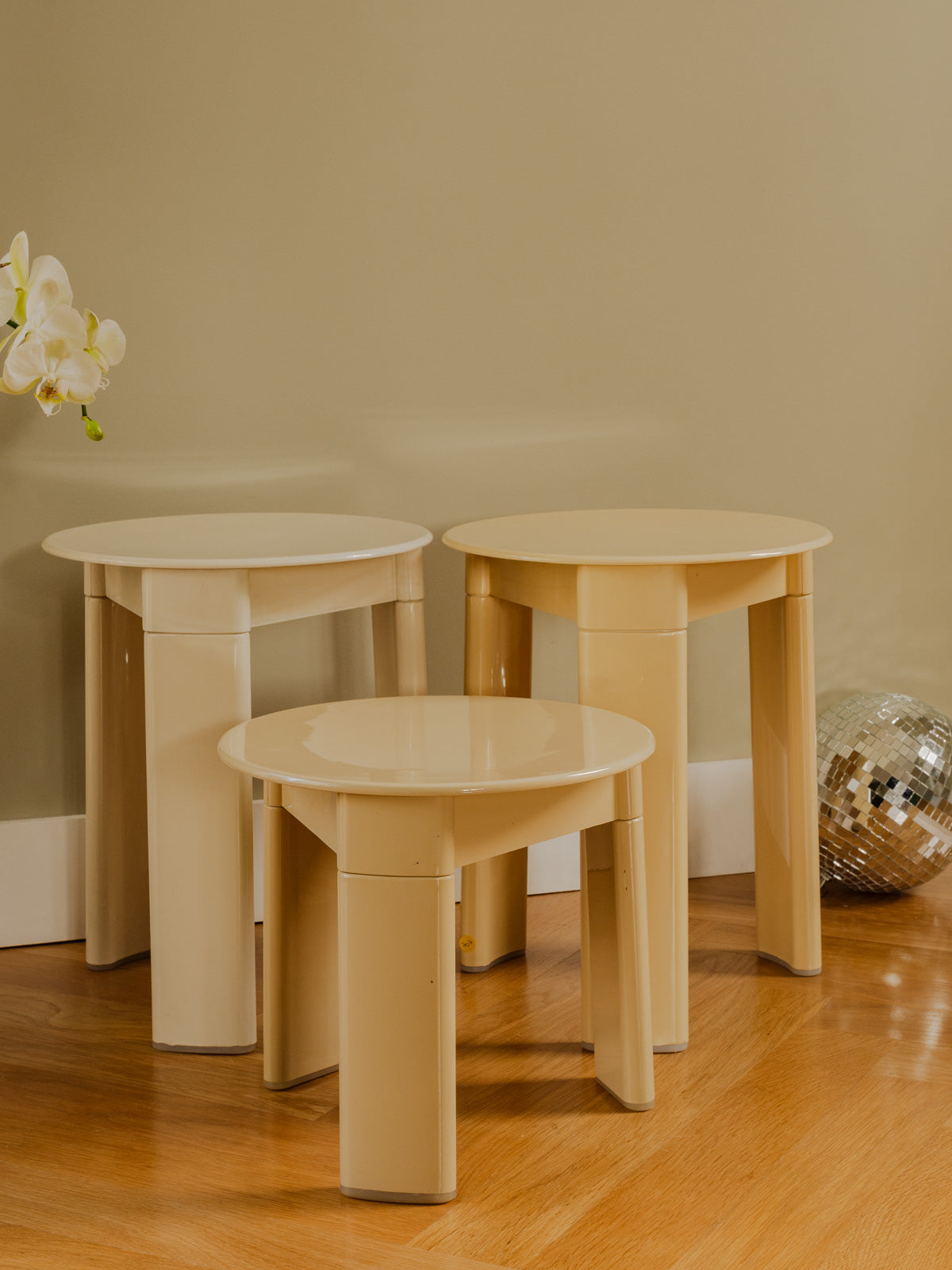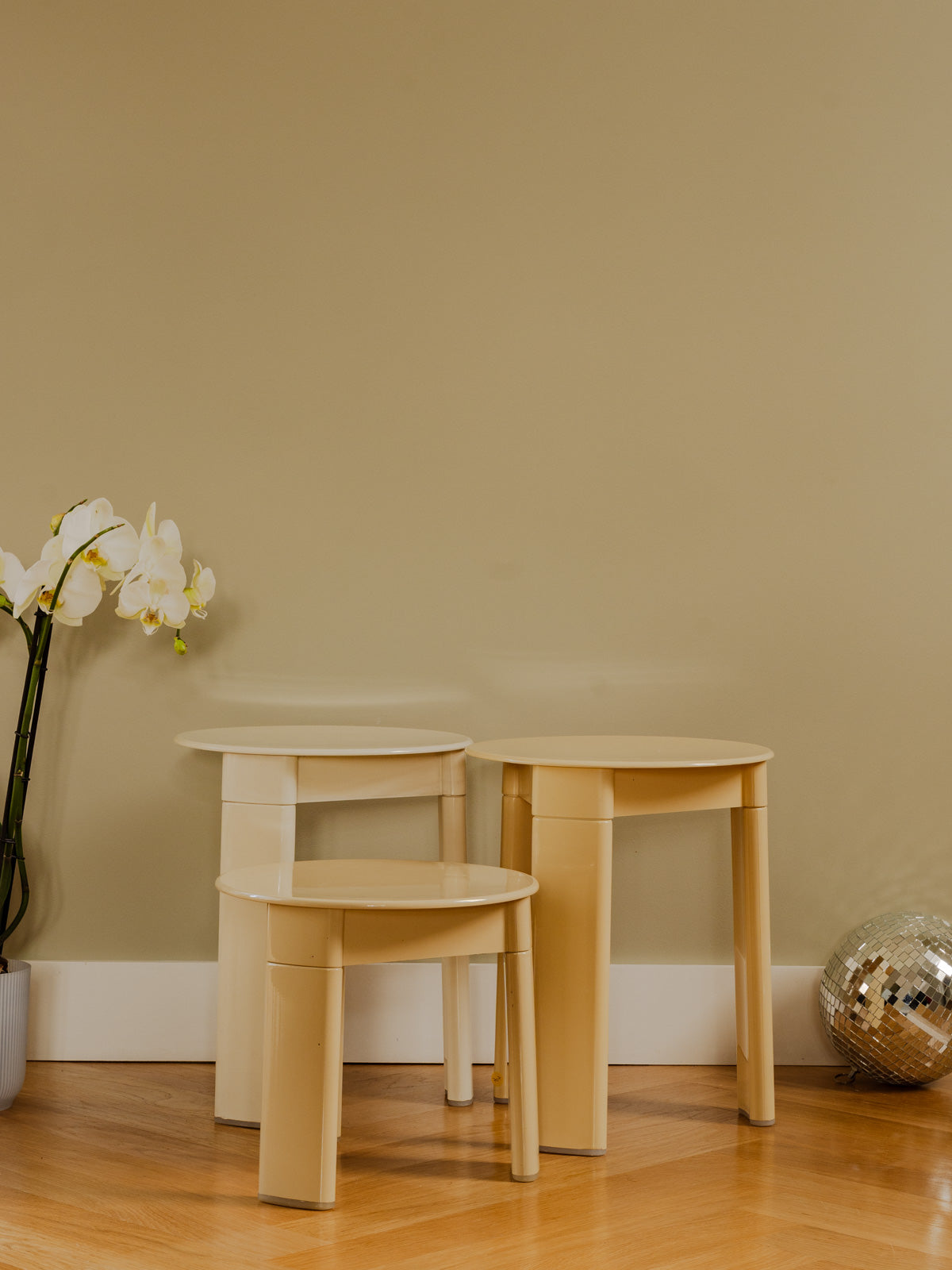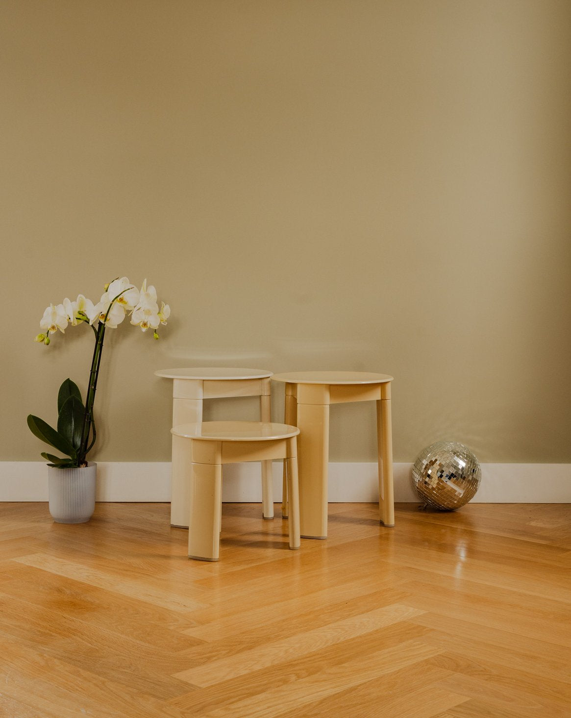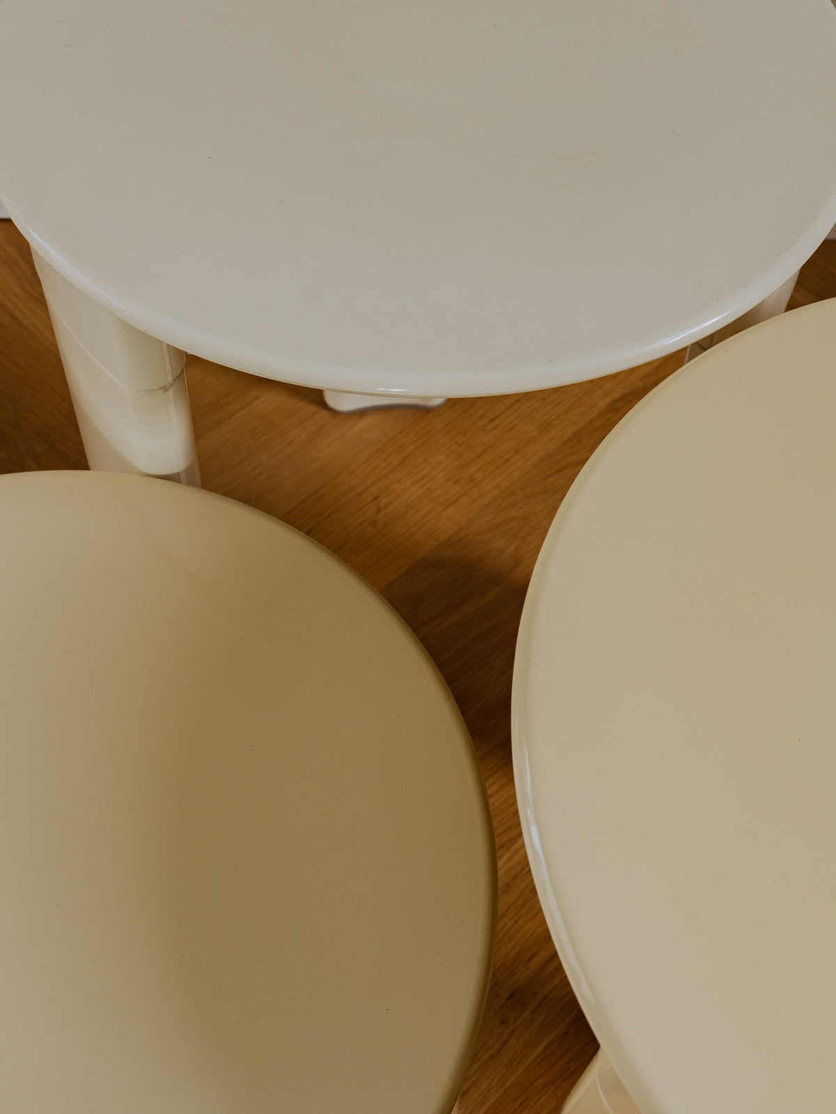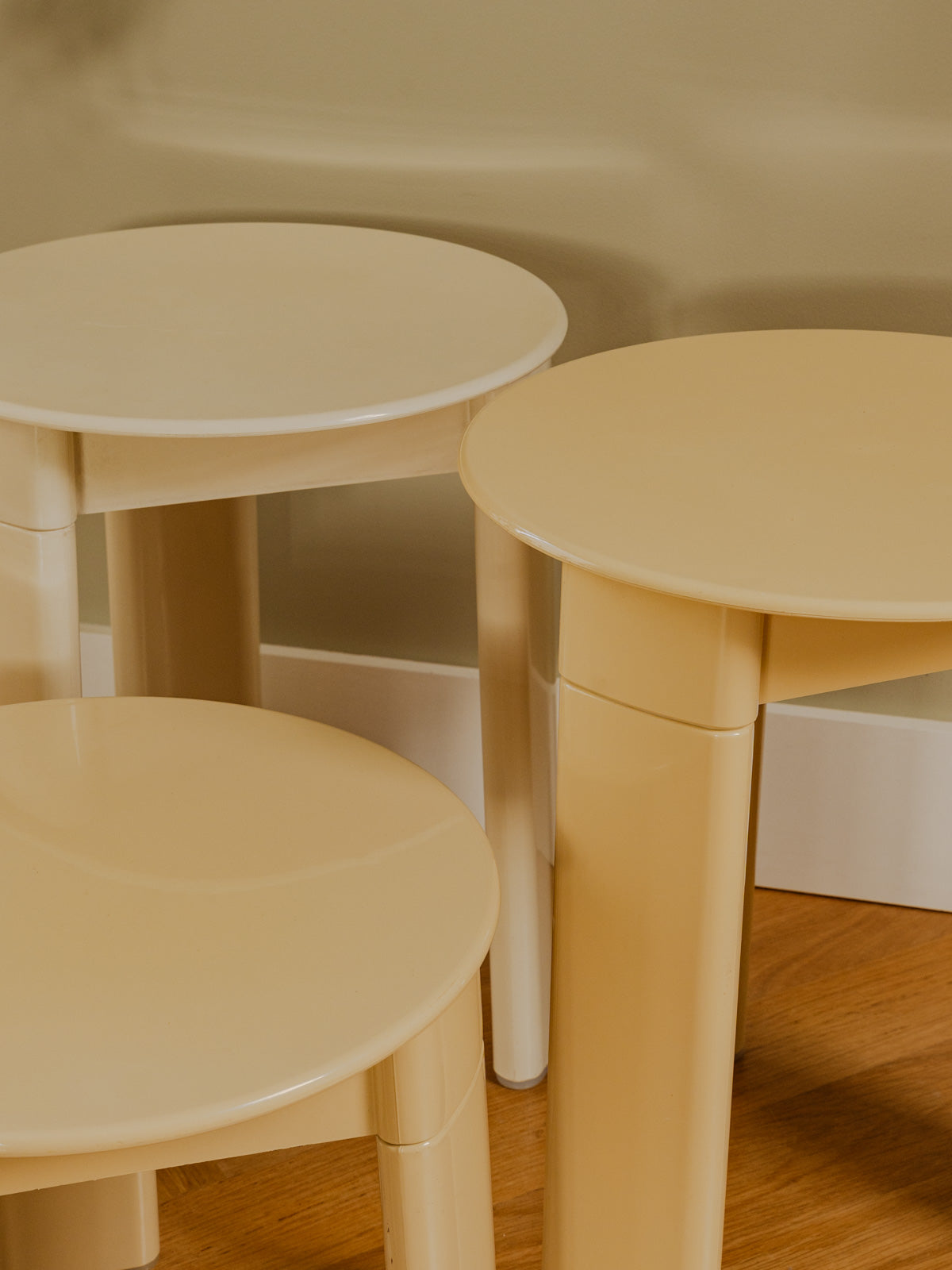 Découvrez ce lot de 3 tabourets en plastique, conçus par le talentueux designer autrichien Olaf Von Bohr et édités par Gedy. Chacun d'eux arbore une nuance unique, créant ainsi un ensemble harmonieux et contemporain. Polyvalents, ces tabourets peuvent également faire office de tables d'appoint pour une touche moderne dans votre espace. Bien qu'ils présentent quelques traces d'usage, ces petits détails ajoutent du caractère à ces pièces d'exception.
