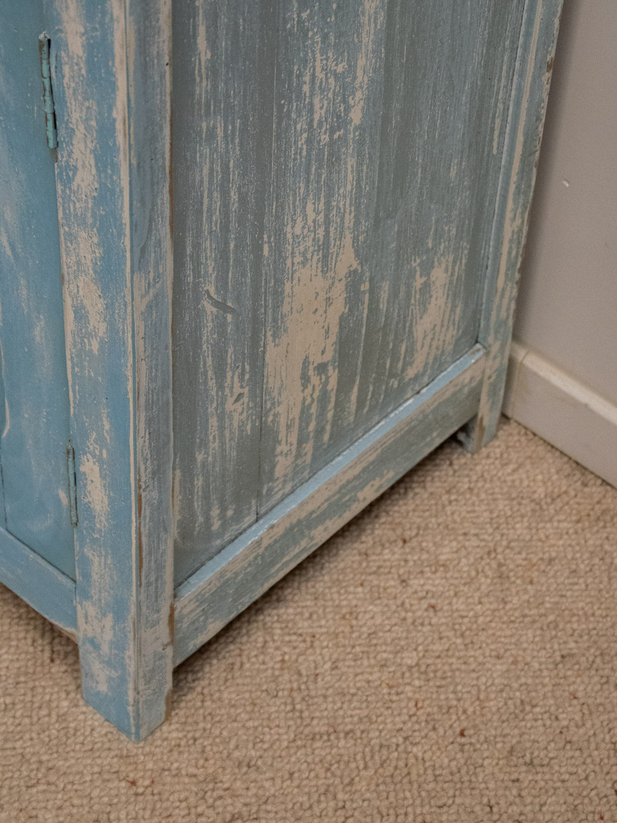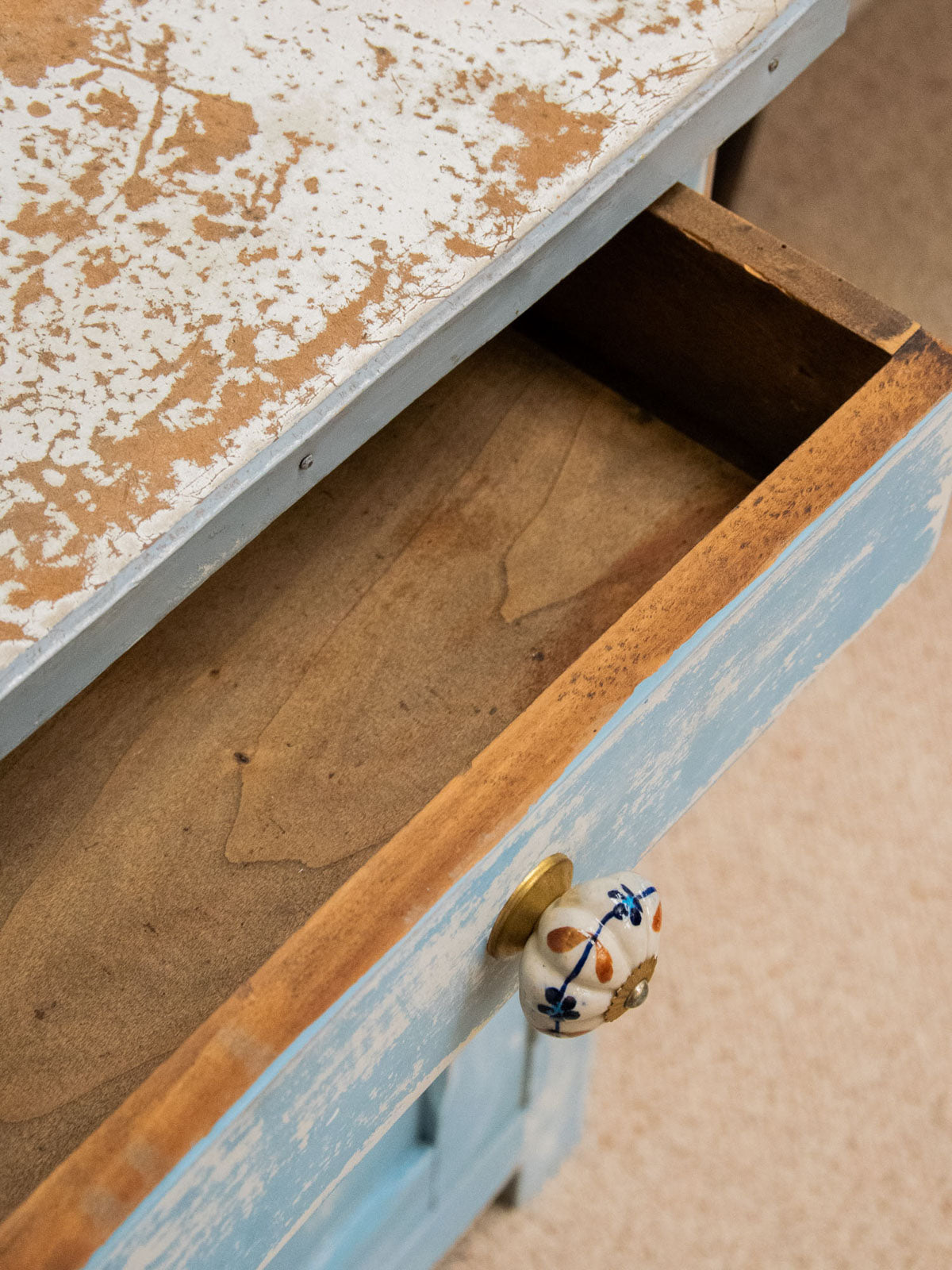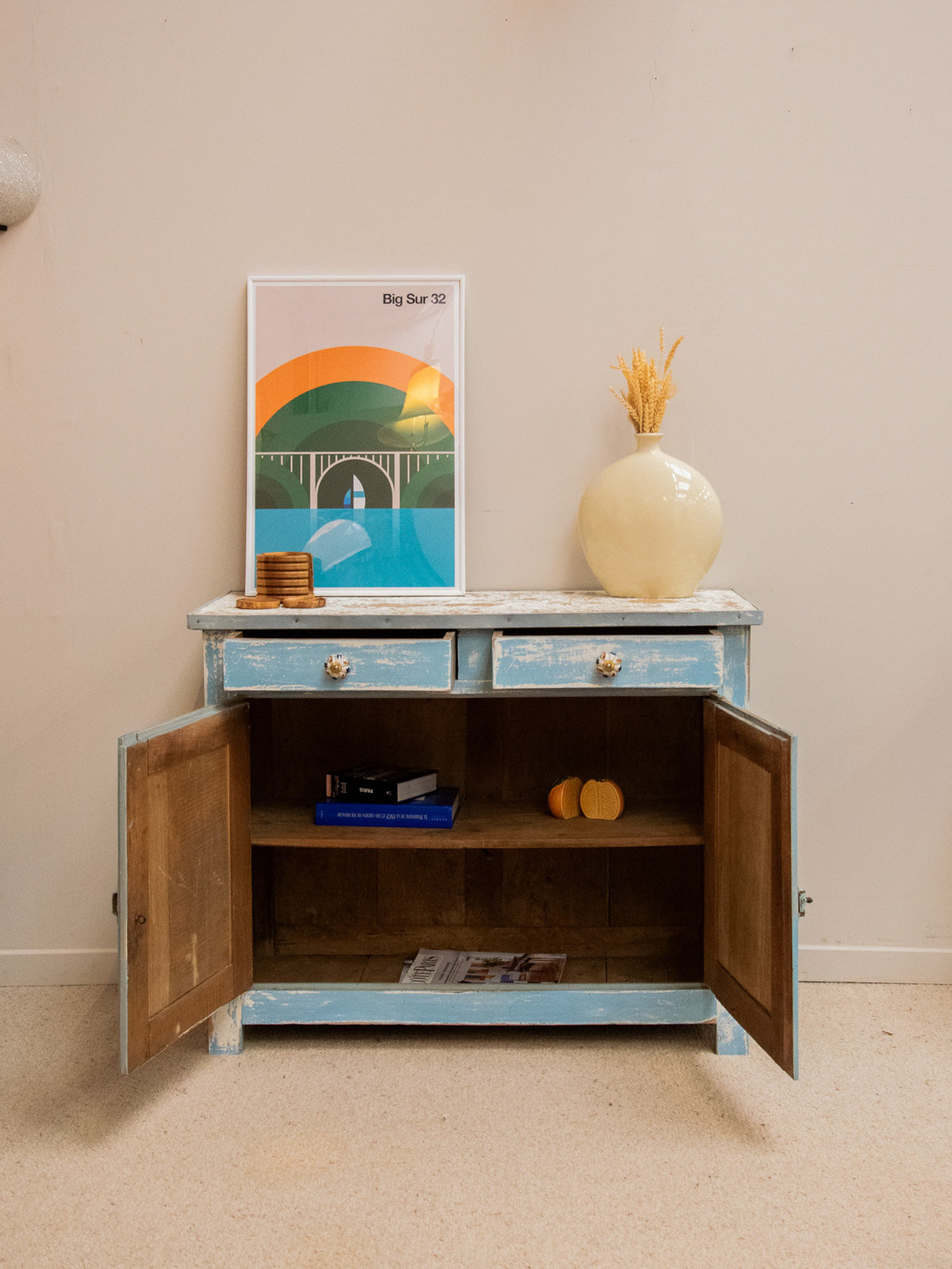 Apportez une touche de charme à votre intérieur avec ce petit buffet en bois peint patiné, alliant subtilement des nuances de bleu ciel et de blanc. Doté de deux portes et de deux tiroirs, il offre un espace de rangement pratique tout en restant esthétique. Son plateau patiné et ses poignées en céramique ajoutent une note d'élégance intemporelle à ce meuble, parfait pour une entrée ou un salon. Un choix idéal pour ceux qui souhaitent allier fonctionnalité et style. Quelques défauts à l'intérieur des tiroirs et sur l'ensemble qui n'enlève rien à son charme et à son utilité.