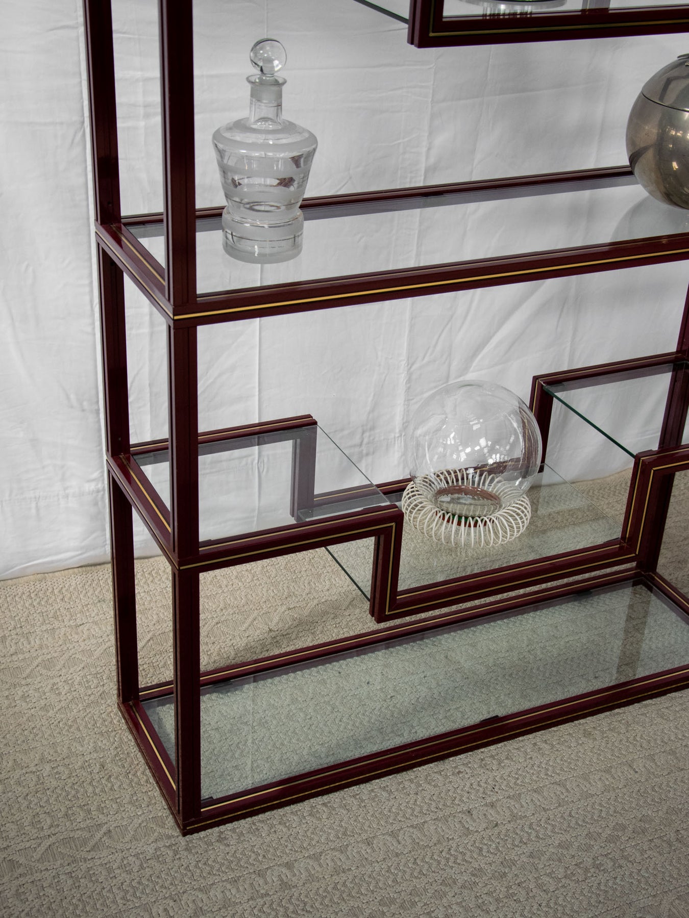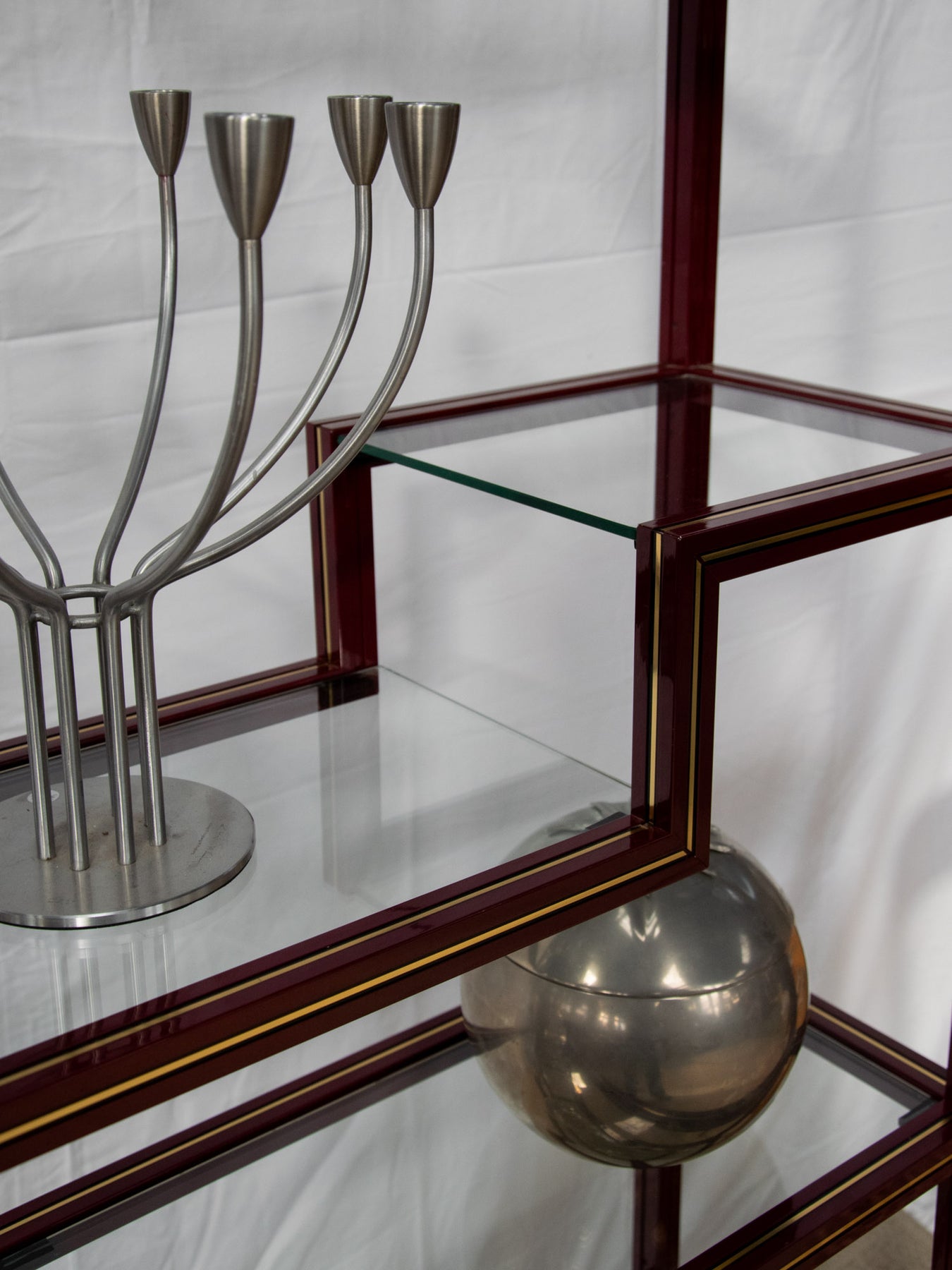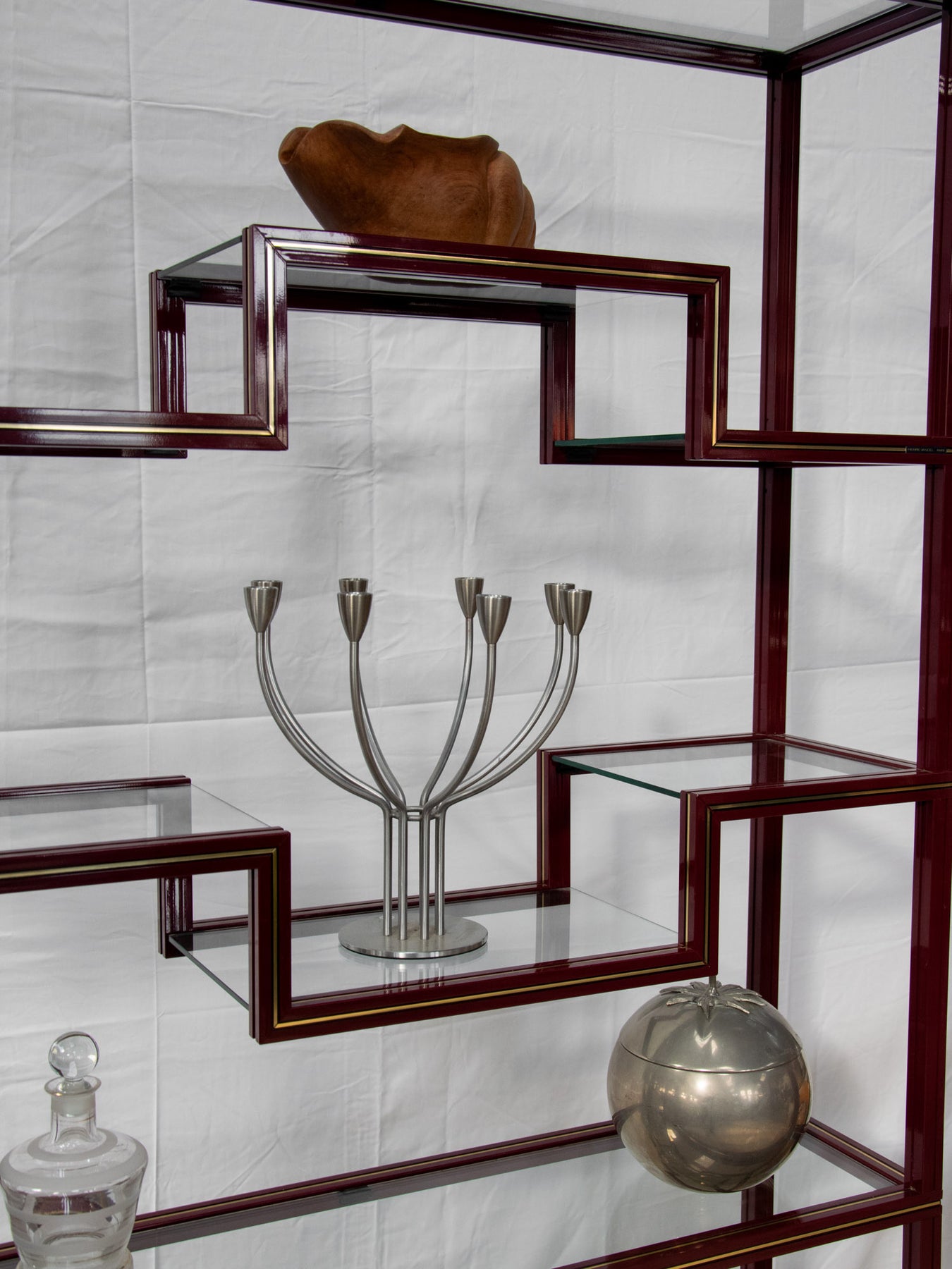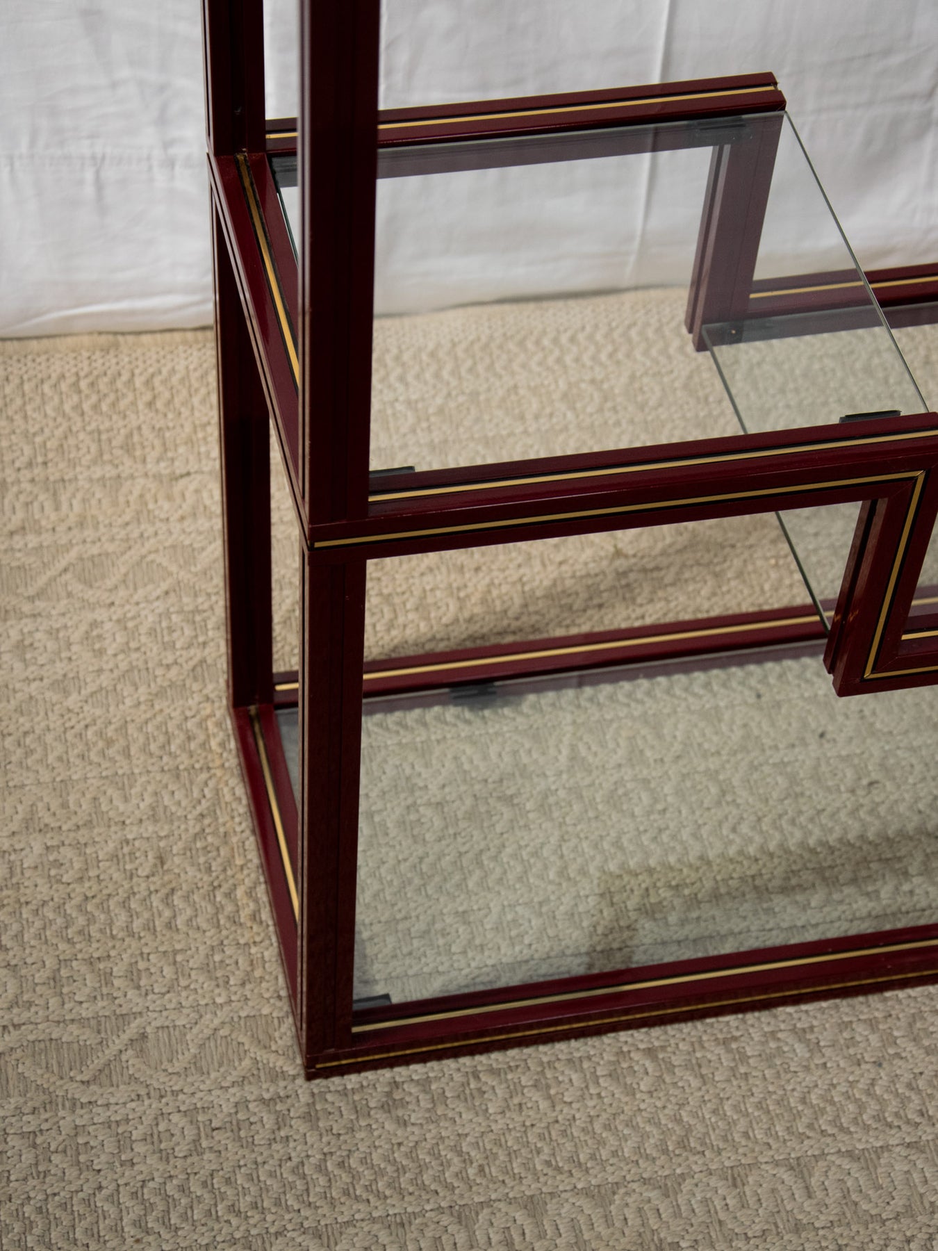 Découvrez l'élégante étagère bordeaux avec liseré doré, un véritable incontournable des années 80 signé par le designer Pierre Vandel. Ses plateaux en verre transparents apportent une touche de légèreté à votre intérieur, tout en offrant un espace de rangement idéal pour vos objets décoratifs. Avec son style chic et rétro, cette pièce saura sublimer votre décoration, alliant fonctionnalité et esthétisme. Un choix parfait pour ceux qui apprécient le design audacieux et intemporel. Hauteur variables entre les différents espaces d'étagères.