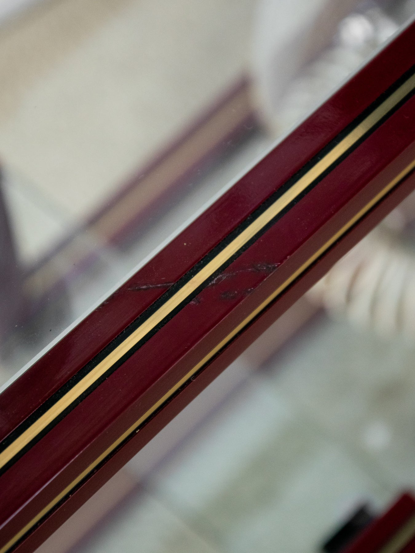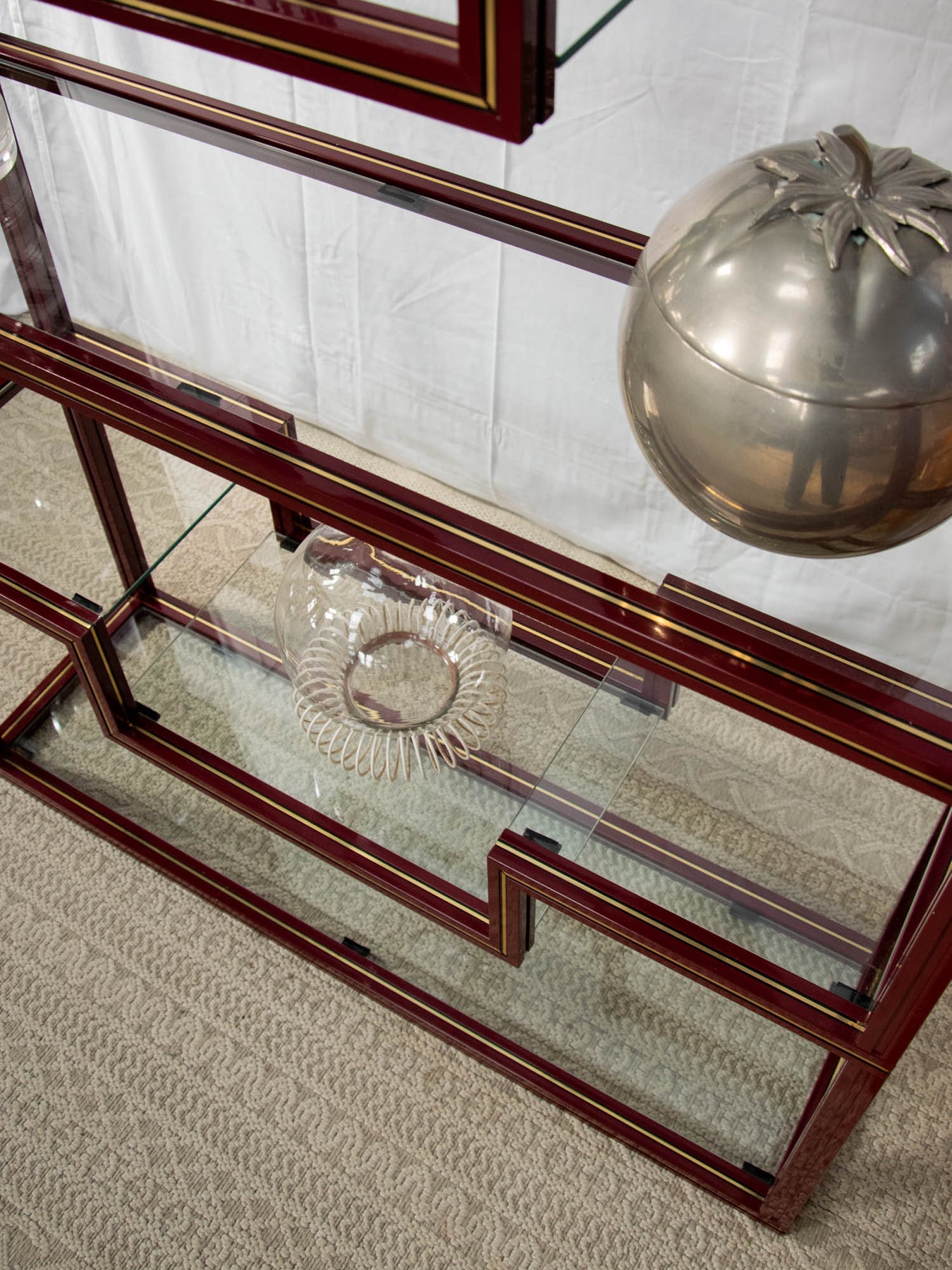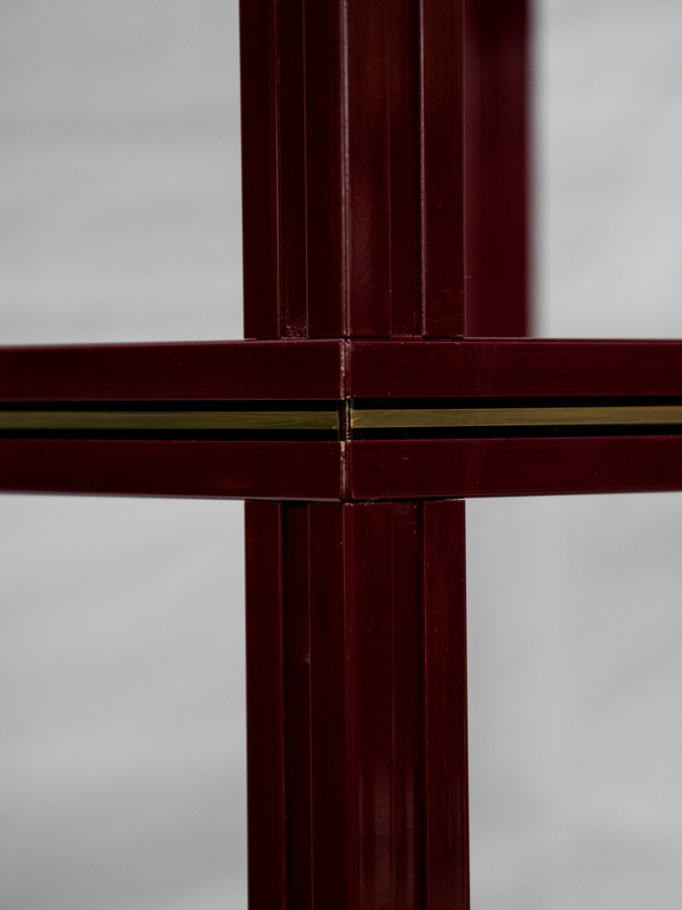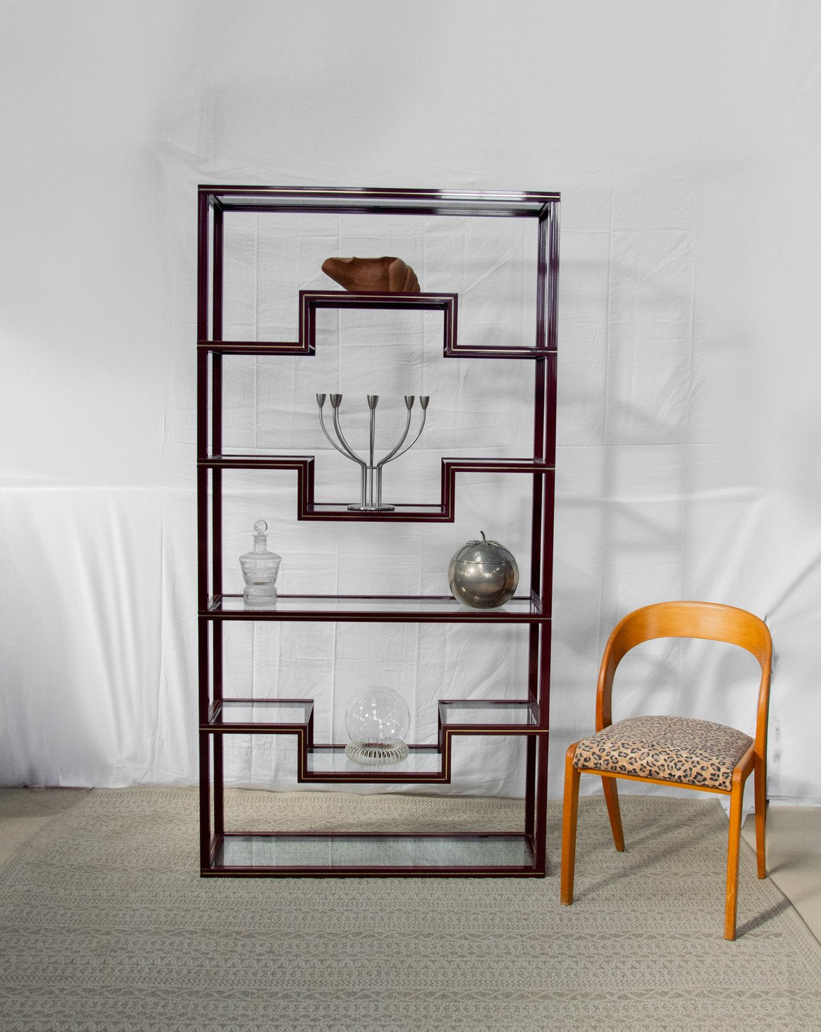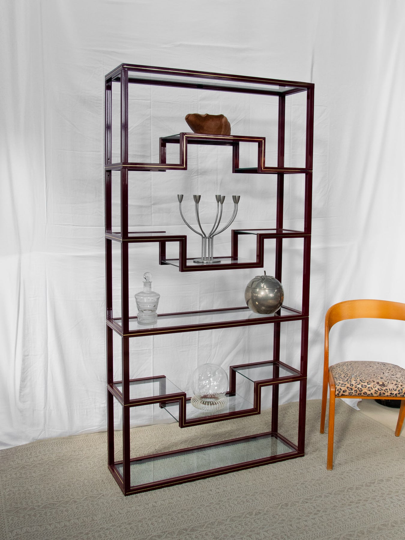 Découvrez l'élégante étagère bordeaux avec liseré doré, un véritable incontournable des années 80 signé par le designer Pierre Vandel. Ses plateaux en verre transparents apportent une touche de légèreté à votre intérieur, tout en offrant un espace de rangement idéal pour vos objets décoratifs. Avec son style chic et rétro, cette pièce saura sublimer votre décoration, alliant fonctionnalité et esthétisme. Un choix parfait pour ceux qui apprécient le design audacieux et intemporel. Hauteur variables entre les différents espaces d'étagères.