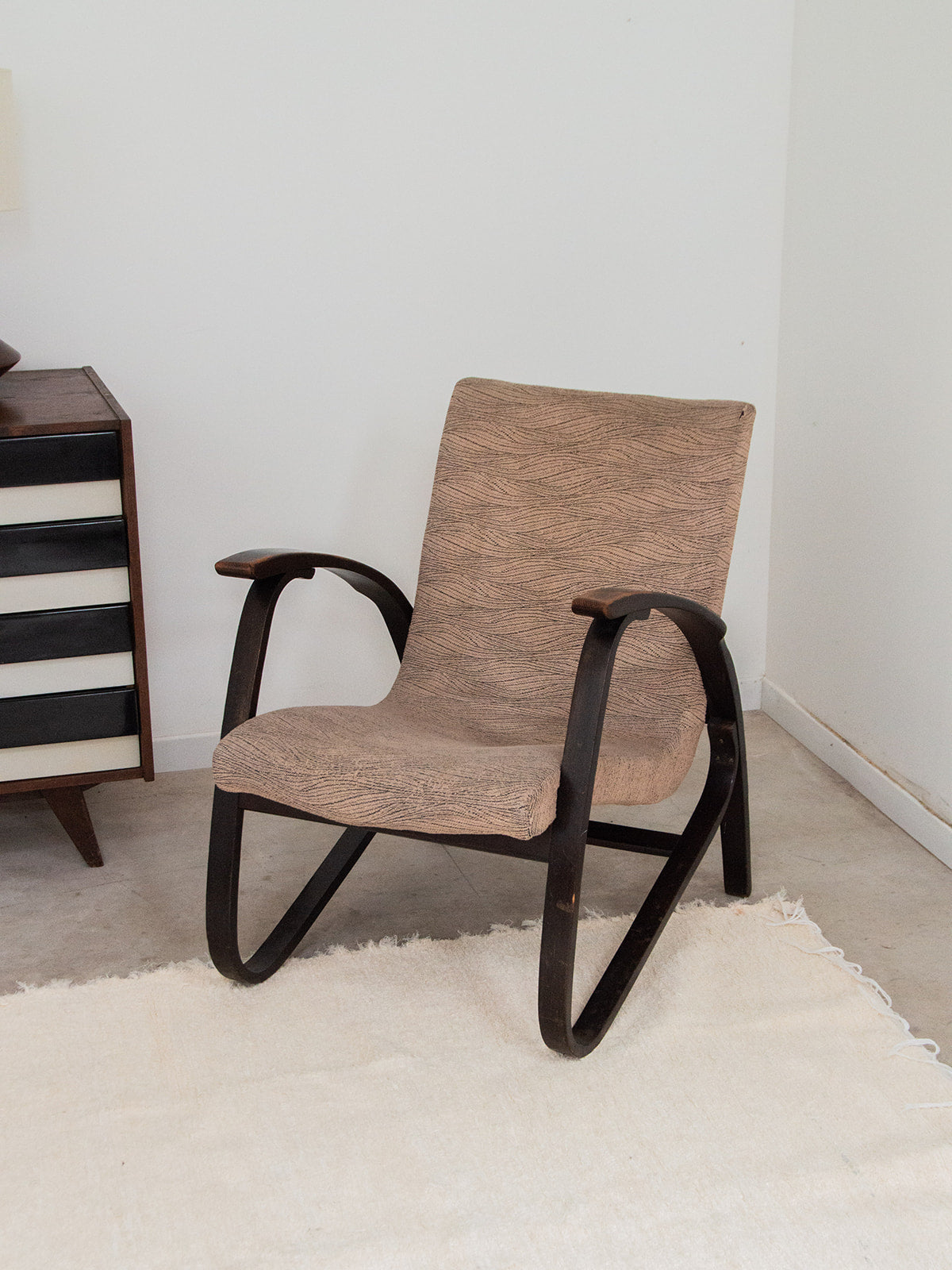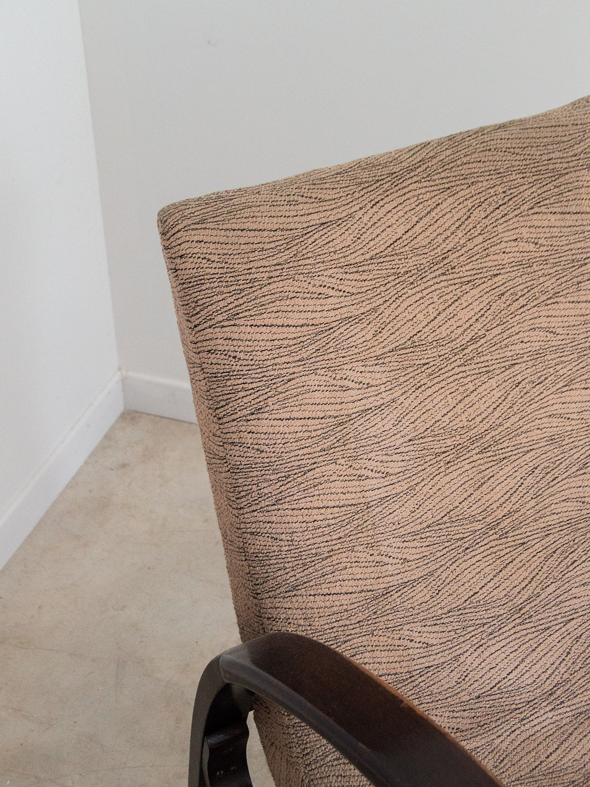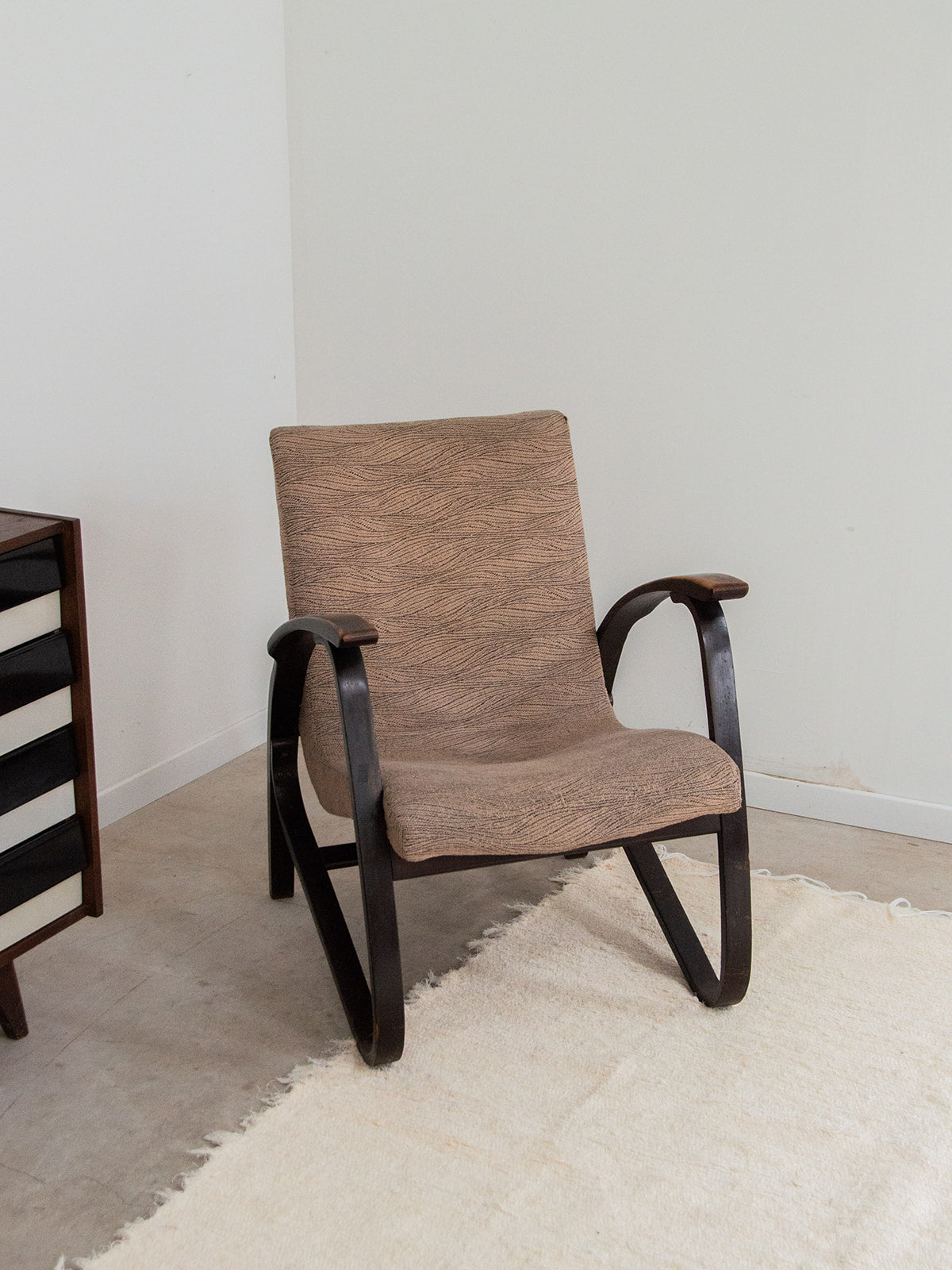 Découvrez ce fauteuil en bois foncé signé Jan Vanek, une pièce unique alliant confort et style. Bien que des traces d’usure sont présentes sur les accotoirs, son assise et son dossier en tissu continu beige/zébré apportent une touche d'élégance à votre intérieur. Idéal pour créer une ambiance chaleureuse, ce fauteuil s’intégrera parfaitement dans votre décoration. Offrez-vous un moment de détente dans ce mobilier au charme authentique.