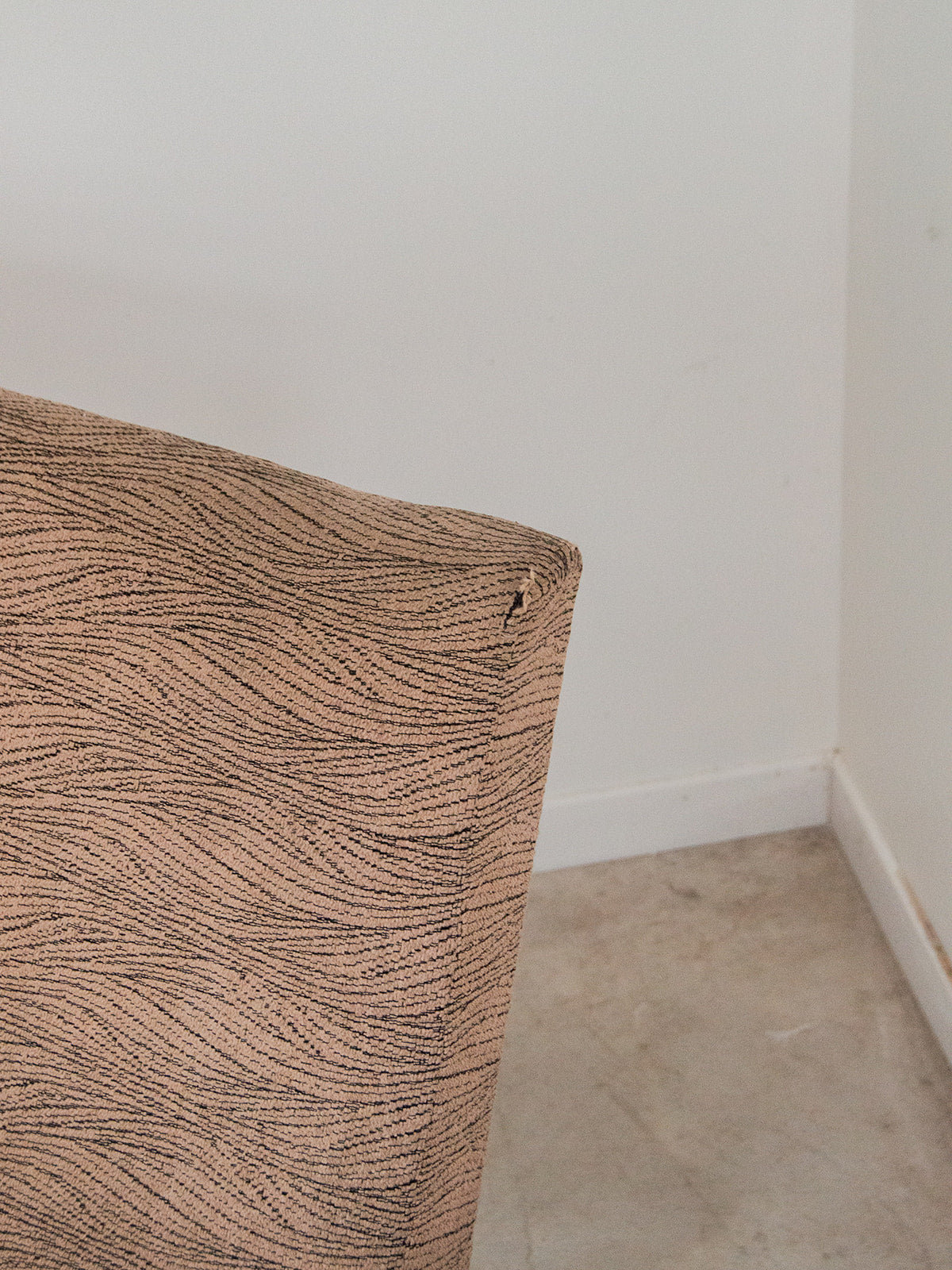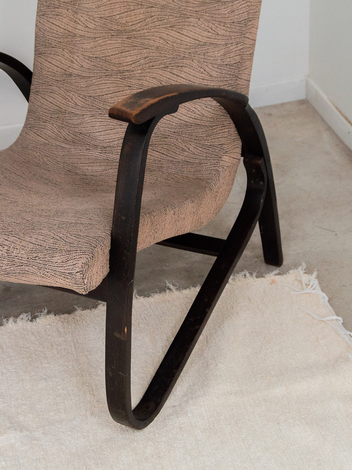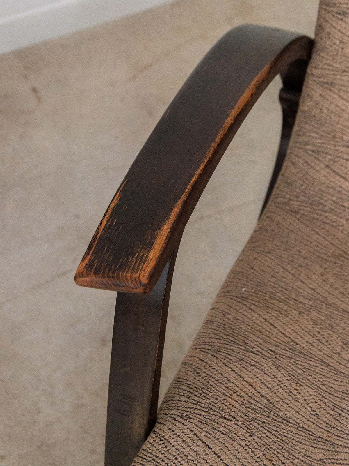 Découvrez ce fauteuil en bois foncé signé Jan Vanek, une pièce unique alliant confort et style. Bien que des traces d’usure sont présentes sur les accotoirs, son assise et son dossier en tissu continu beige/zébré apportent une touche d'élégance à votre intérieur. Idéal pour créer une ambiance chaleureuse, ce fauteuil s’intégrera parfaitement dans votre décoration. Offrez-vous un moment de détente dans ce mobilier au charme authentique.