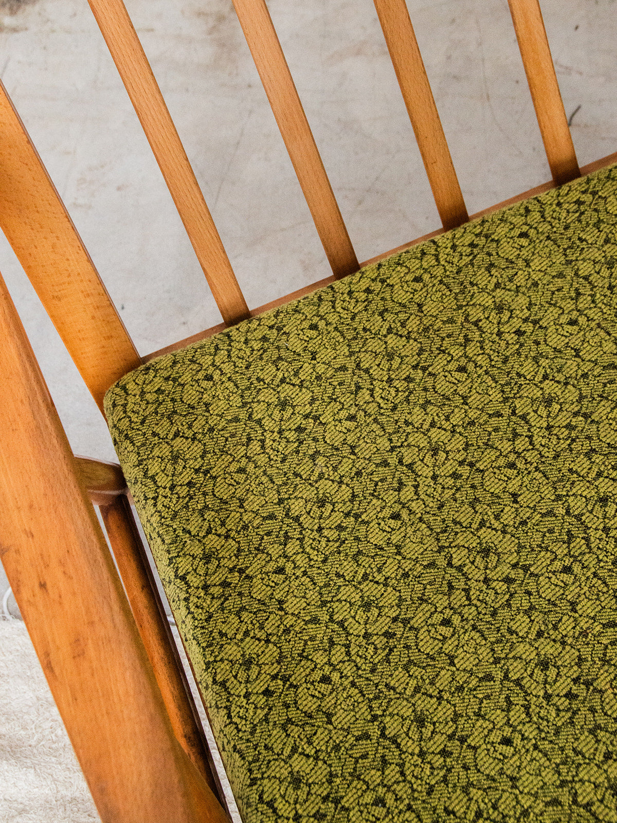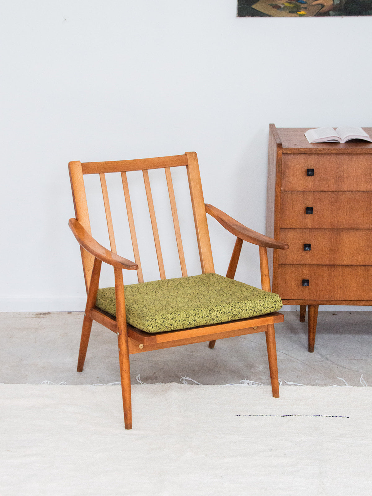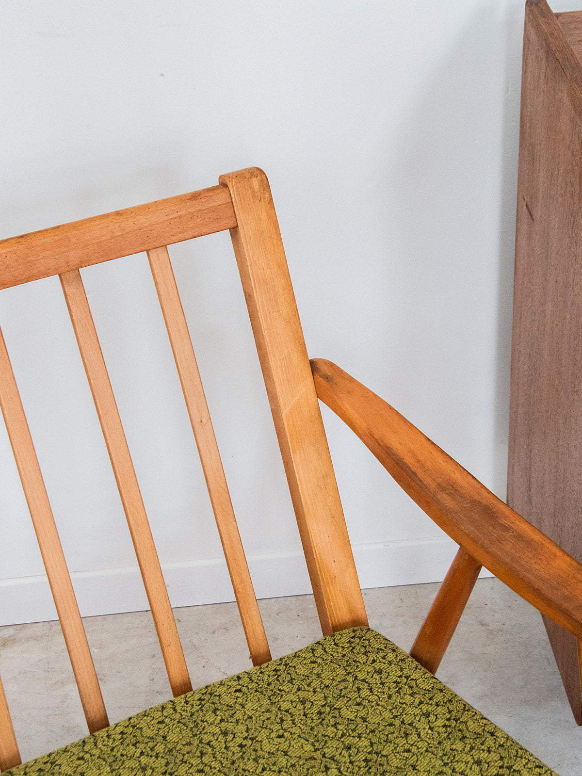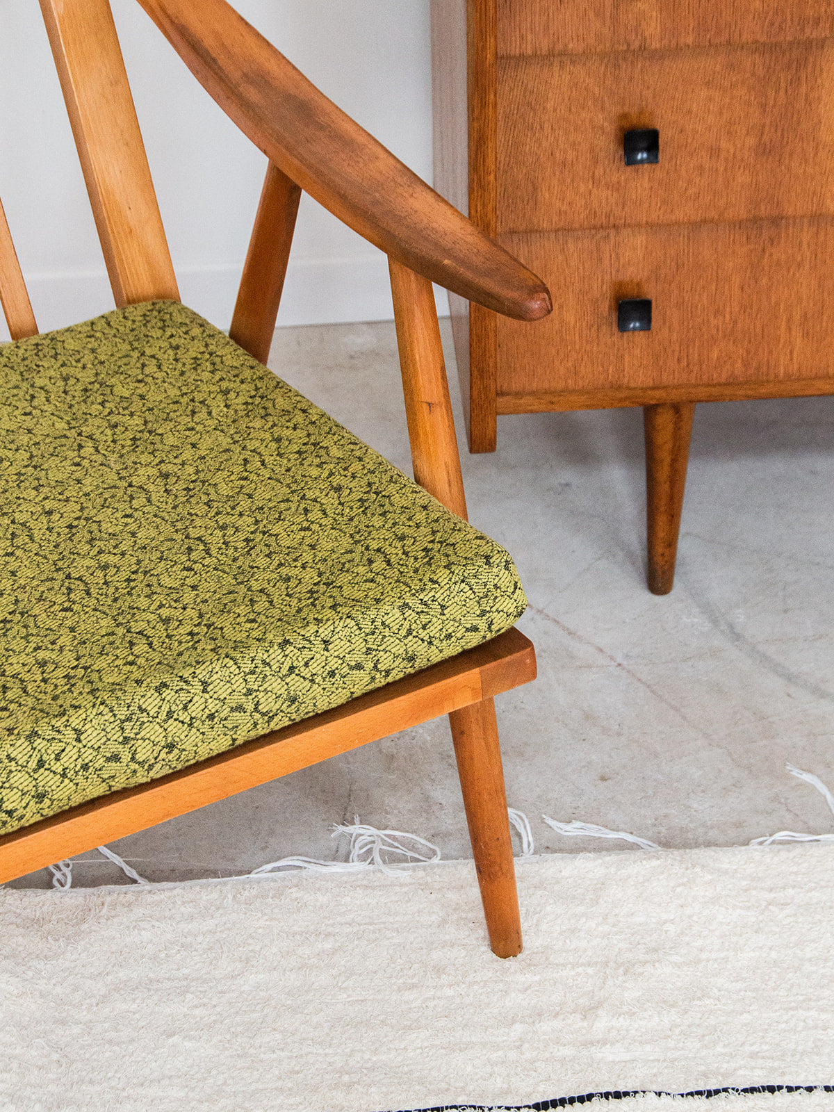 Apportez confort et caractère à votre intérieur avec ce fauteuil en bois clair et son tissu vert. Son dossier droit et ses accotoirs légèrement incurvés allient élégance et ergonomie. Chaque fauteuil présente des traces d’usure uniques, qui renforcent son charme et son authenticité. Une pièce chaleureuse qui s’intègre parfaitement dans un salon ou un coin lecture.