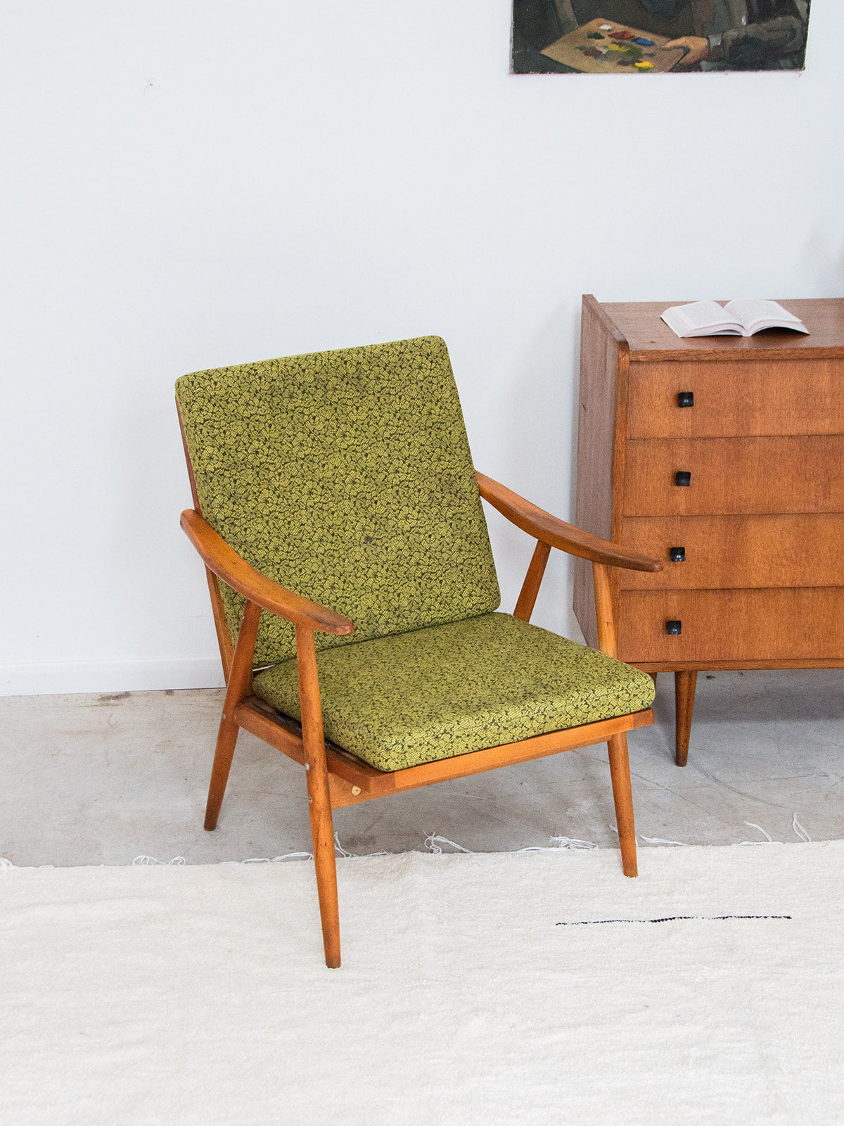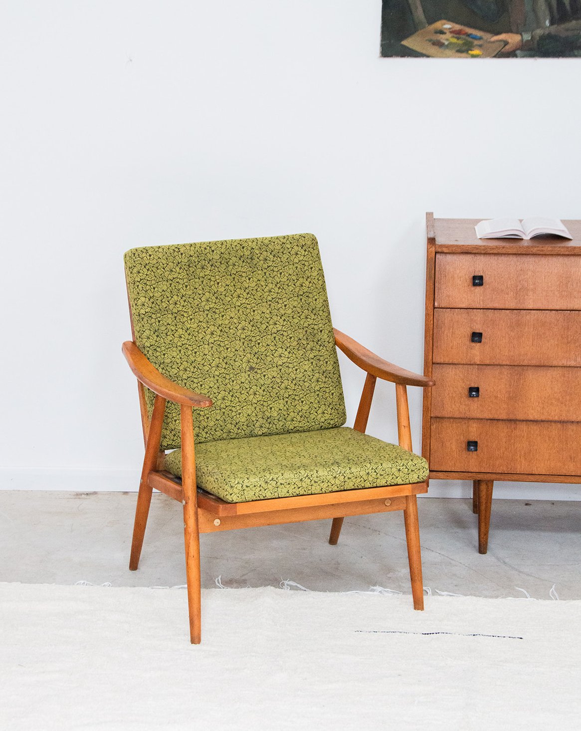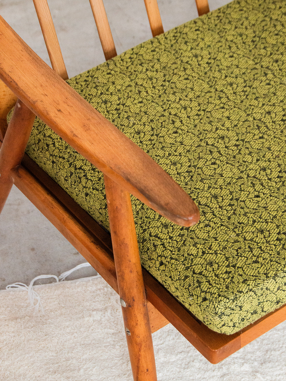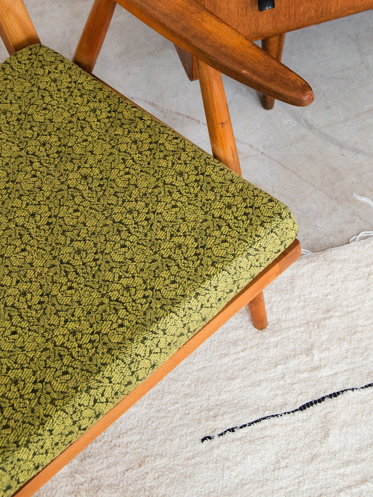 Apportez confort et caractère à votre intérieur avec ce fauteuil en bois clair et son tissu vert. Son dossier droit et ses accotoirs légèrement incurvés allient élégance et ergonomie. Chaque fauteuil présente des traces d’usure uniques, qui renforcent son charme et son authenticité. Une pièce chaleureuse qui s’intègre parfaitement dans un salon ou un coin lecture.