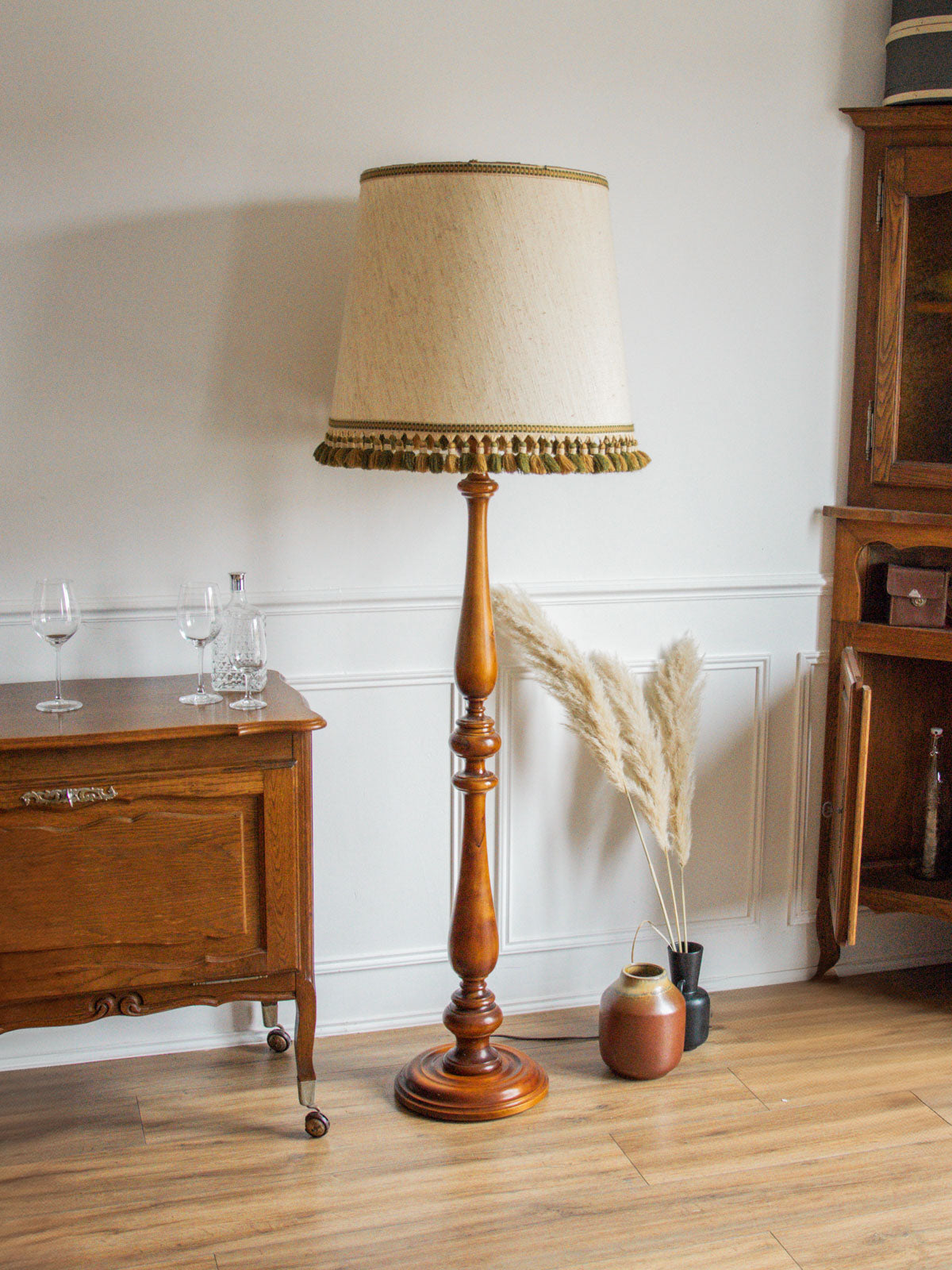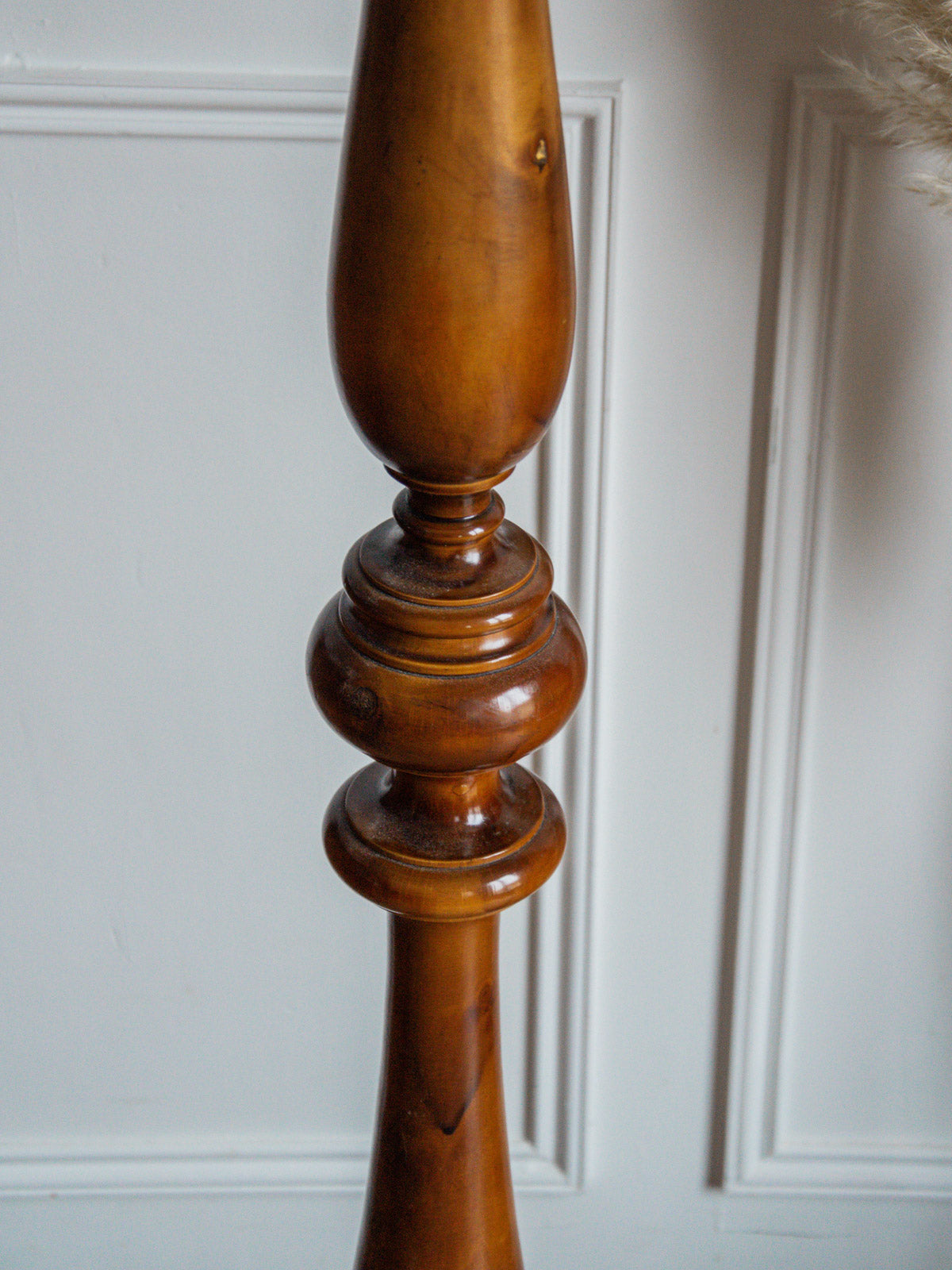 Apportez une touche d'élégance à votre intérieur avec ce lampadaire en bois verni, alliant esthétisme et fonctionnalité. Son liseré finement tissé, présente un léger accroc, il diffuse une lumière agréable et chaleureuse. Parfait pour embellir un coin lecture ou mettre en valeur un espace de vie, ce lampadaire s’intègre harmonieusement dans tous les styles de décoration. Un choix idéal pour ceux qui recherchent un éclairage chic et une ambiance chaude.