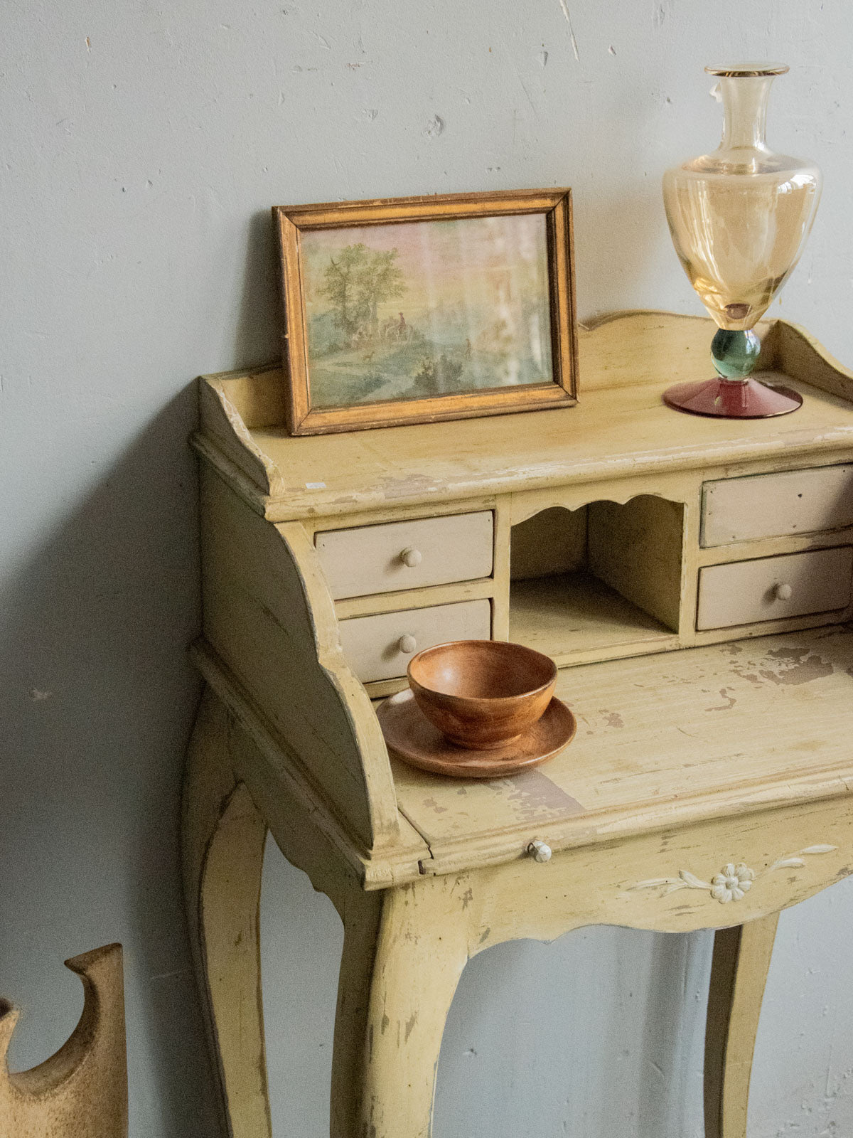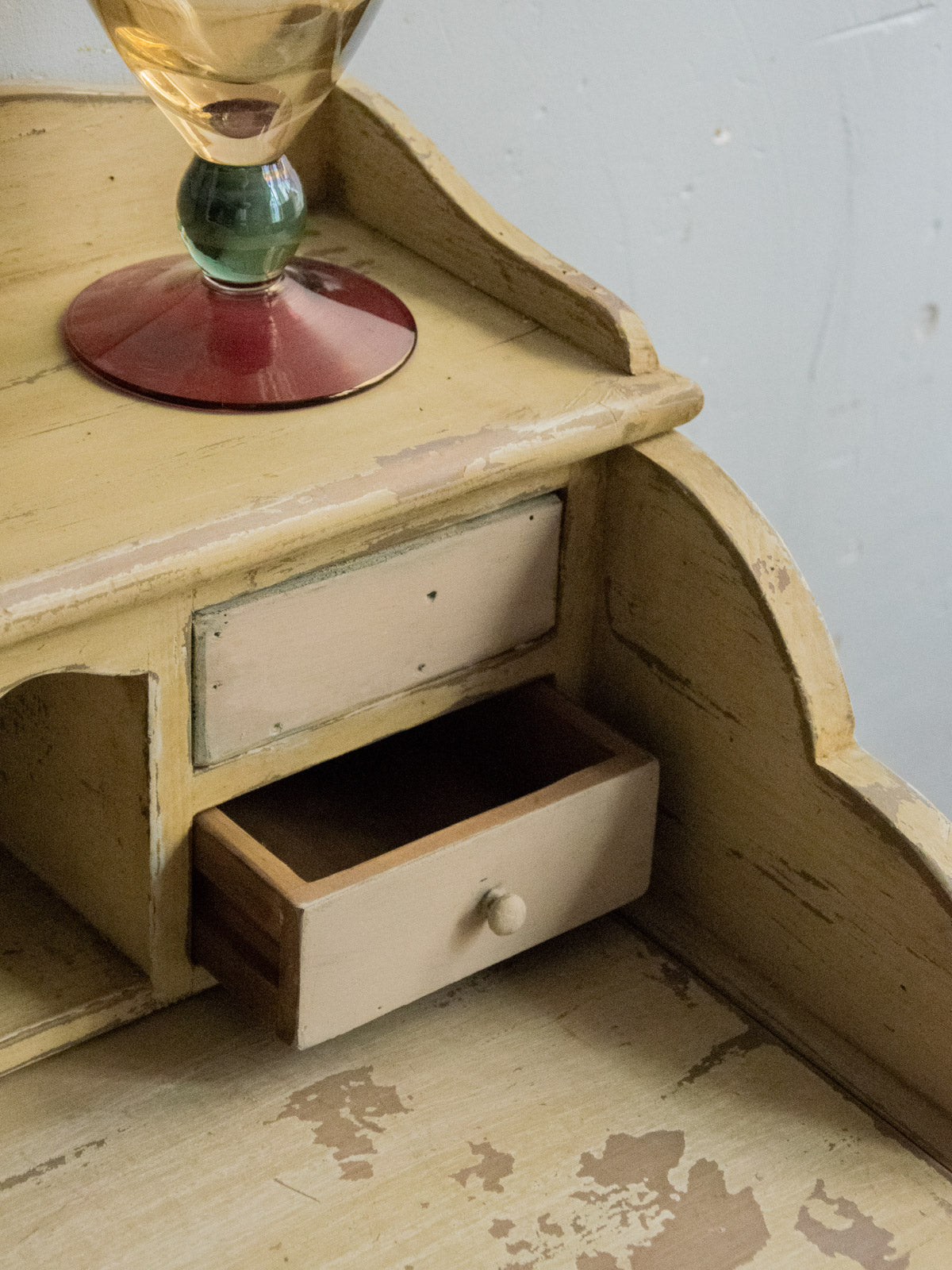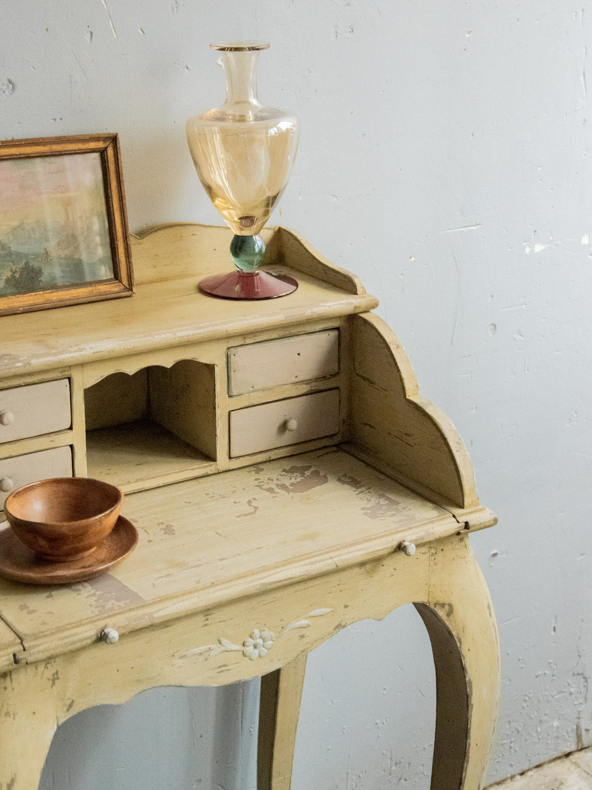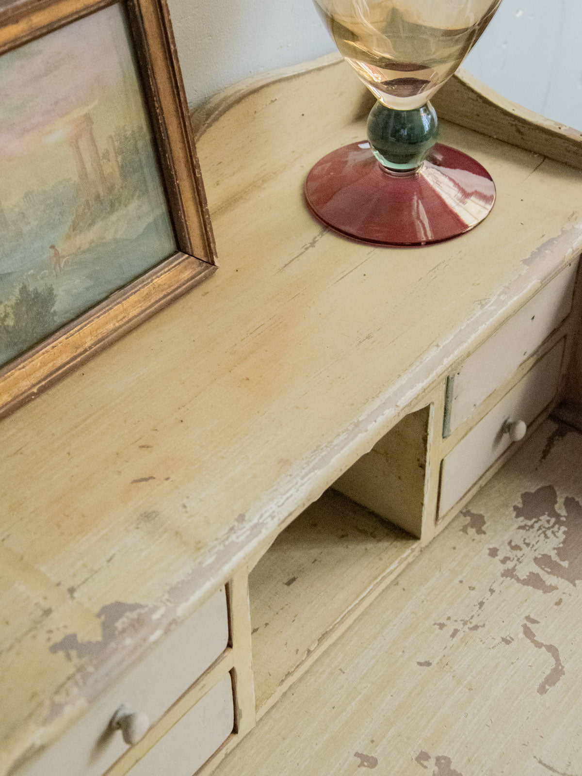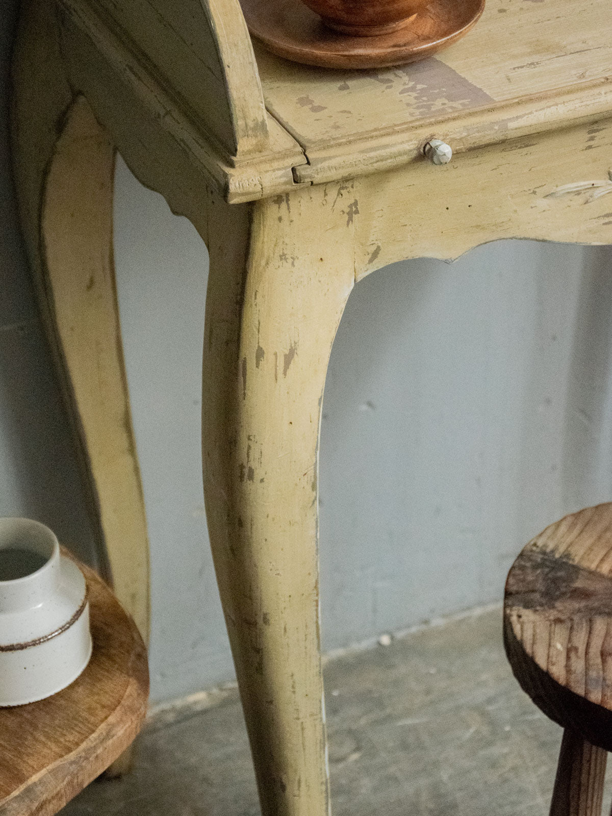 Découvrez notre charmante petite coiffeuse étroite en bois, revêtue d'un élégant vert qui apporte une touche de fraîcheur à votre intérieur. Avec ses pieds incurvés au design délicat, elle allie à la perfection esthétisme et fonctionnalité. Des usures présentes témoignent de son caractère vintage et ajoutent une histoire unique à ce meuble. Idéale pour aménager un coin beauté dans un espace réduit, cette coiffeuse saura séduire les amateurs de décoration authentique.