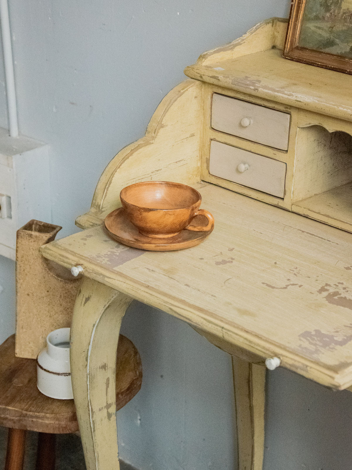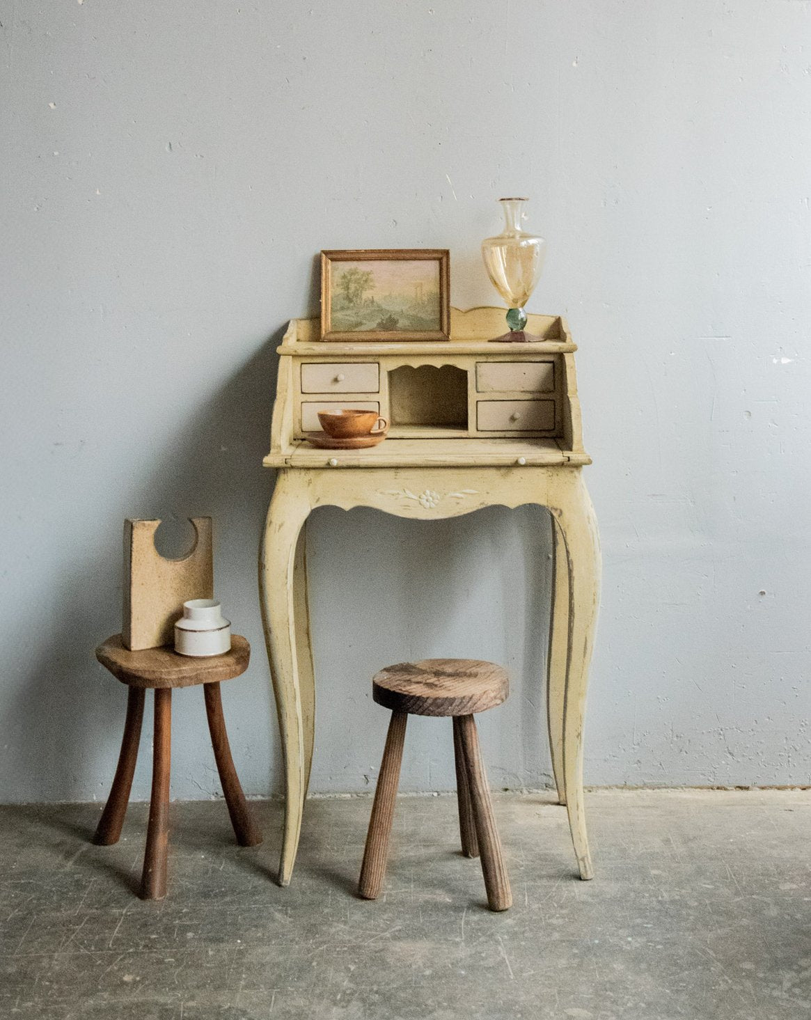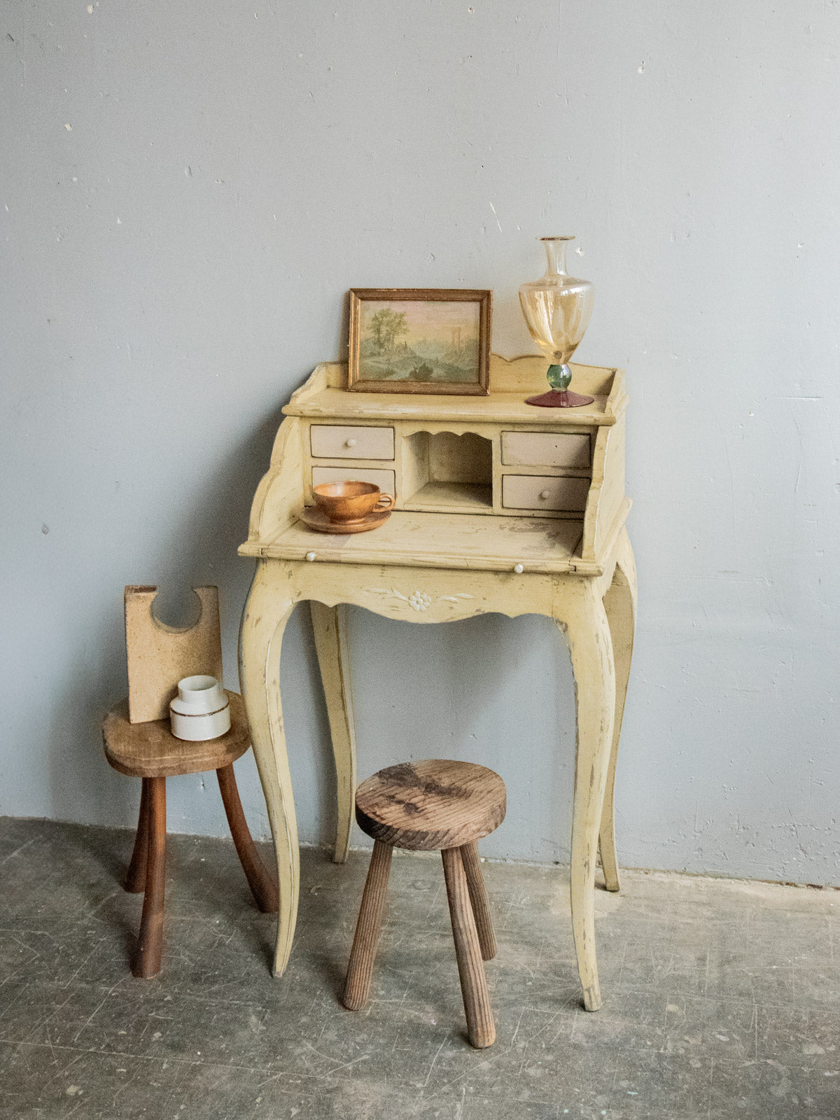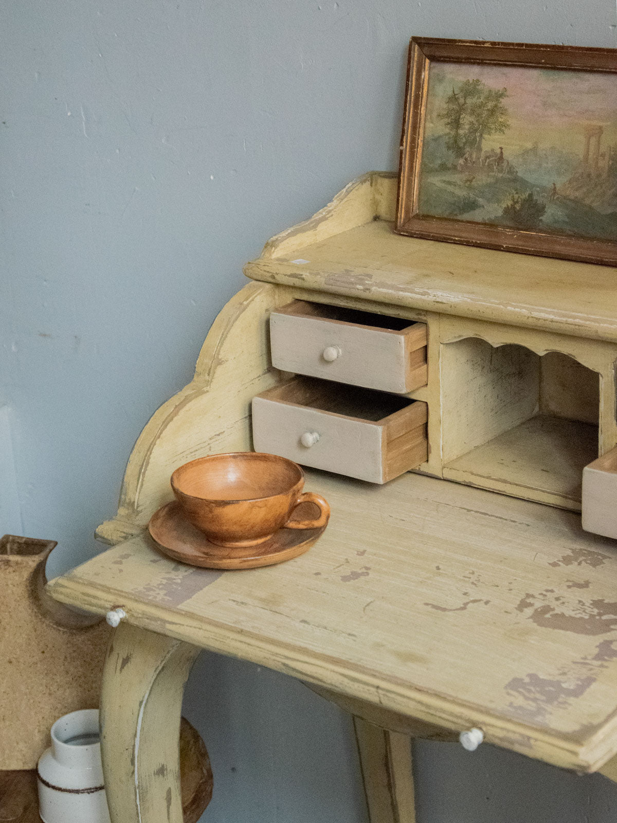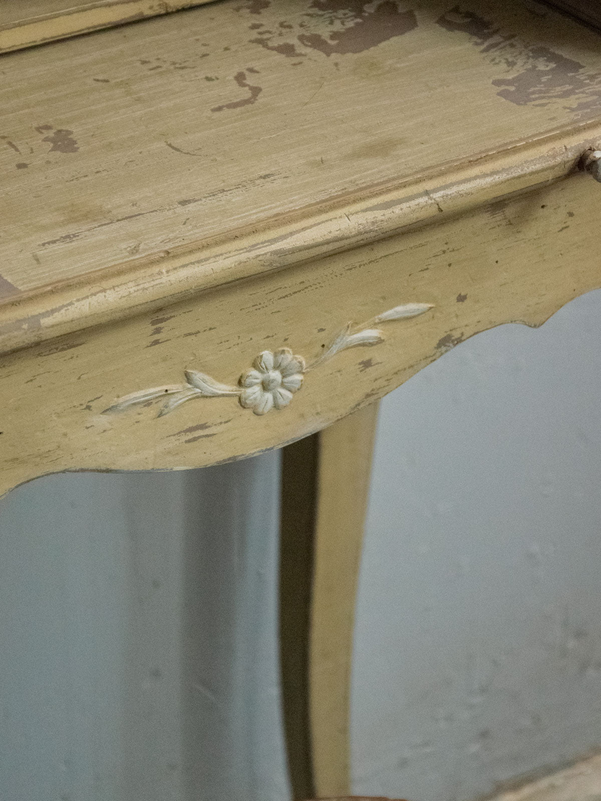 Découvrez notre charmante petite coiffeuse étroite en bois, revêtue d'un élégant vert qui apporte une touche de fraîcheur à votre intérieur. Avec ses pieds incurvés au design délicat, elle allie à la perfection esthétisme et fonctionnalité. Des usures présentes témoignent de son caractère vintage et ajoutent une histoire unique à ce meuble. Idéale pour aménager un coin beauté dans un espace réduit, cette coiffeuse saura séduire les amateurs de décoration authentique.