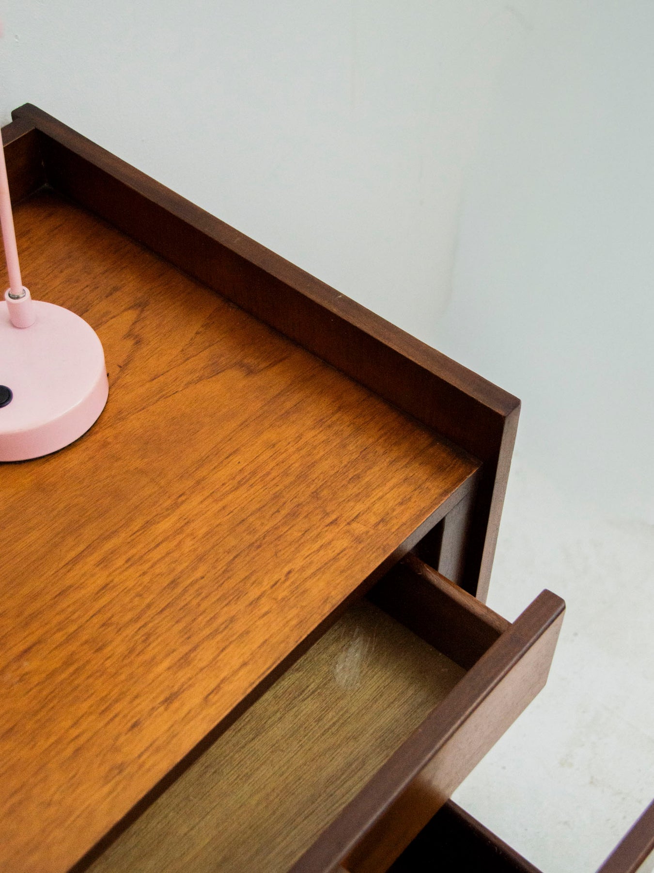 Bureau en teck foncé au profil fin, il apporte une silhouette chaleureuse et sobre à un intérieur contemporain. Le plateau, doté de rebords, offre une surface de travail généreuse pour un ordinateur et quelques documents, tout en protégeant les objets posés. Deux tiroirs pratiques, dont un très grand, permettent de ranger dossiers et fournitures en toute simplicité ; un tiroir peut se montrer légèrement grinçant. La structure légère et les lignes épurées invitent à une atmosphère apaisée, idéale pour un coin bureau ou un atelier d’écriture. Légères traces du temps qui participent à son charme.