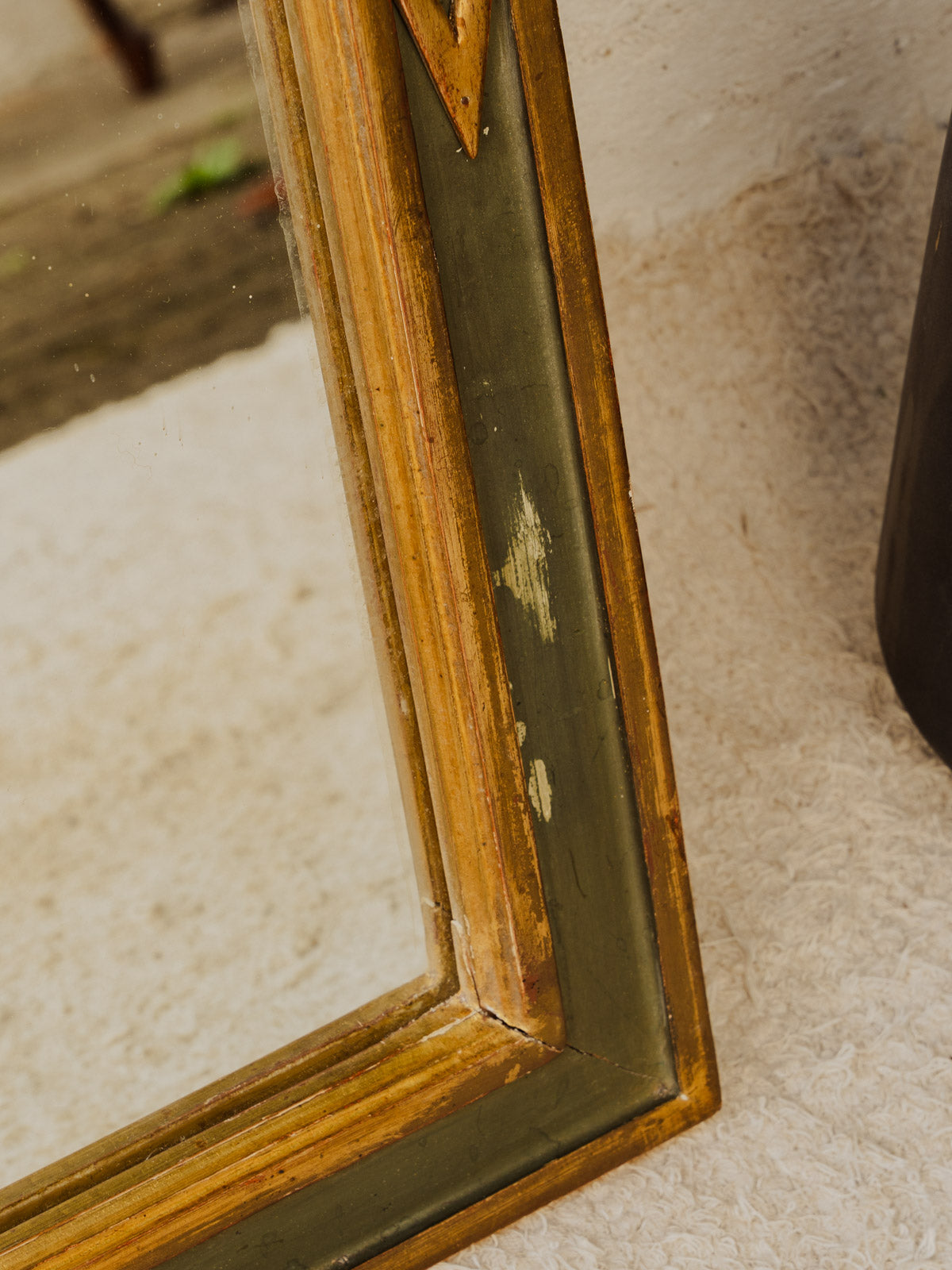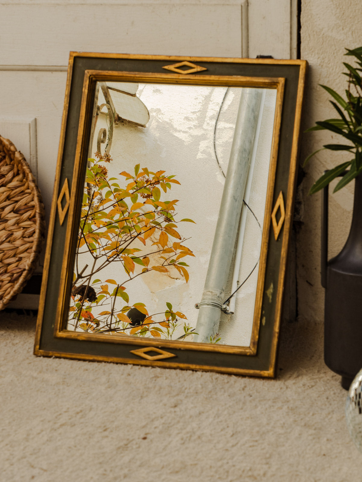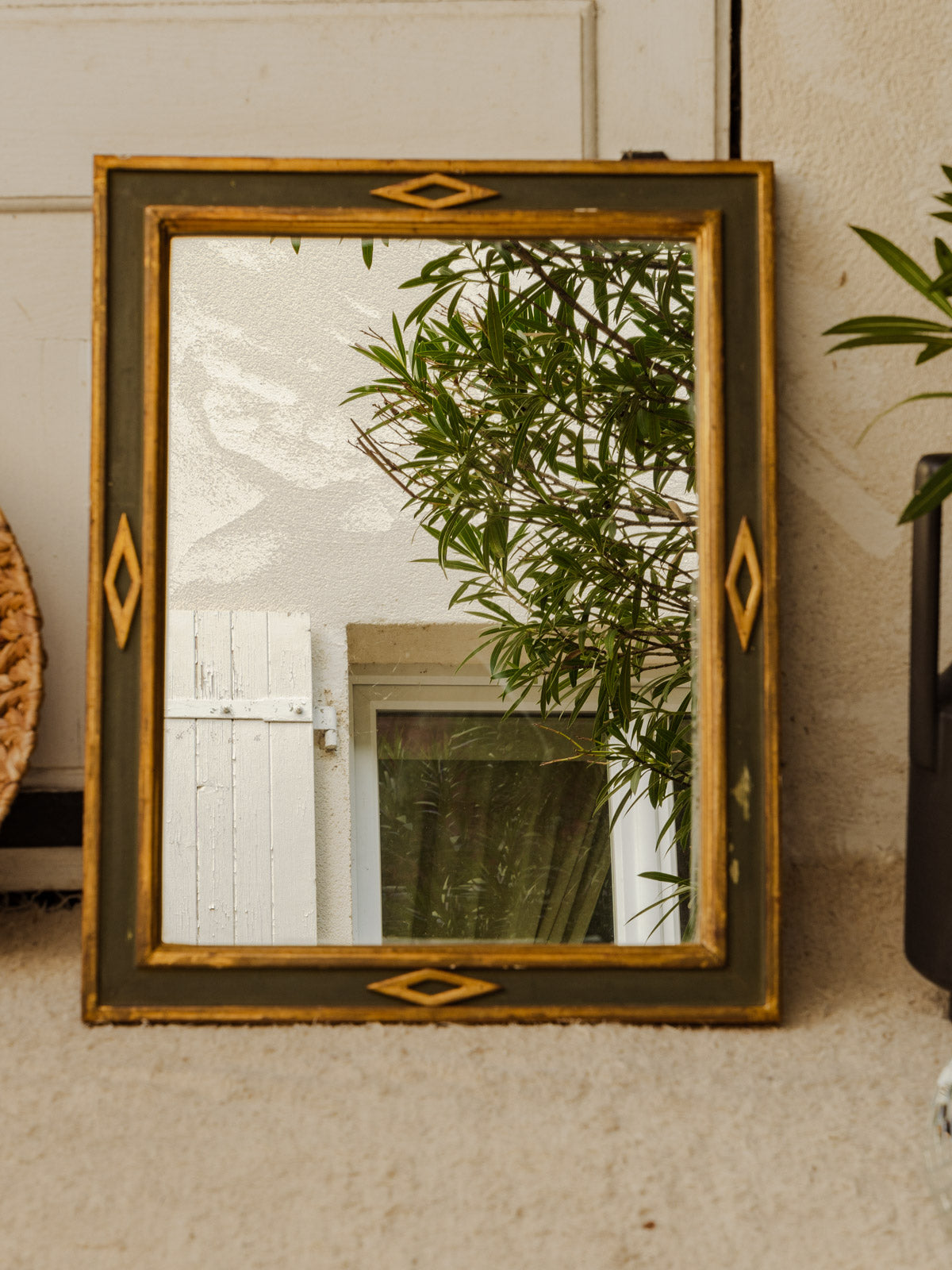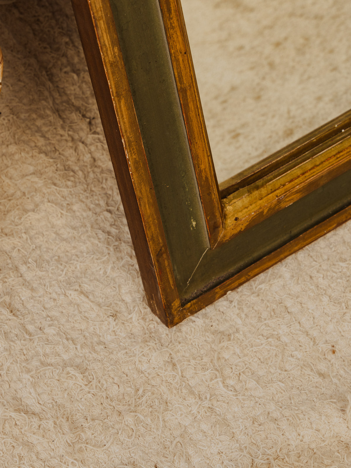 Ajoutez une touche d'élégance à votre intérieur avec ce miroir vert et doré, ancien en bois et plâtre. Son design raffiné et ses détails délicats témoignent d'un savoir-faire artisanal d'exception. Idéal pour embellir un salon ou une entrée, ce miroir apportera profondeur et luminosité à votre espace. Un véritable pièce de caractère qui allie charme vintage et sophistication. Quelques manques qui de matière qui n'enlèvent rien à son charme.