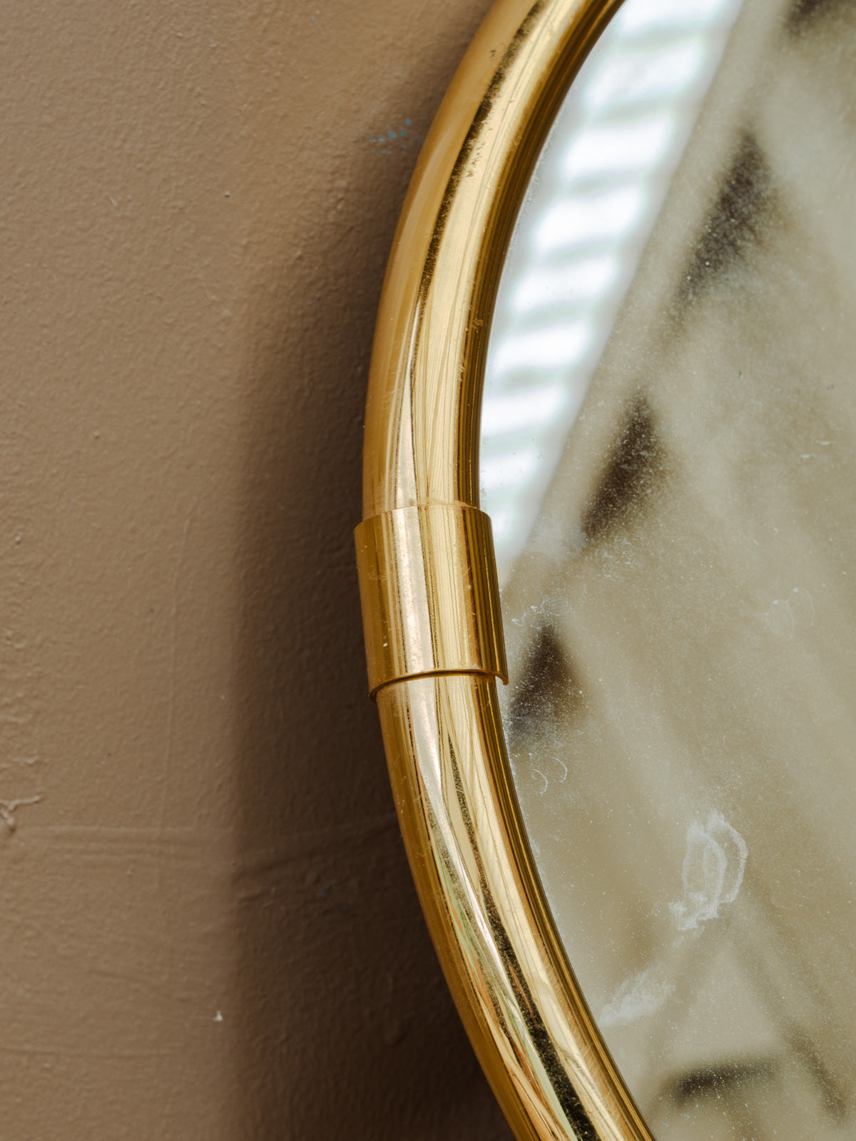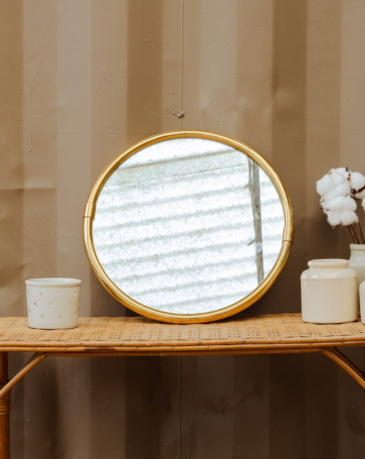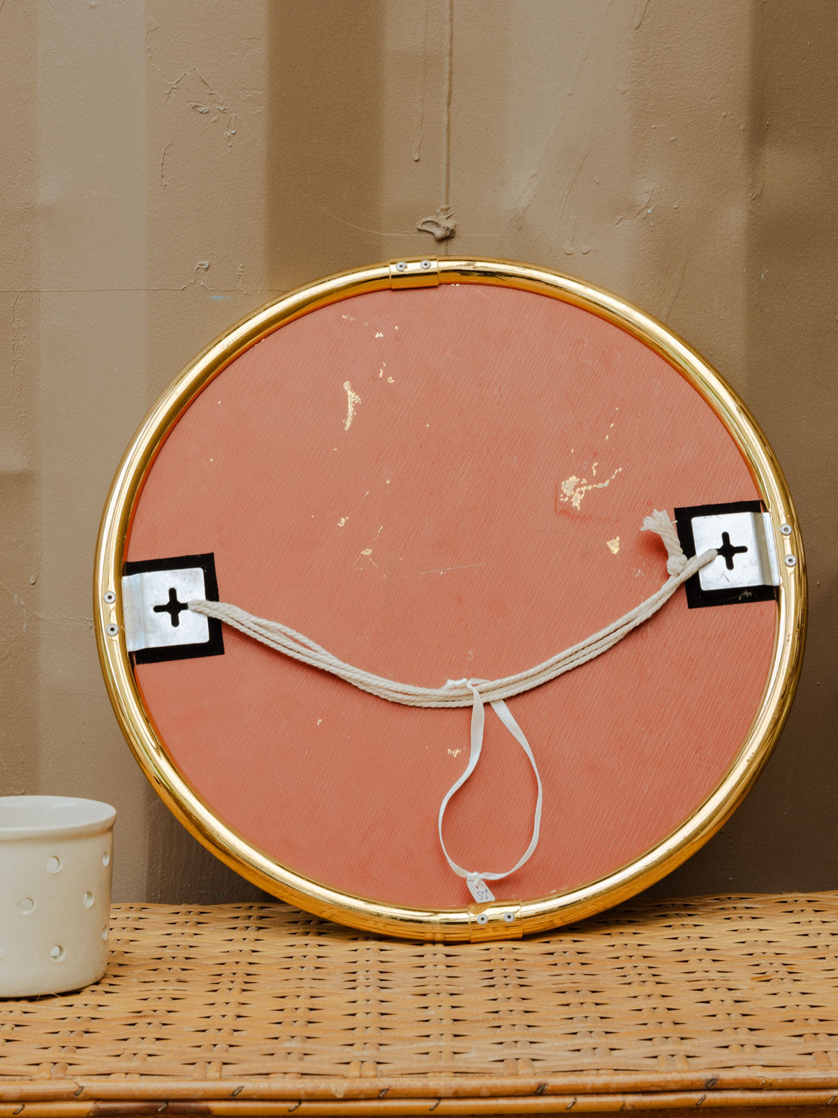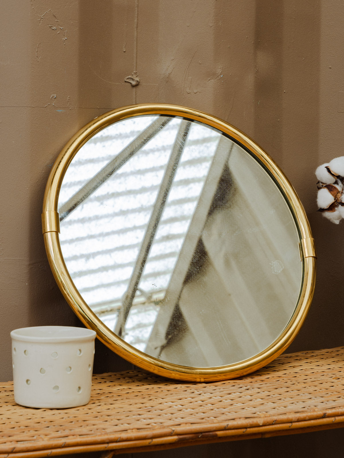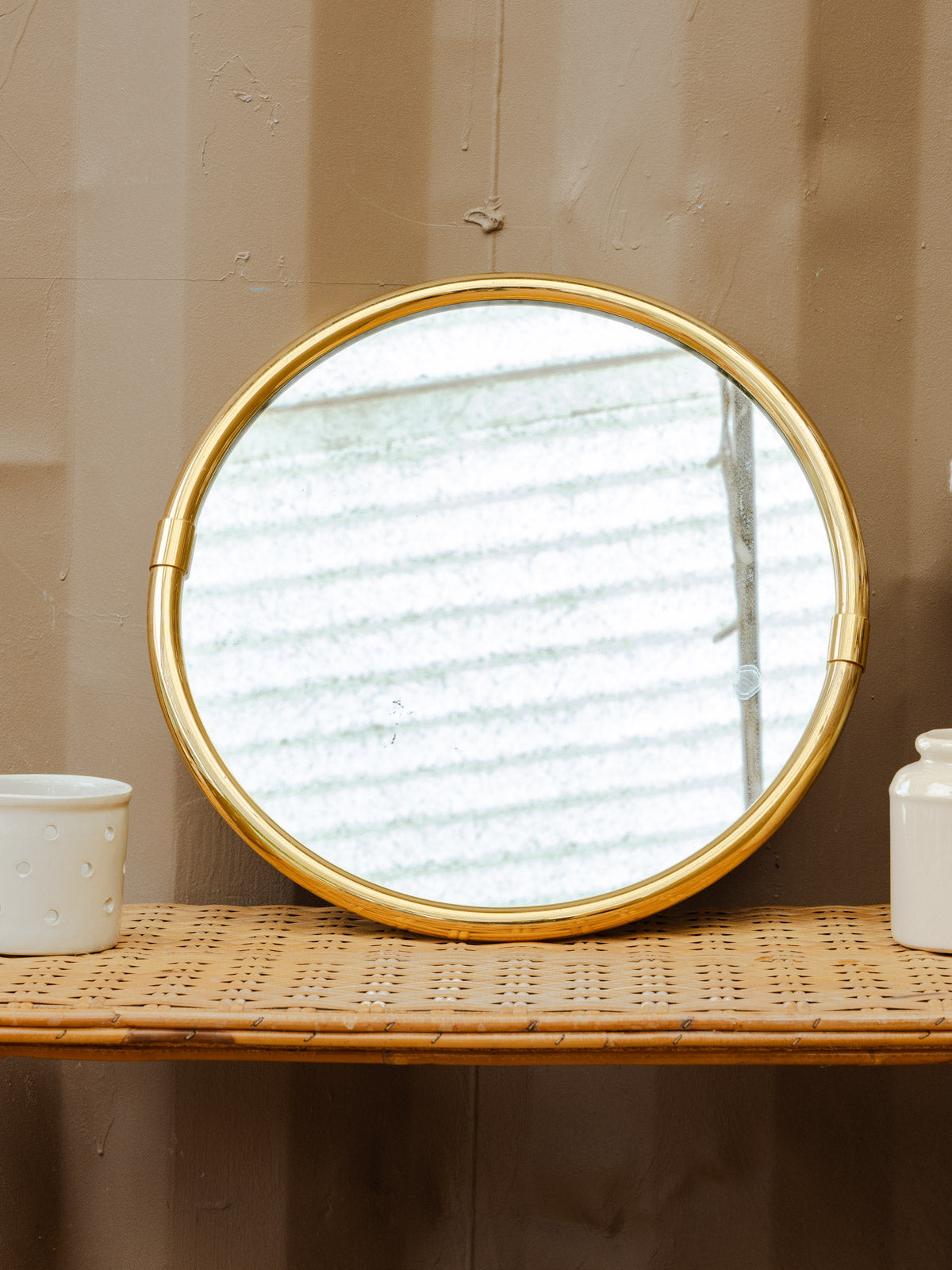 Découvrez ce miroir doré vintage des années 1980, fabriqué en laiton doré, qui apportera une touche d'élégance à votre intérieur. Son design intemporel et raffiné en fait un accessoire idéal pour sublimer votre décoration. Parfait pour créer un point focal dans votre salon ou votre chambre, ce miroir ne manquera pas d'ajouter de la luminosité et du style à n'importe quel espace. Ajoutez une note de charme rétro à votre maison avec cette pièce unique !