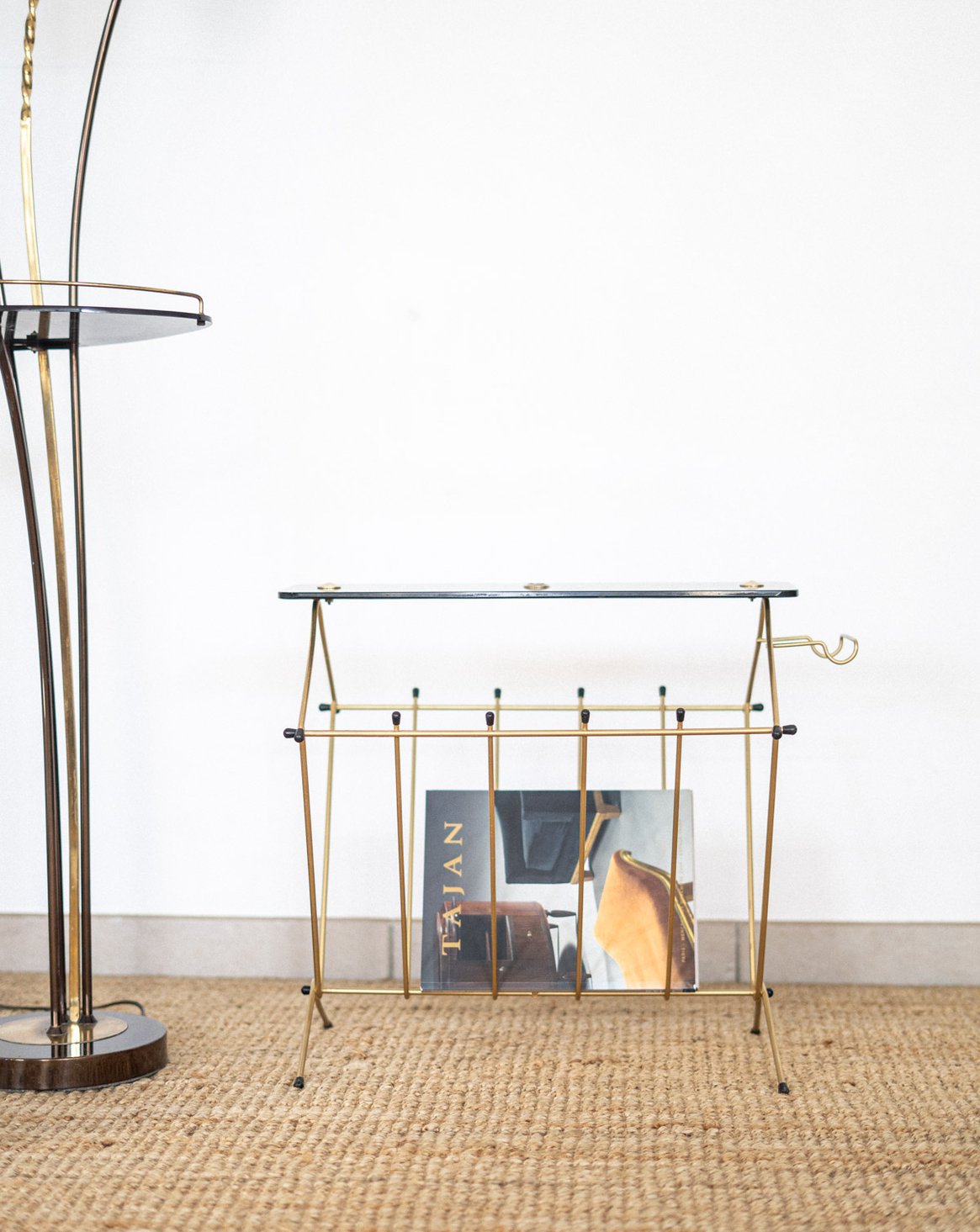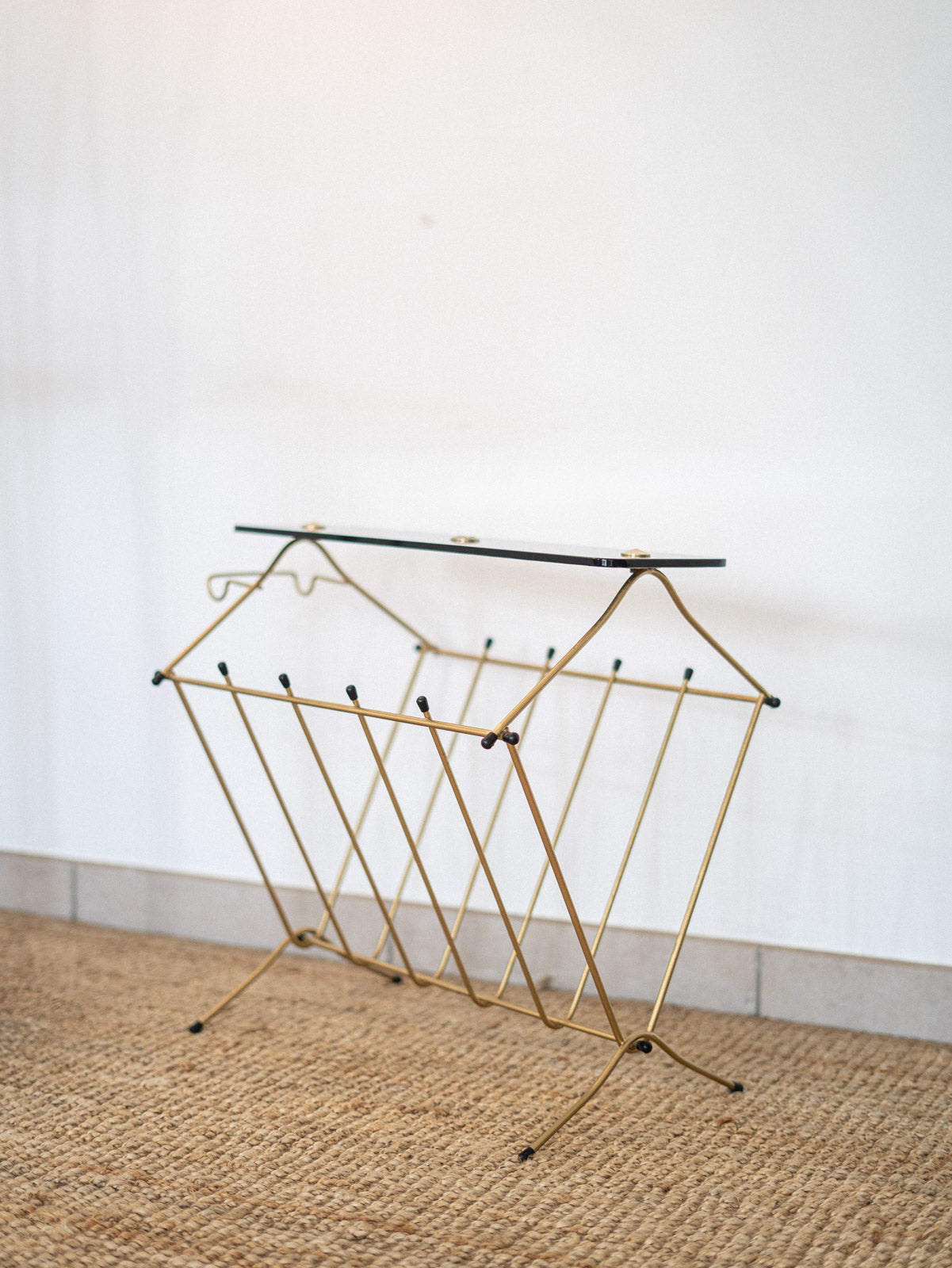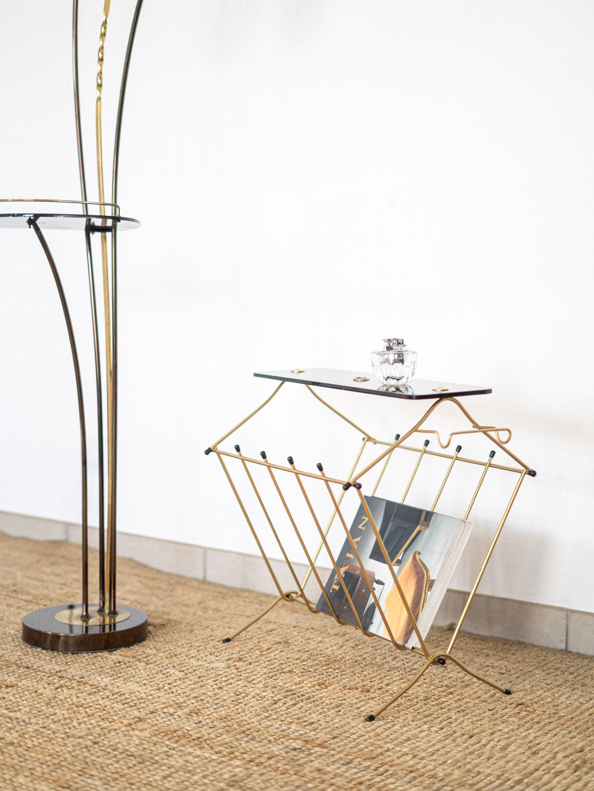 Ajoutez une touche de sophistication rétro à votre intérieur avec ce porte-revues des années 60. Sa structure en métal doré sublime une élégante tablette en verre noir, offrant un contraste chic et intemporel. Idéal pour organiser vos magazines tout en apportant du style à votre décoration, cet accessoire est à la fois pratique et esthétique. Un incontournable pour les amateurs de design vintage.