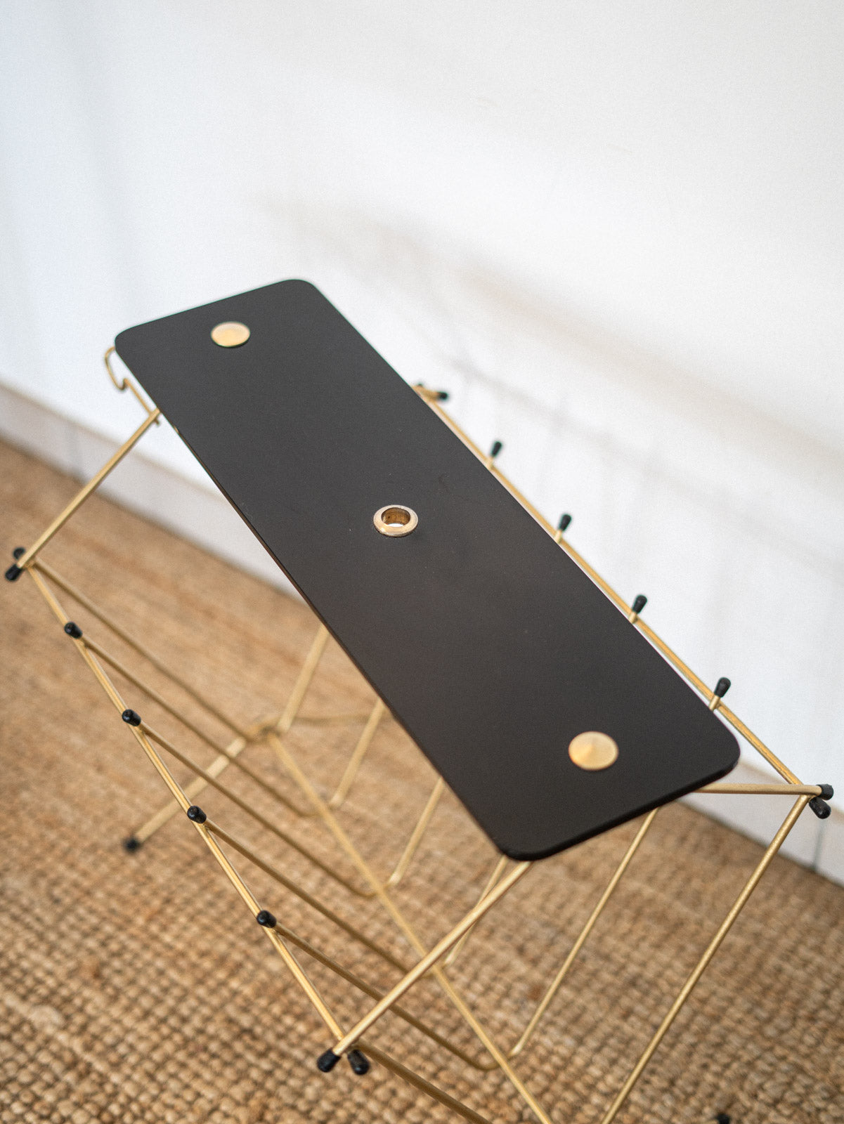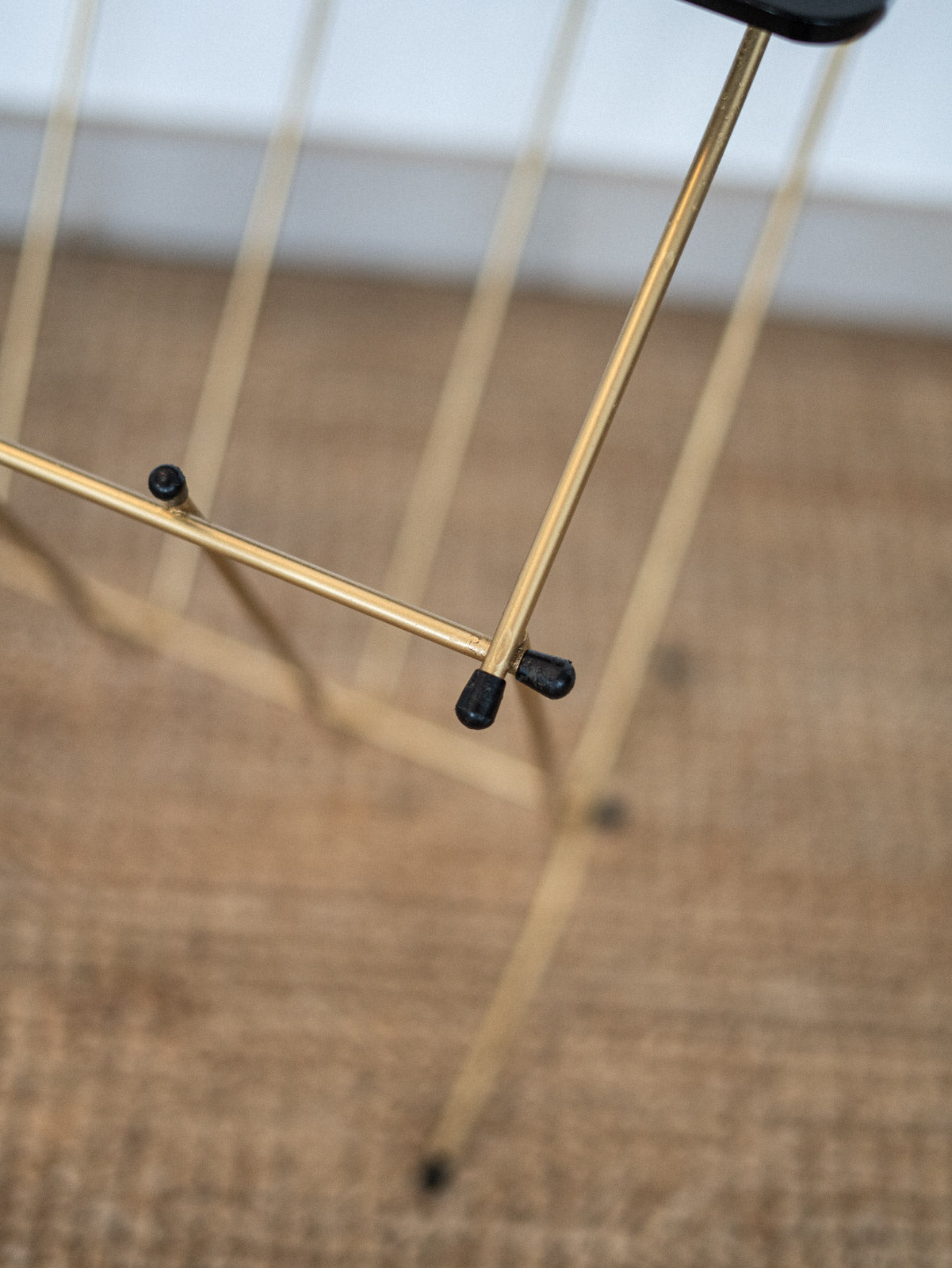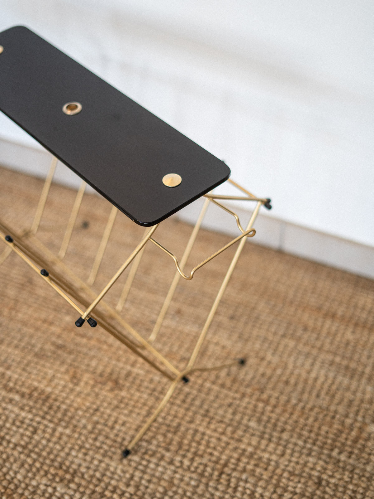 Ajoutez une touche de sophistication rétro à votre intérieur avec ce porte-revues des années 60. Sa structure en métal doré sublime une élégante tablette en verre noir, offrant un contraste chic et intemporel. Idéal pour organiser vos magazines tout en apportant du style à votre décoration, cet accessoire est à la fois pratique et esthétique. Un incontournable pour les amateurs de design vintage.