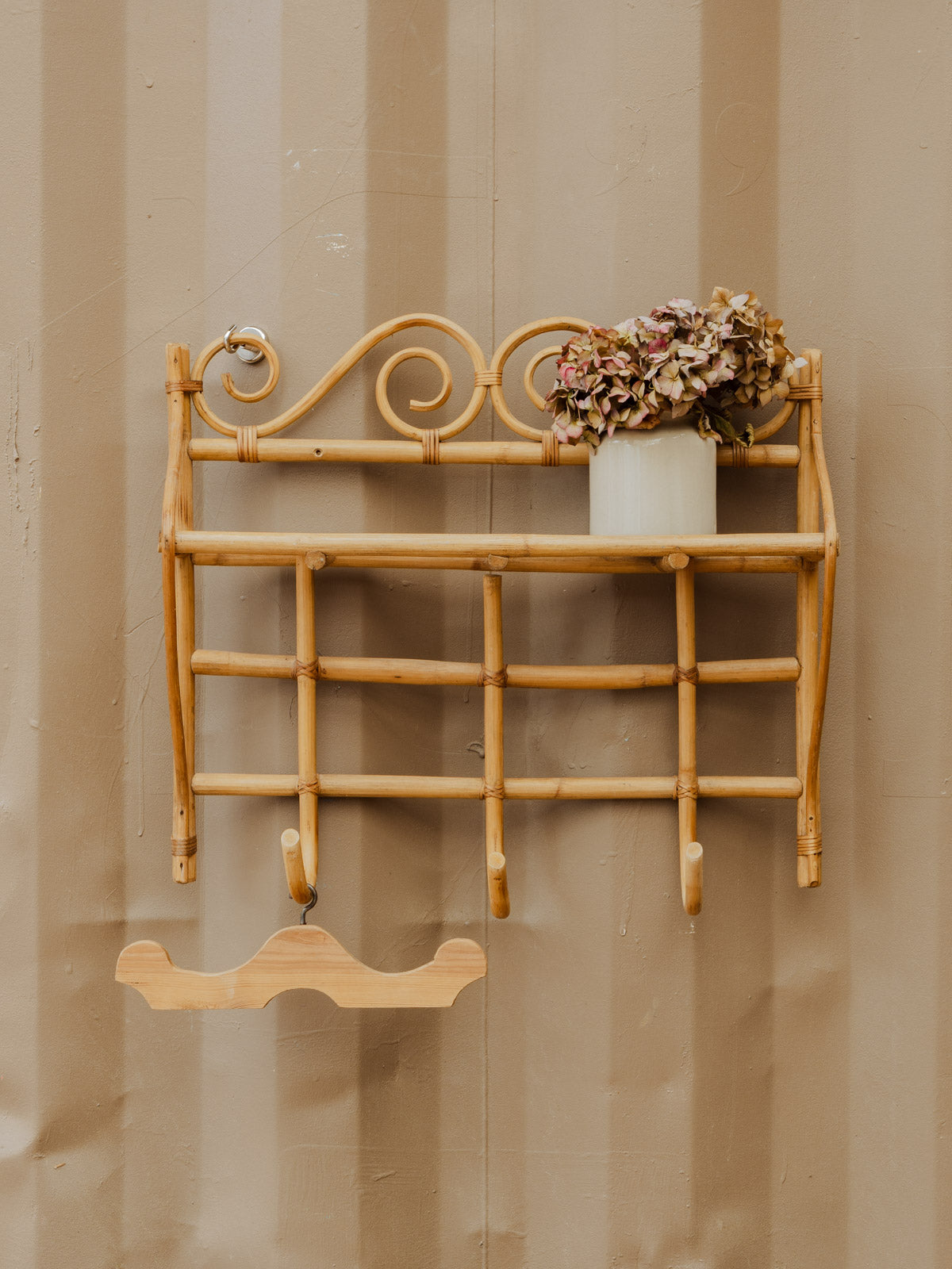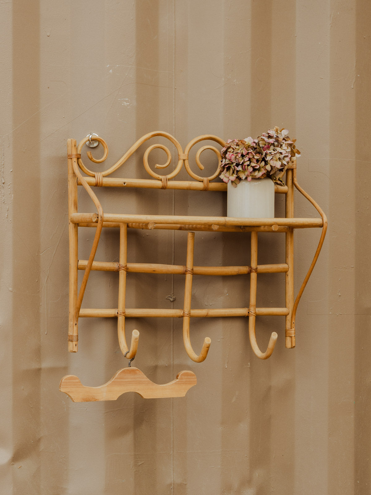 Ajoutez une touche vintage à votre intérieur avec notre élégante étagère en rotin, dotée de trois patères pratiques. Idéale pour organiser vos accessoires de manière esthétique, cette pièce allie charme et fonctionnalité. Son design délicat s’intègre parfaitement dans n'importe quel décor, tout en offrant un espace de rangement optimisé pour vos essentiels. Transformez votre entrée ou votre salon en un lieu accueillant et stylé grâce à cette étagère intemporelle.