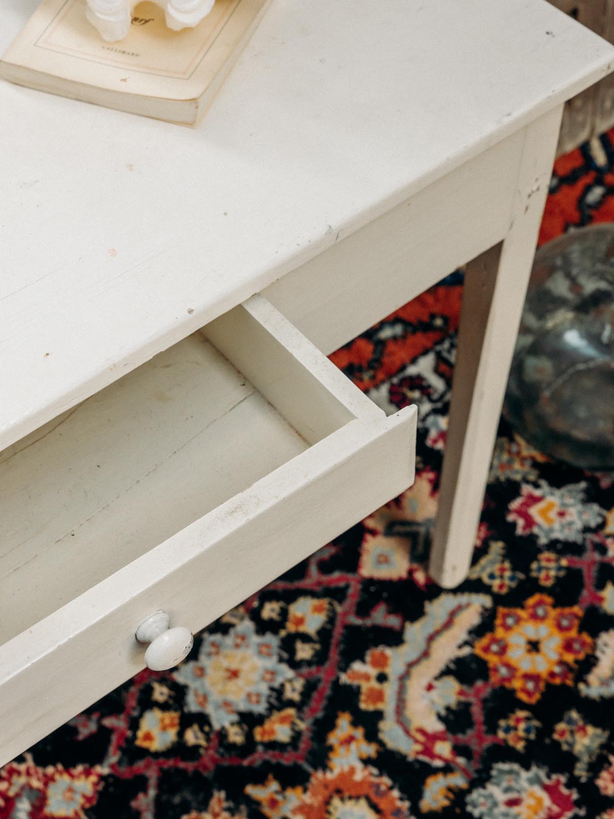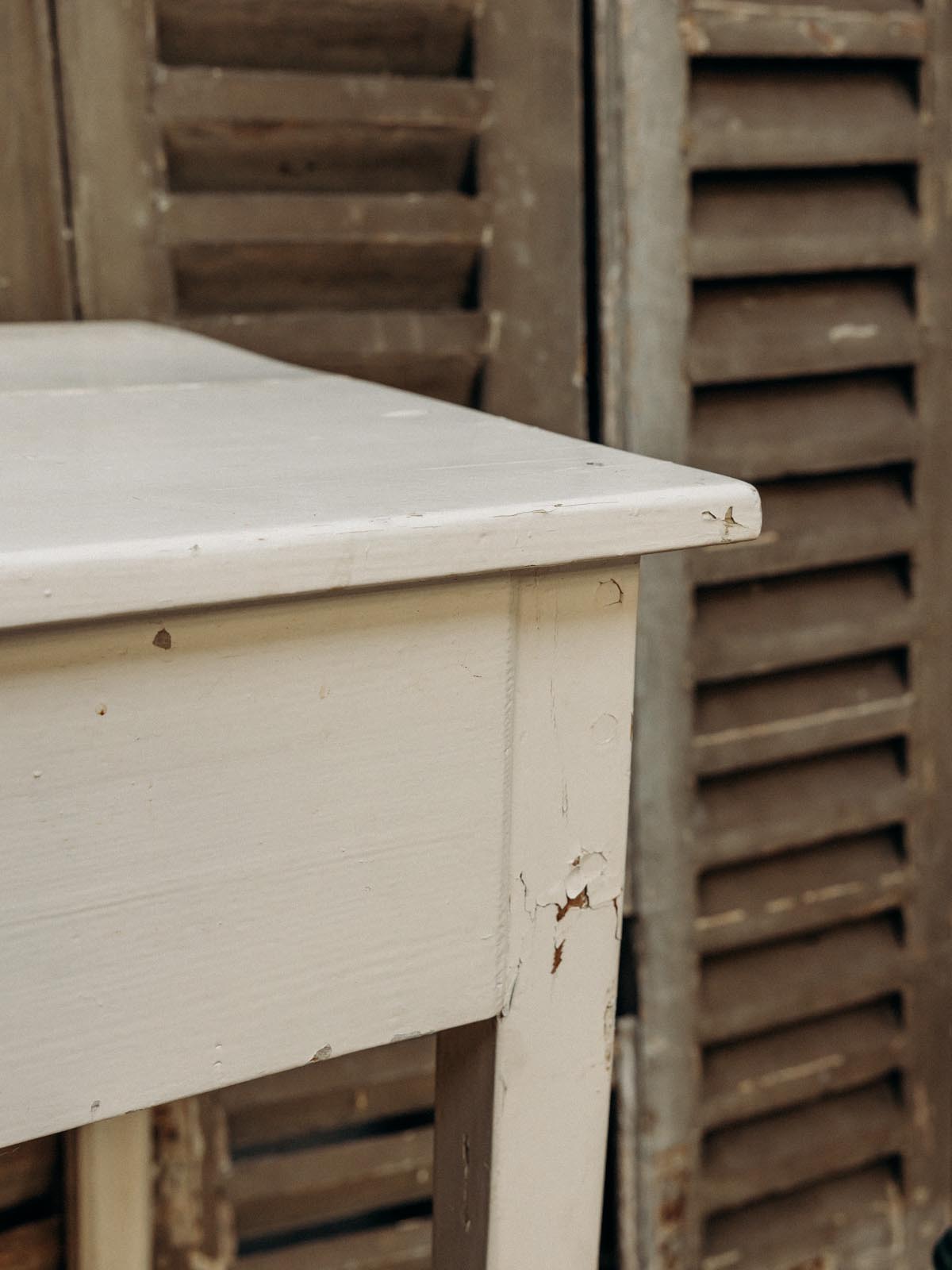 Découvrez notre petite table en bois peinte en blanc, alliant charme et praticité. Légère et facile à déplacer, elle s'adapte à tous les intérieurs et peut également servir de petit bureau. Dotée d'une poignée ronde et d'un tiroir spacieux, elle offre un espace de rangement supplémentaire tout en faisant ressortir son caractère unique avec ses légères usures. Un meuble idéal pour apporter une touche d'élégance à votre décoration.