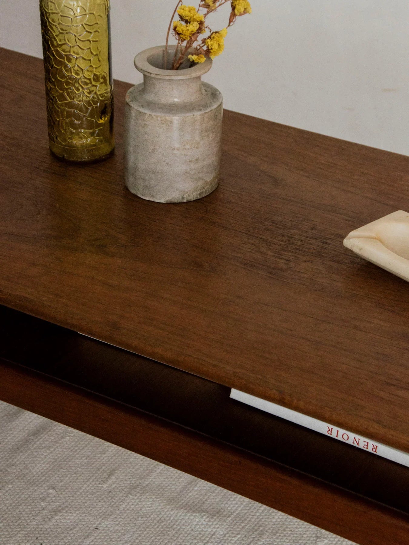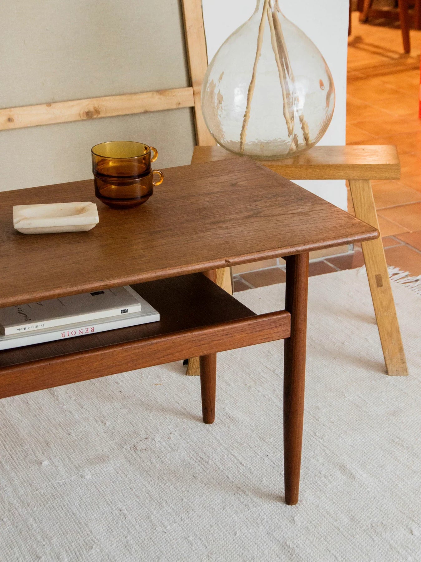 Découvrez cette table basse scandinave en teck massif, emblématique du design danois des années 60. Avec ses lignes sobres et ses angles adoucis, elle apporte une touche d'élégance à votre intérieur. Son plateau inférieur est parfait pour accueillir livres, magazines et objets du quotidien, ajoutant une fonctionnalité appréciable à sa beauté esthétique. En très bel état général, son plateau supérieur présente quelques traces légères d’usage qui n'altèrent en rien la chaleur de sa patine. Une pièce centrale qui évoque le style de Johannes Andersen tout en conservant la simplicité propre à Grete Jalk.
