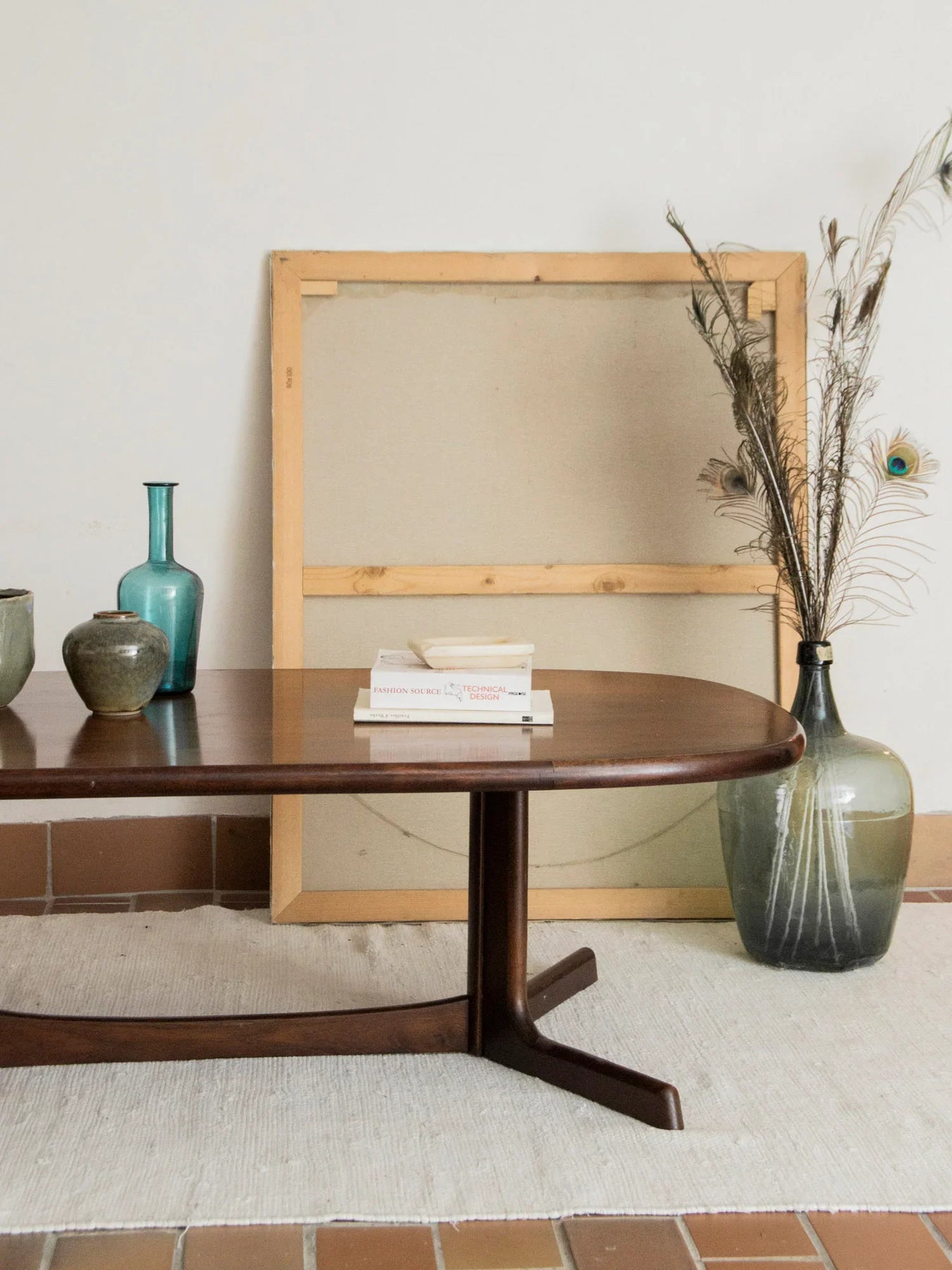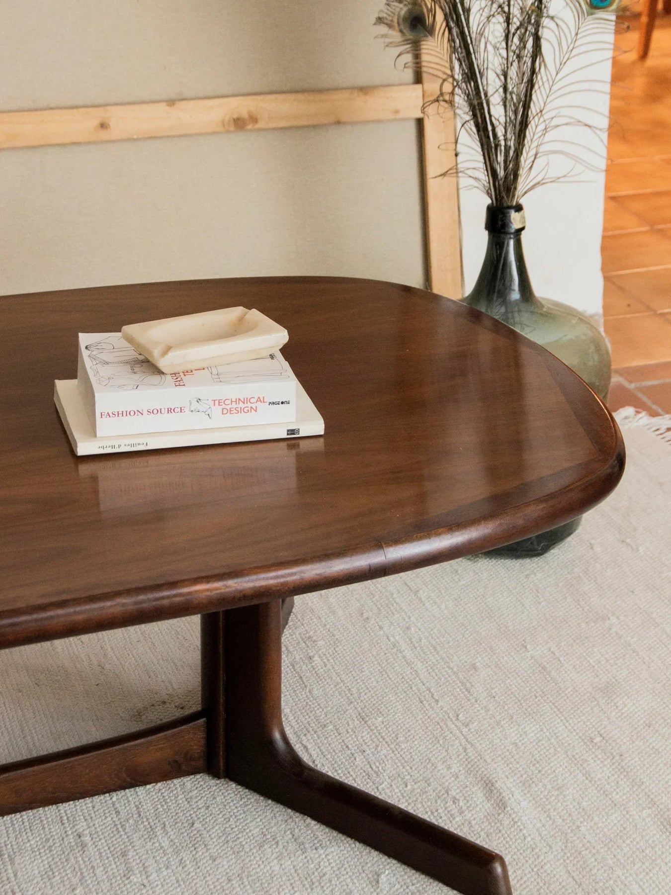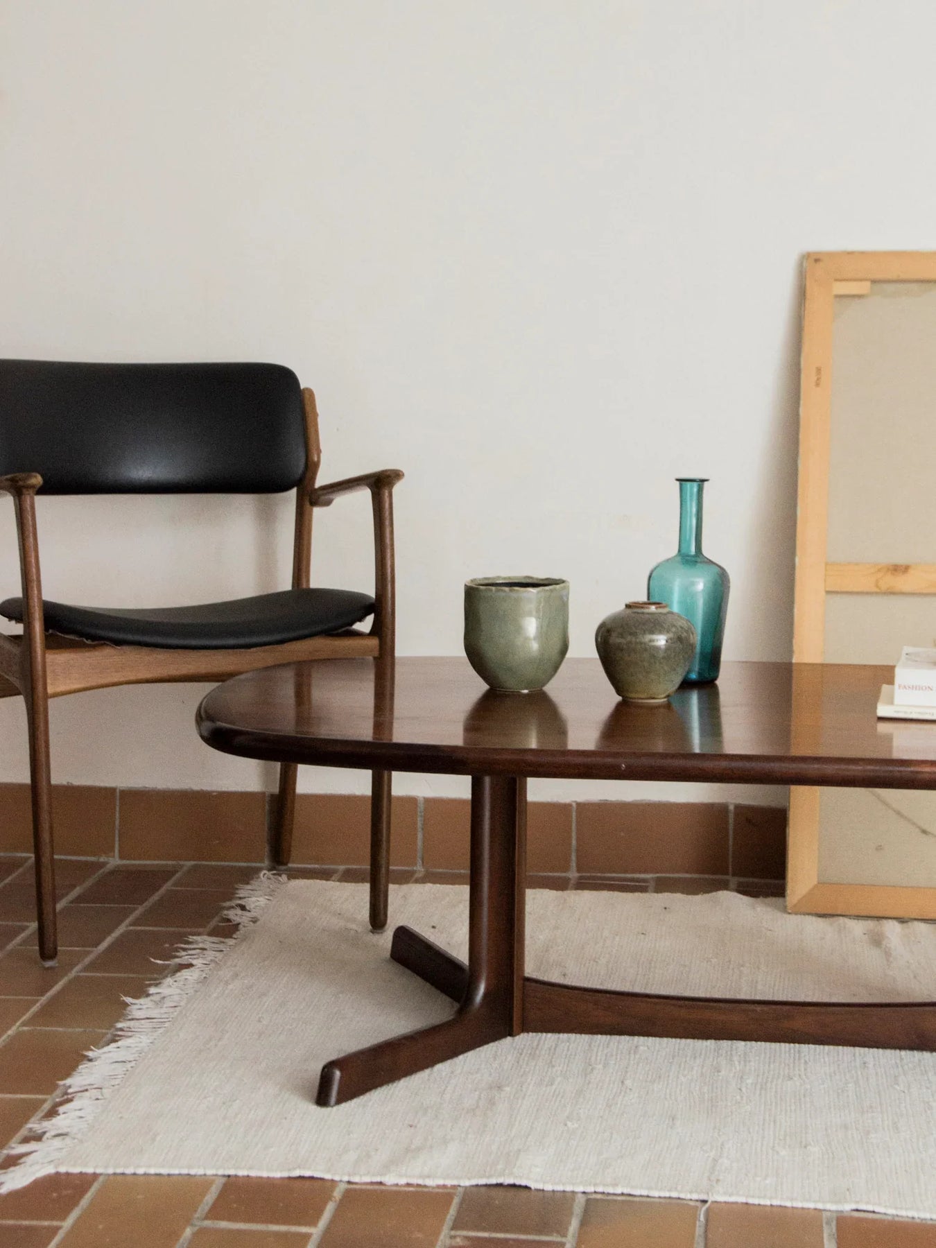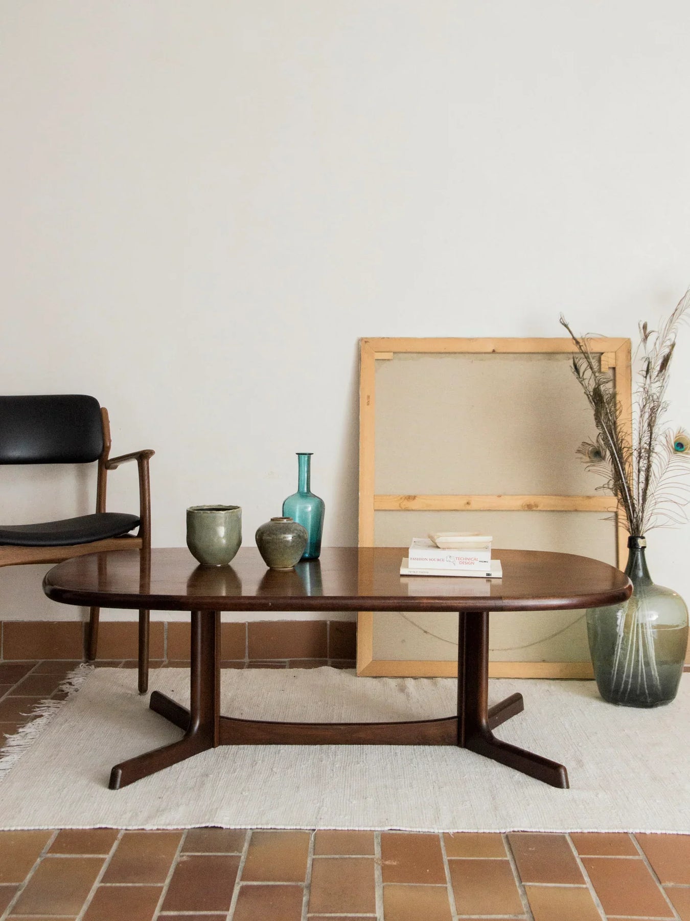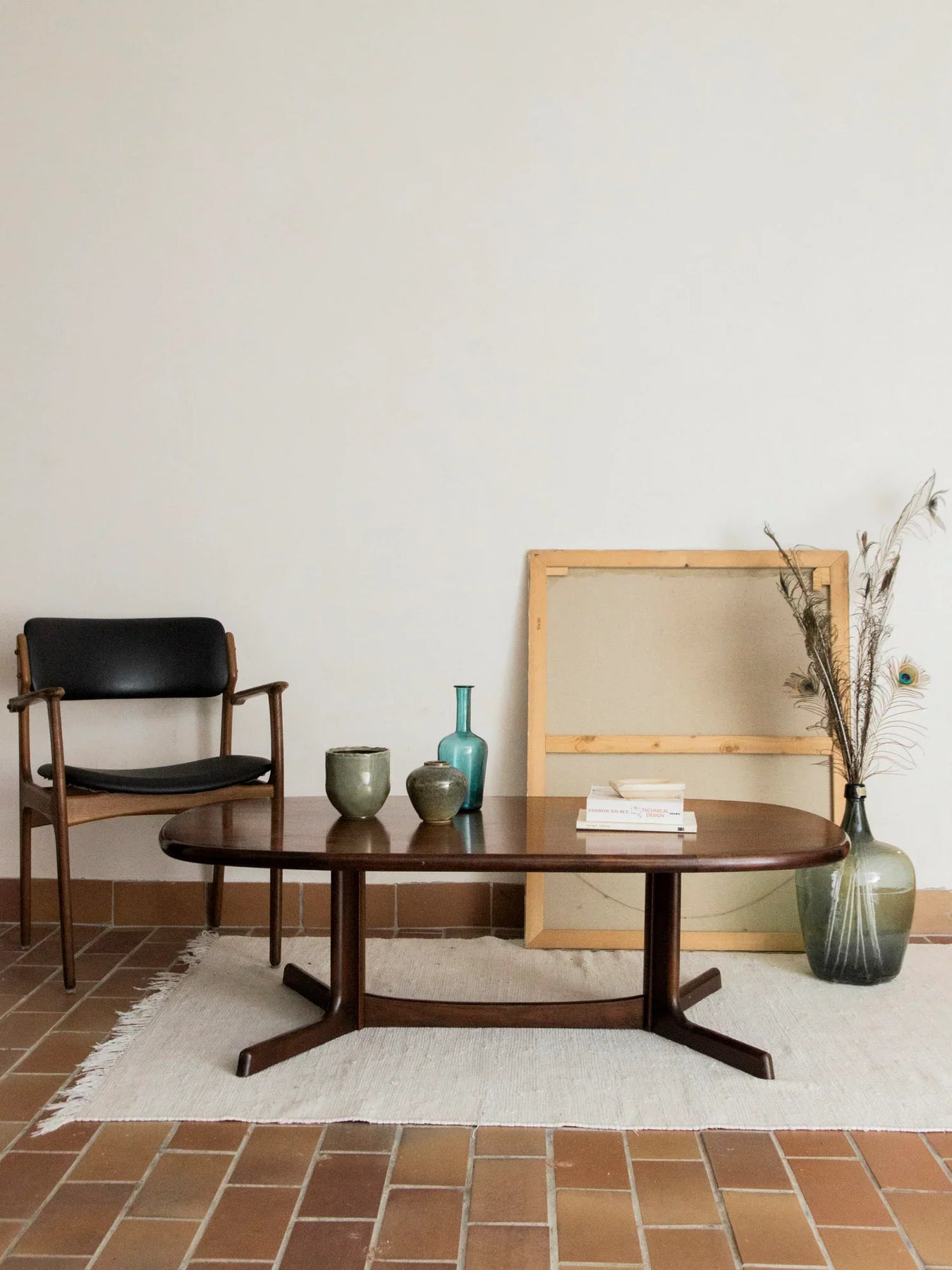 Découvrez notre table basse scandinave au plateau ovale en noyer foncé, un véritable hommage au design danois des années 60. Son piètement central croisé apporte une touche d'élégance tout en garantissant une stabilité remarquable. Le plateau, subtilement veiné, et son design épuré en font une pièce chaleureuse qui s'intègre harmonieusement dans tout salon. En très bon état général, avec une patine homogène et quelques légères traces d’usage, cette table basse allie fonctionnalité et esthétique pour un intérieur chic et raffiné.